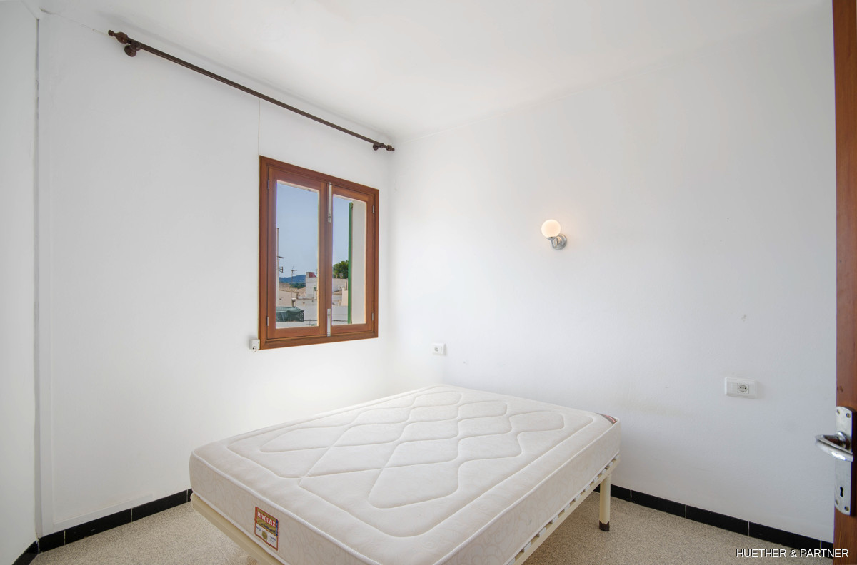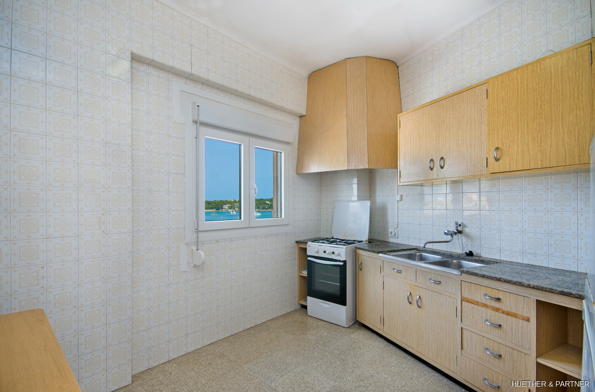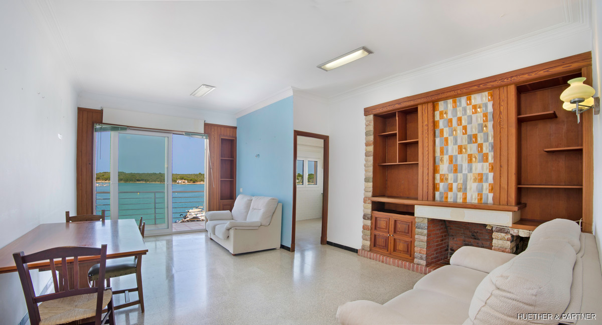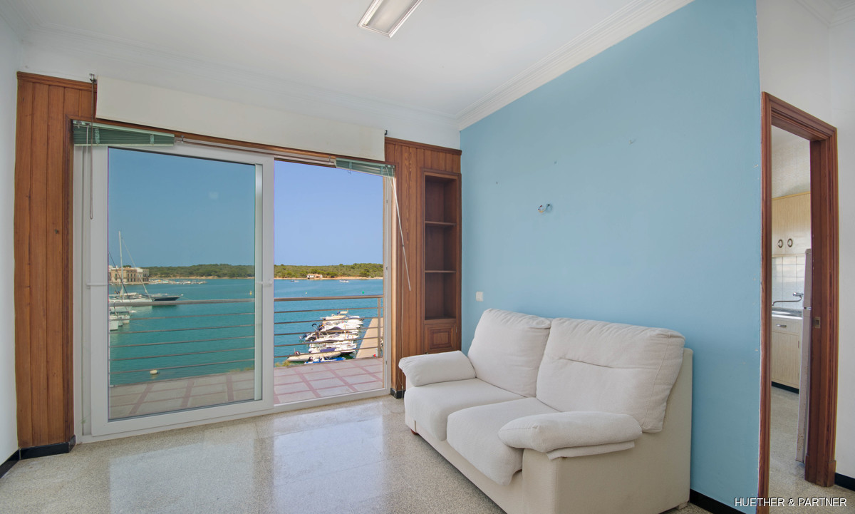 This 110 sqm apartment, located on the first sea line in Portocolom, offers a remarkable opportunity for renovation. The living and dining area features a balcony with views of the harbor, Sa Punta peninsula, and the old town. The apartment includes three bedrooms, a bathroom, a separate WC, and a kitchen with a sea view. A charming old fireplace adds character, and theres a spacious storage room. The communal rooftop terrace has a utility room and space for a washing machine. Although the apartment requires renovation, plans for remodeling are available, allowing for potential layout changes.