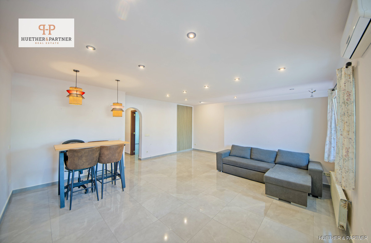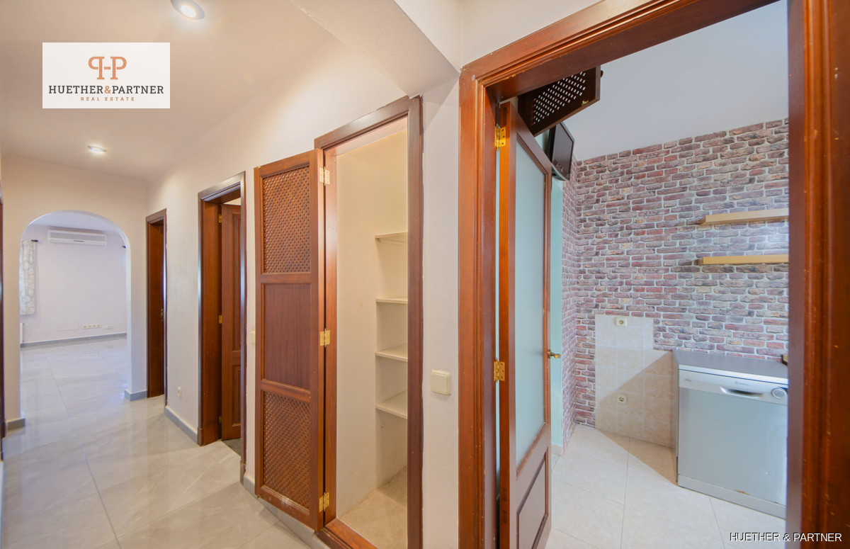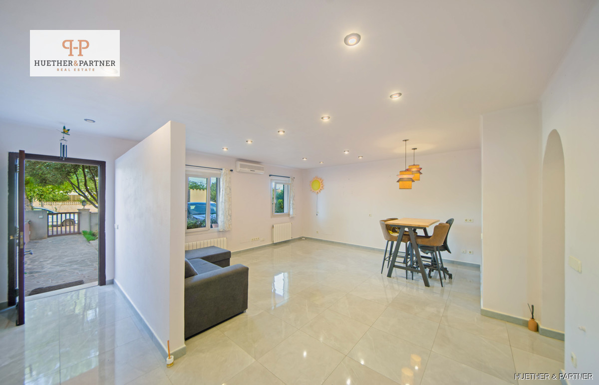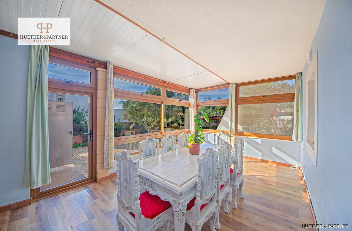 This spacious ground floor apartment in Portocolom offers 132 square meters of living space, ideal for creating a unique home. It features two bedrooms, two renovated bathrooms, and a living/dining area that is visually separated from the entrance. A significant enhancement is the glazed rear terrace, now serving as a dining area adjacent to the kitchen. The property includes a private parking space of 54 square meters in front and a 209 square meter private area at the back, currently equipped with a pergola and outdoor kitchen. Ample room for customization remains, with recent upgrades like new tiling providing a fresh start.