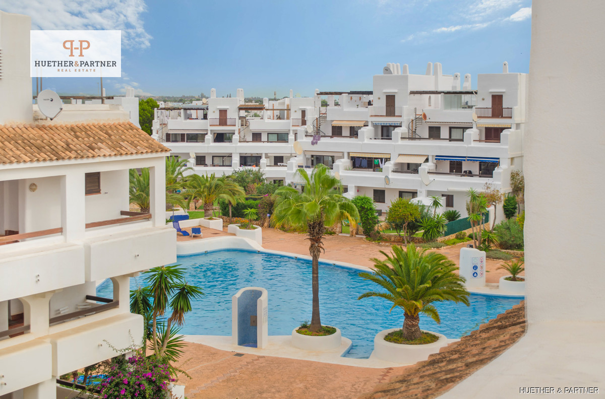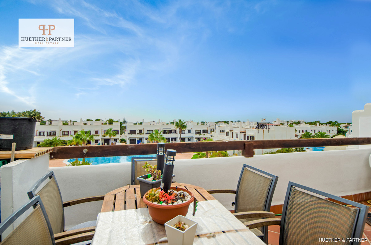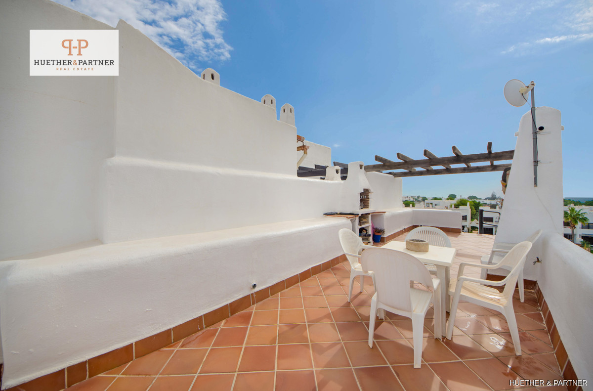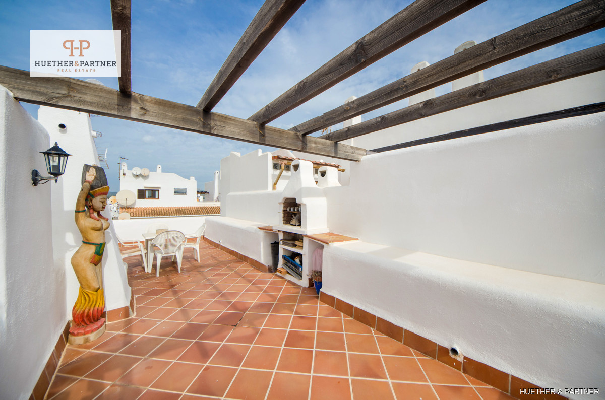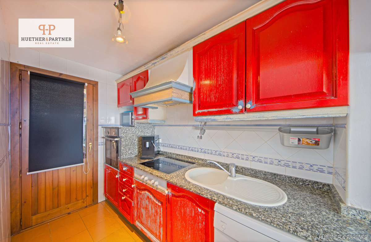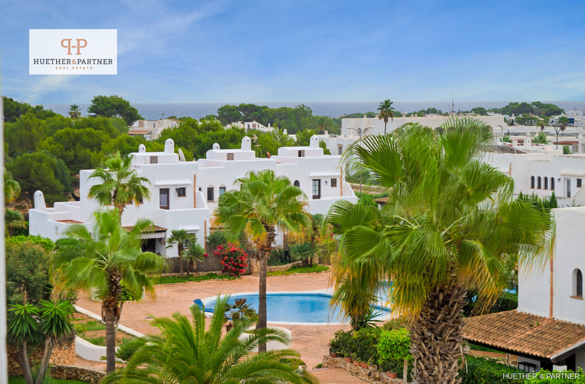 Built in 2004, the apartment complex boasts white facades and dark wooden beams typical of Cala D Ors regional style. The living space includes an entrance hall, an open-concept kitchen with a serving hatch, two bedrooms with built-in wardrobes, and a bathroom with a bathtub. The balcony terrace connects to the living room and offers a view of the pool area. A spiral staircase leads to the rooftop terrace, where you can spot the sea on clear days.