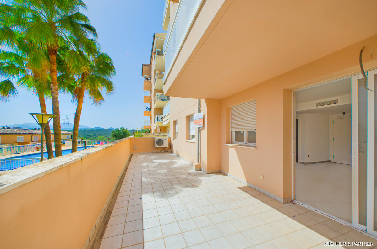 The apartment remains unfurnished, awaiting its first occupancy by the buyer. Climate control is available but not yet connected. Residents can enjoy a communal pool within the complex, which is secure and not accessible from the outside.