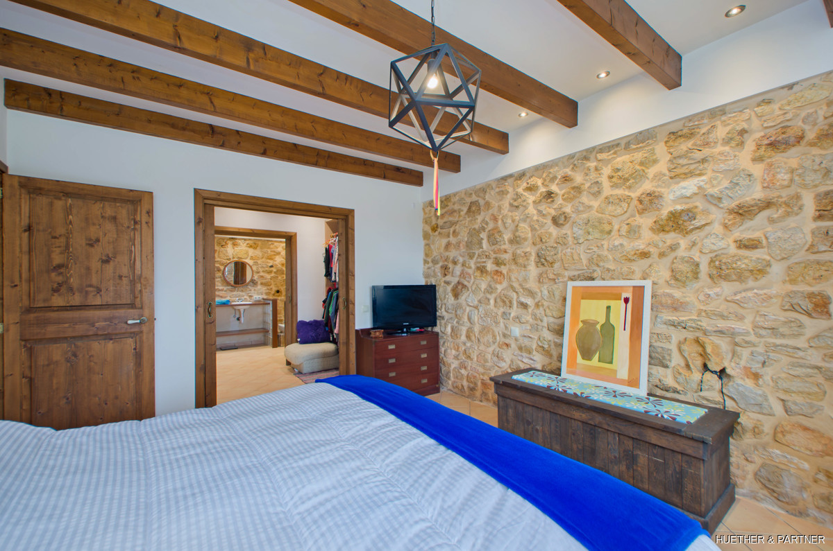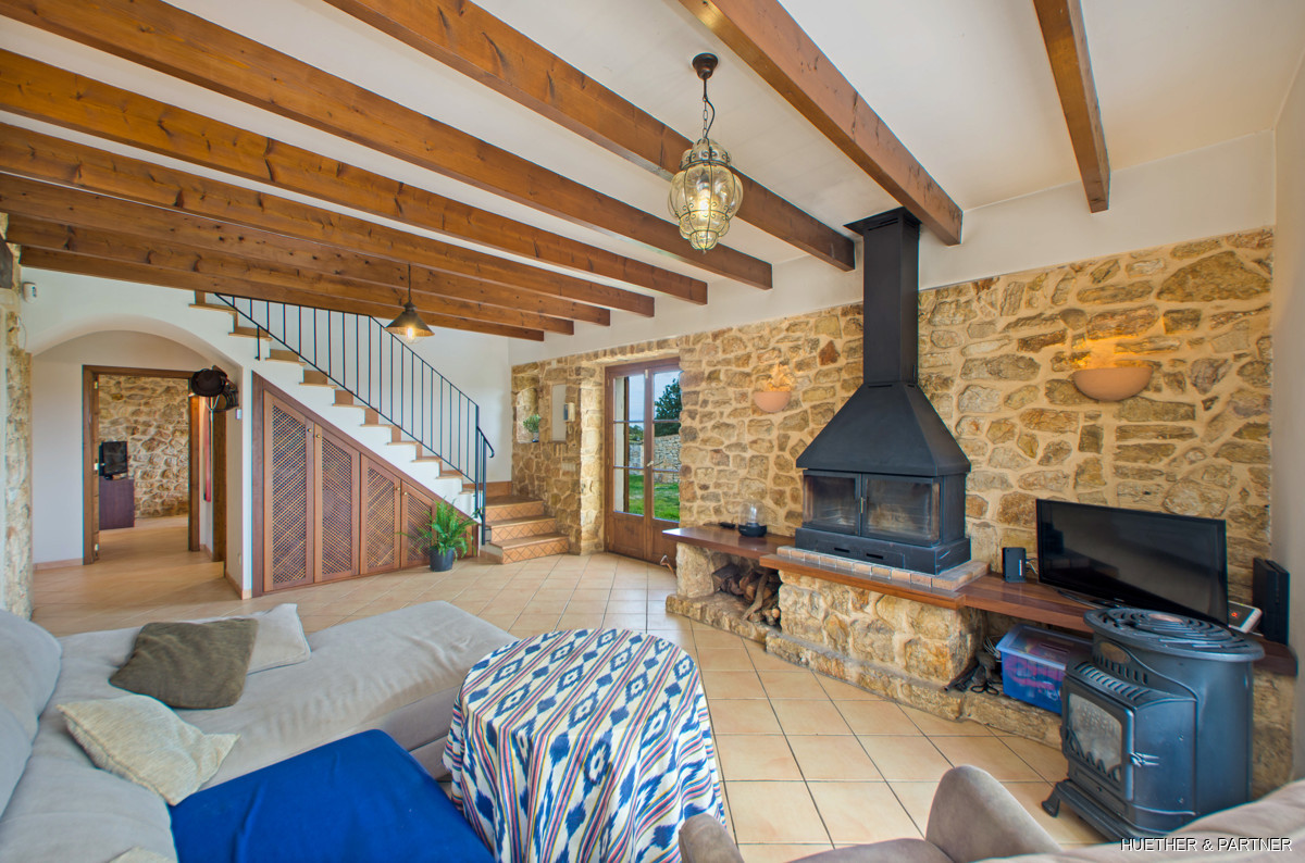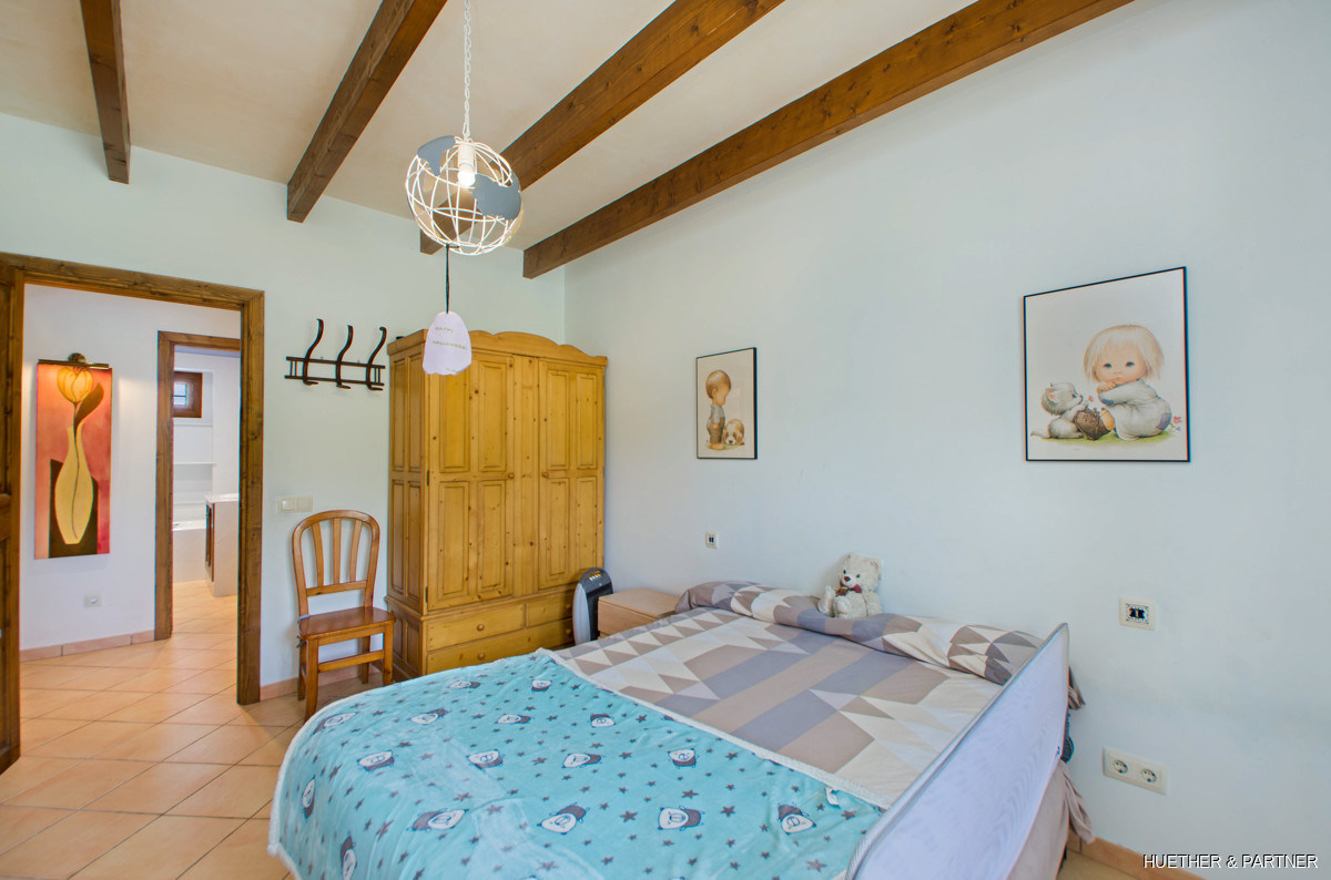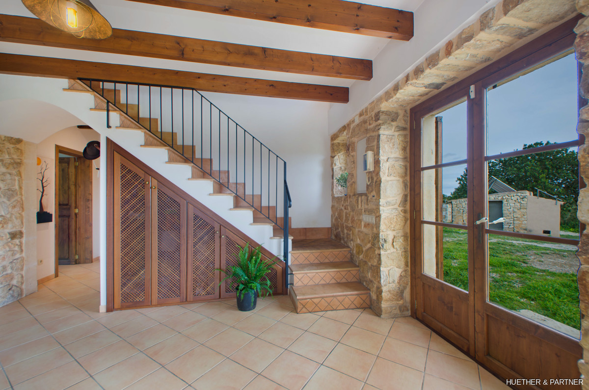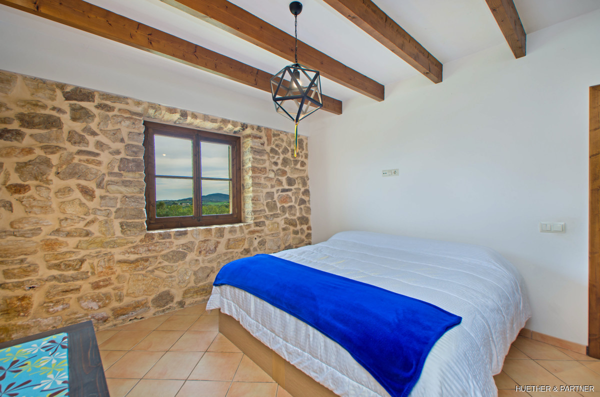 This charming finca, nestled in the tranquil hills surrounding Sant Llorenç, offers a perfect blend of historic charm and modern amenities. Originally built in 1900 and lovingly renovated in 2006, the property features a stone facade and traditional Mallorcan elements such as wooden beam ceilings and tile floors. The ground floor is move-in ready, boasting a sunlit living area with panoramic views, a cozy fireplace, and an open-plan dining room and kitchen equipped with a 5-burner gas stove and a spacious oven. The master bedroom comes with an en suite bath and walk-in closet.