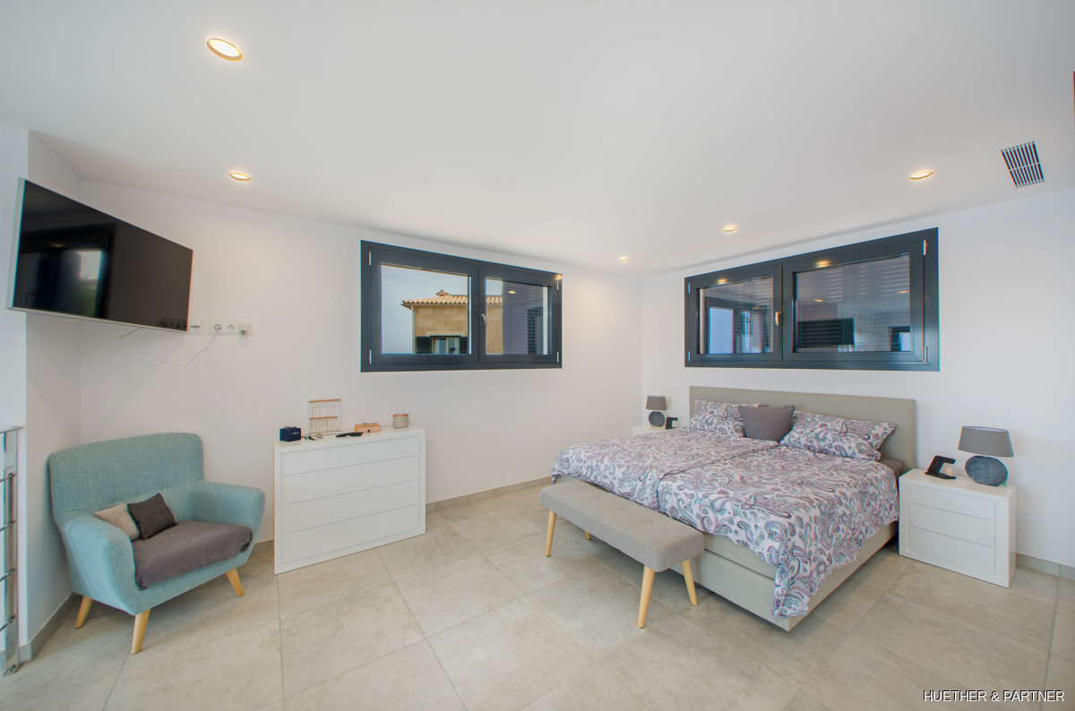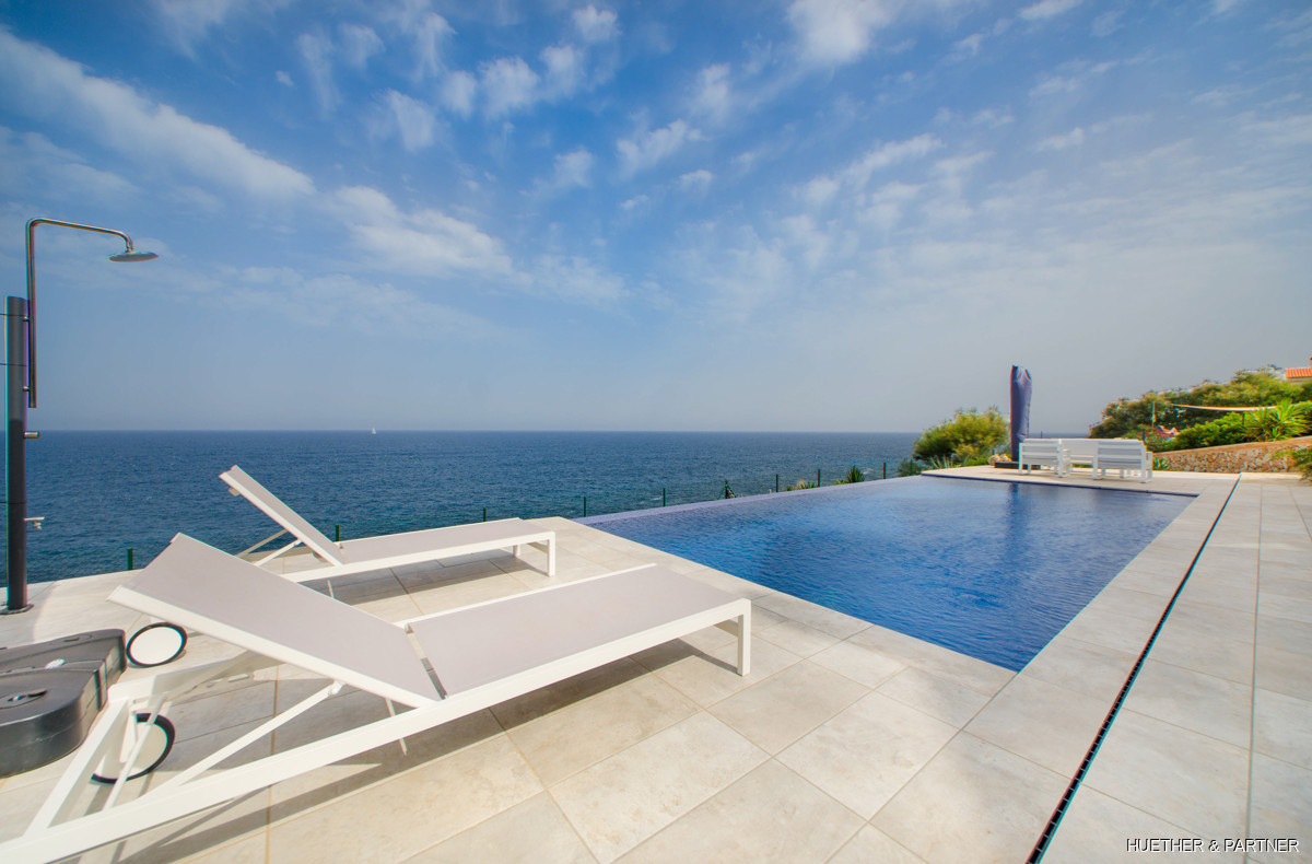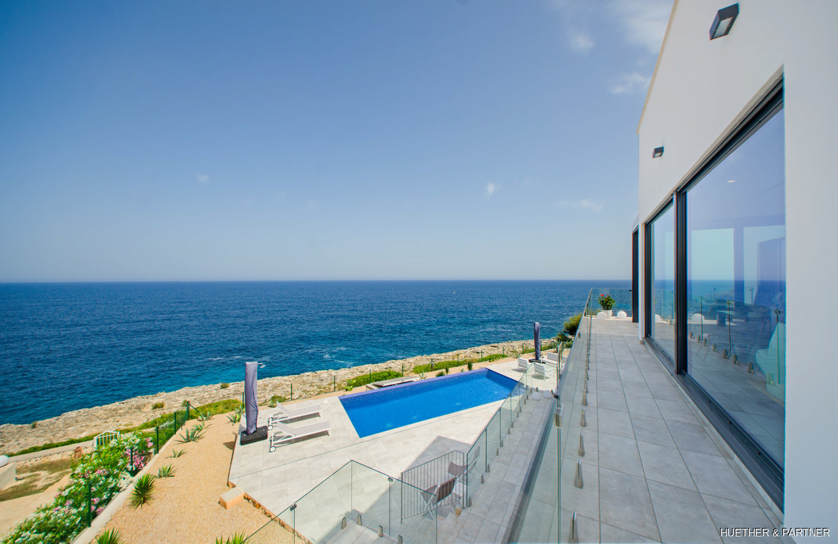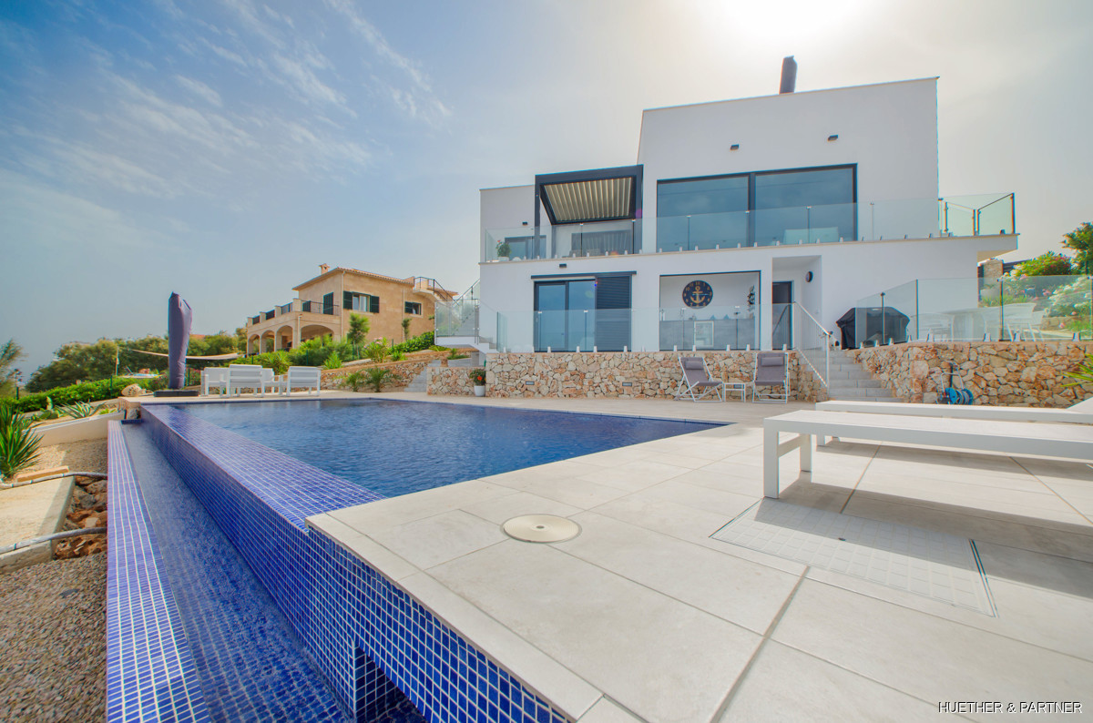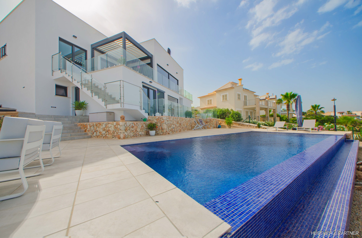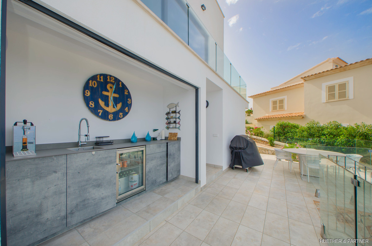 - ✓ - Modern Bauhaus-style architecture - Renovated in 2022 - 324 m² living area - Main residence and guest apartment - Open-plan living/dining area - High-end kitchen - Panoramic sea views - Master suite with workspace - Three bathrooms - Two guest WCs - Convertible laundry room - Separate guest apartment entrance - Infinity saltwater pool - Outdoor kitchen - Rooftop terrace with panoramic views - Terraced garden with stone sculptures - Two parking spaces - Solar-heated water - Heat pump heating - High-quality SCHÜCO windows - Aluminum shutters - Close to Cala Murada beach - Quiet residential area - Proximity to local amenities