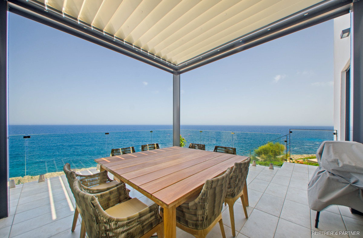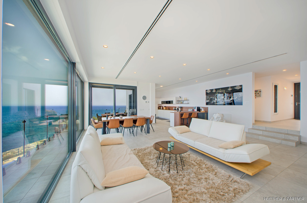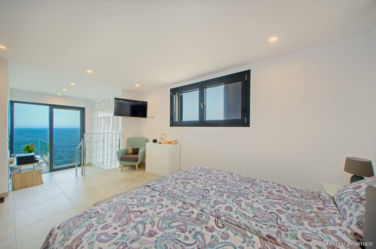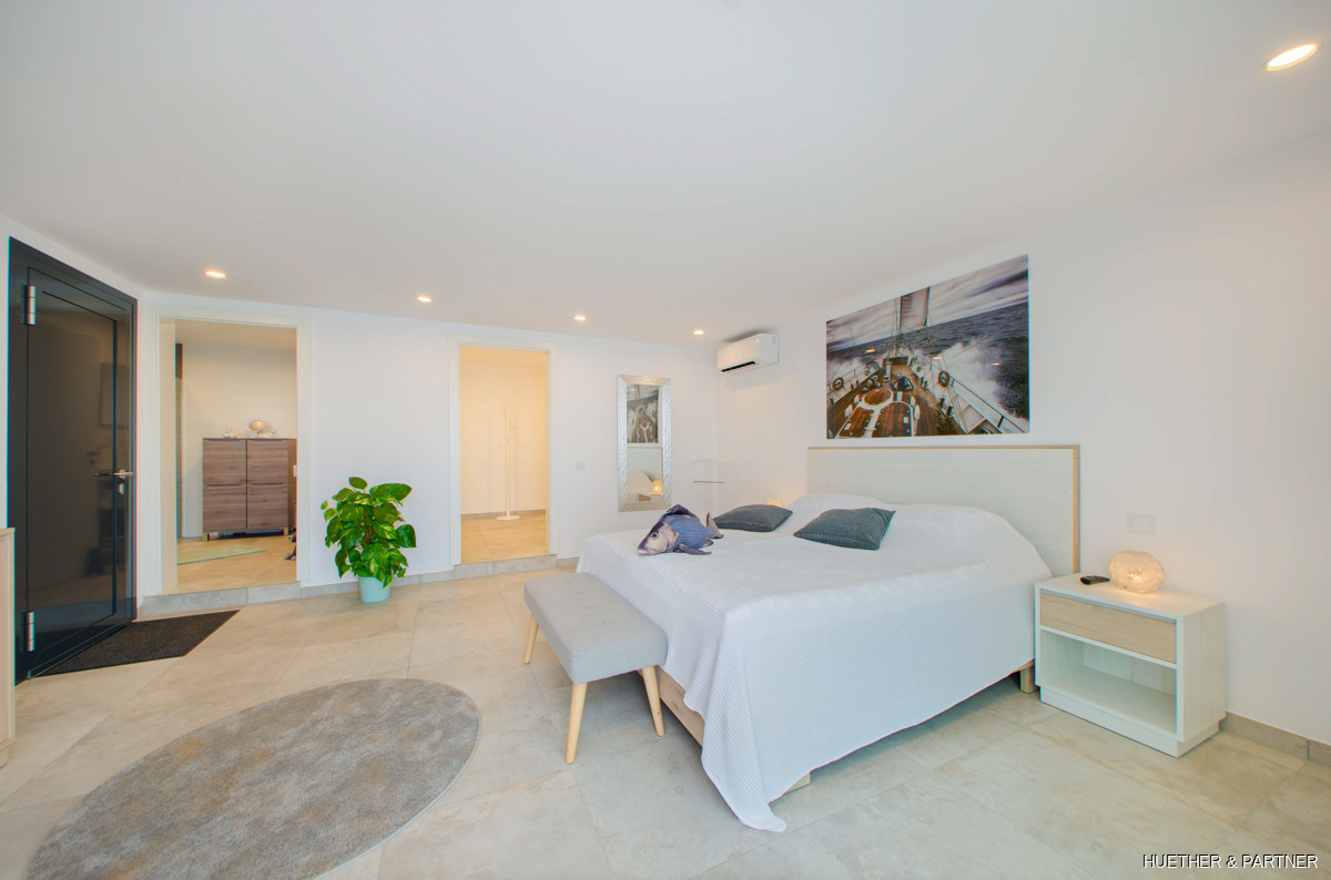 This Bauhaus-style villa, completely renovated in 2022, offers a blend of modern design and luxurious amenities. It features a spacious living area of 324 m², with a main residence on the ground floor and a guest apartment on the lower level. The home boasts a large open-plan living/dining area with a high-end kitchen, all offering stunning panoramic sea views. Access to the covered terrace is available from the living area, providing additional sea vistas. The master suite includes an en-suite bathroom and a workspace with sea views. Additional features are three bathrooms, two guest WCs, and a large laundry room that can be converted into another bedroom.