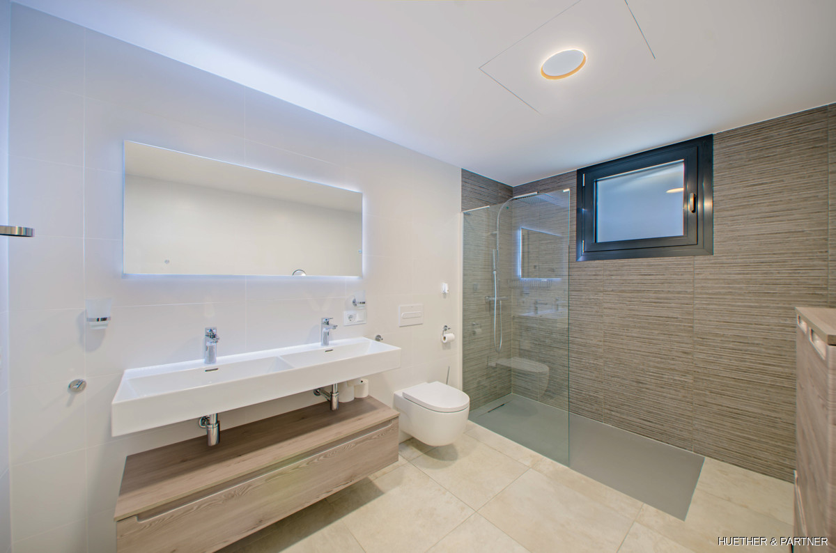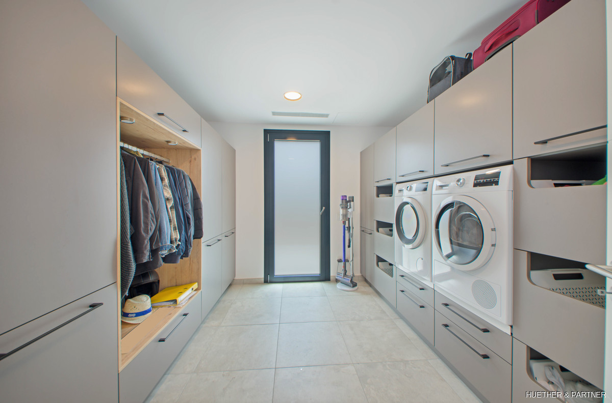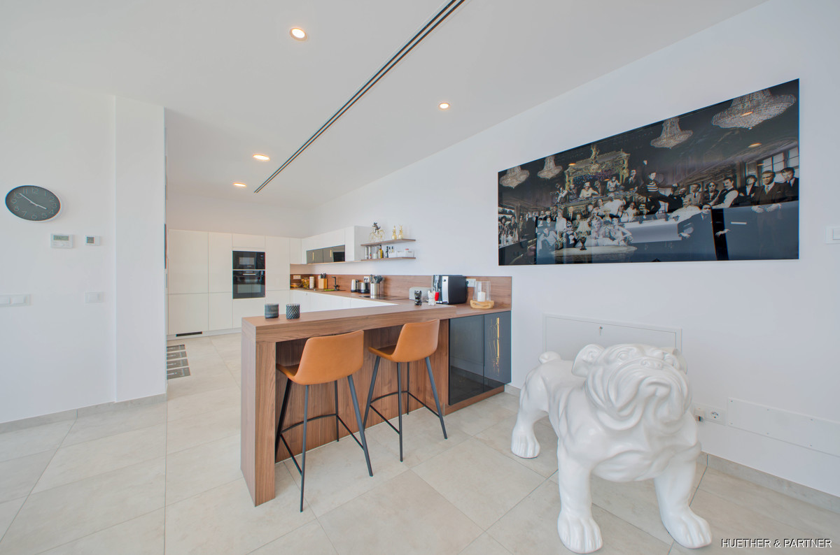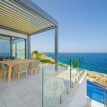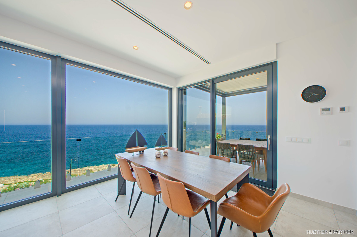 This Bauhaus-style villa, completely renovated in 2022, offers a blend of modern design and luxurious amenities. It features a spacious living area of 324 m², with a main residence on the ground floor and a guest apartment on the lower level. The home boasts a large open-plan living/dining area with a high-end kitchen, all offering stunning panoramic sea views. Access to the covered terrace is available from the living area, providing additional sea vistas. The master suite includes an en-suite bathroom and a workspace with sea views. Additional features are three bathrooms, two guest WCs, and a large laundry room that can be converted into another bedroom.