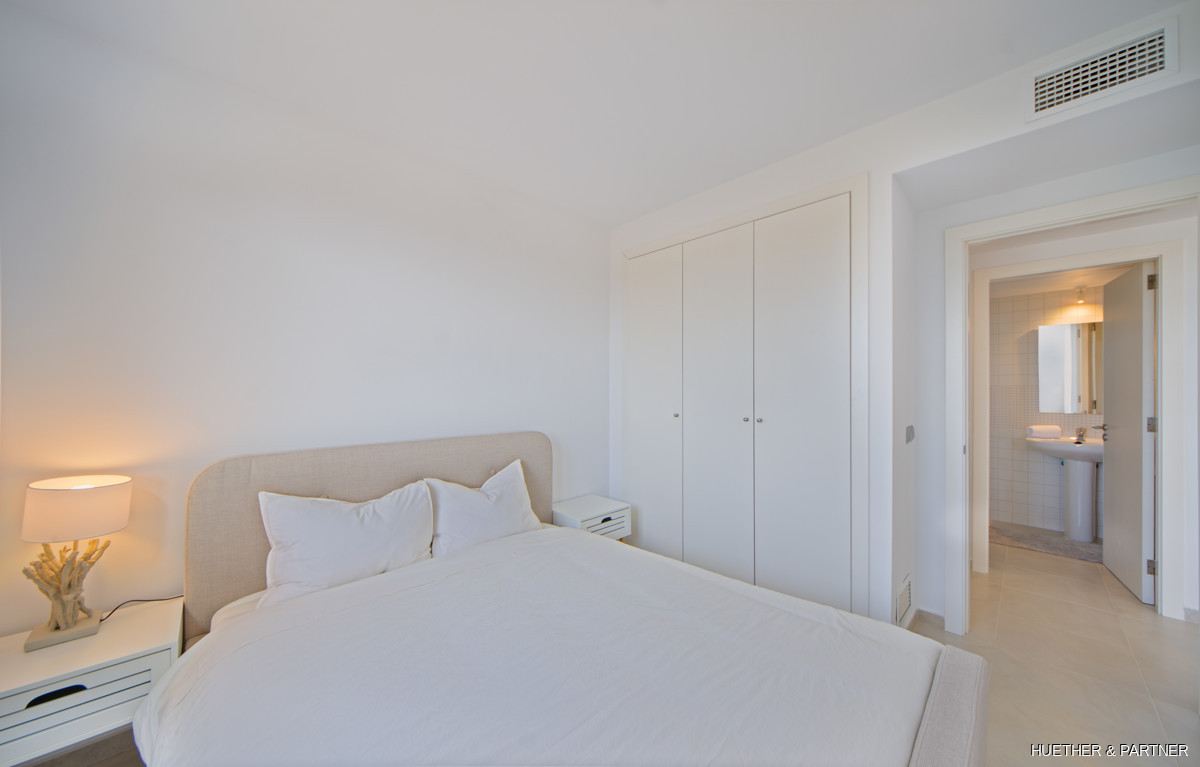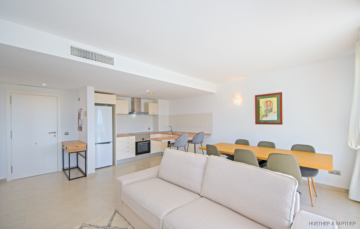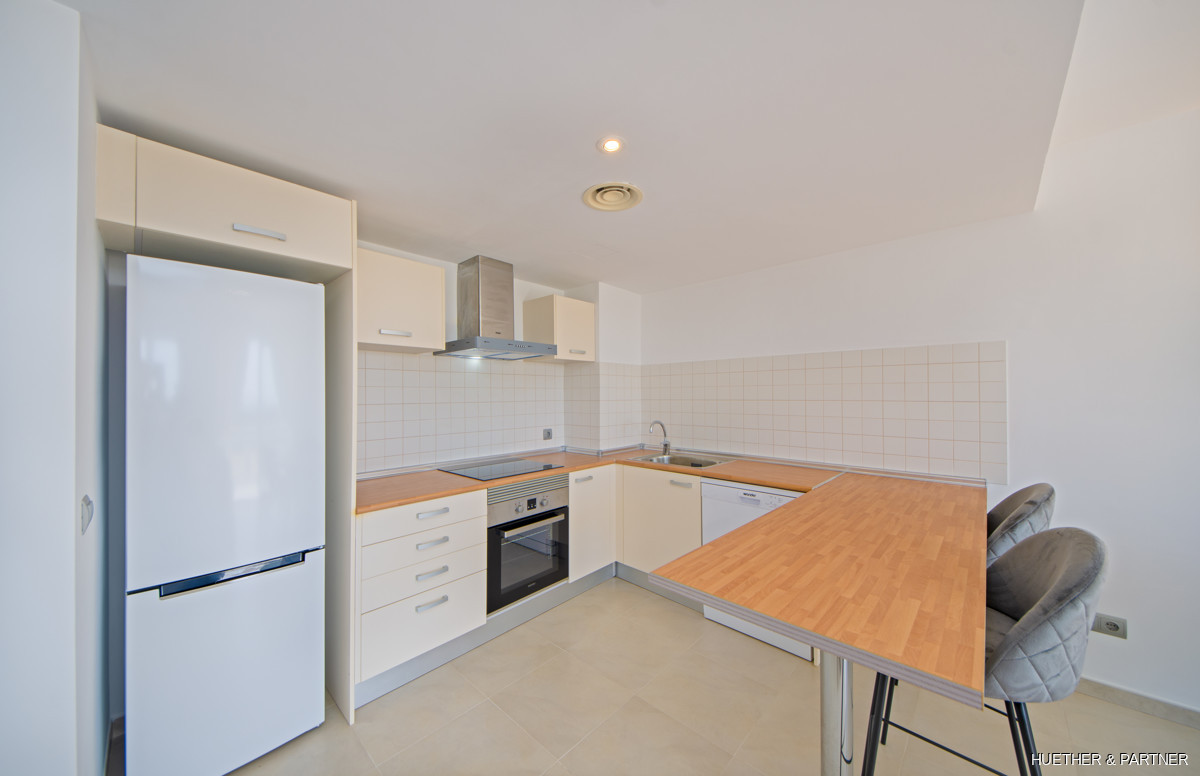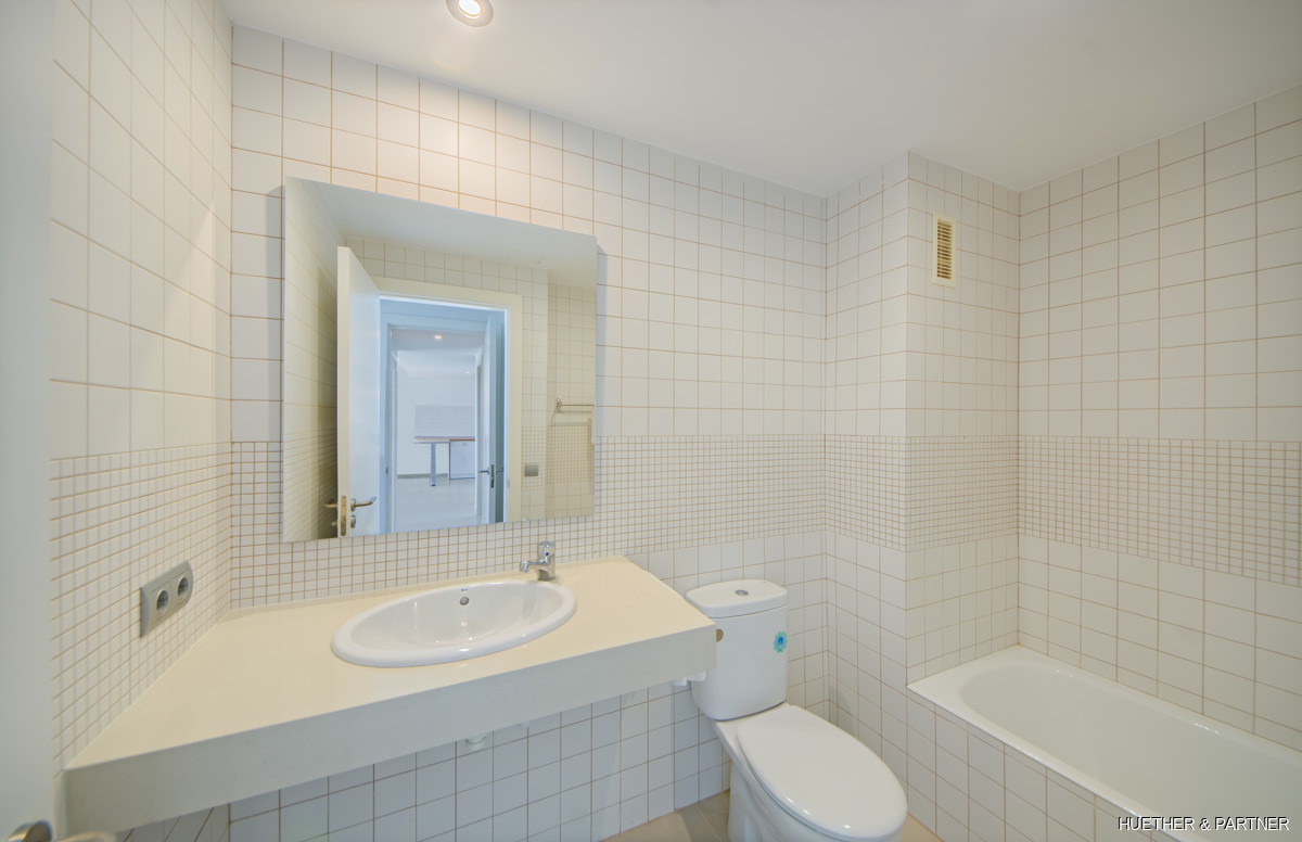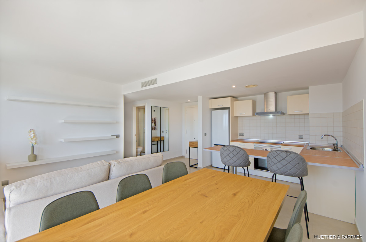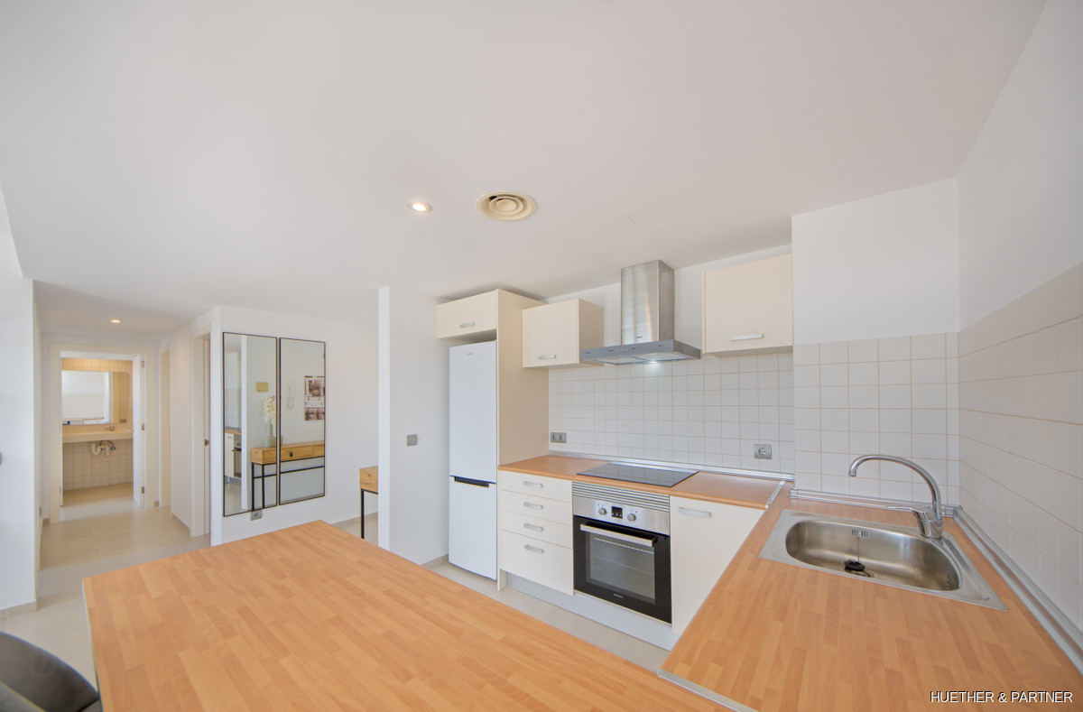 This beachfront sea view apartment in Cales de Mallorca is located on the third floor and is in pristine condition. It features aluminum shutters and doors, an open plan living and dining area with a modern kitchen, and a balcony offering stunning sea views. The apartment includes two bedrooms with built-in wardrobes, two bathrooms—one with a shower and another with a bathtub—and a separate utility room with space for a washing machine and a hot water thermos. Additional offerings include a parking space in the underground garage, an elevator, and access to a communal pool. The apartment is offered unfurnished, with the option to purchase furniture separately.