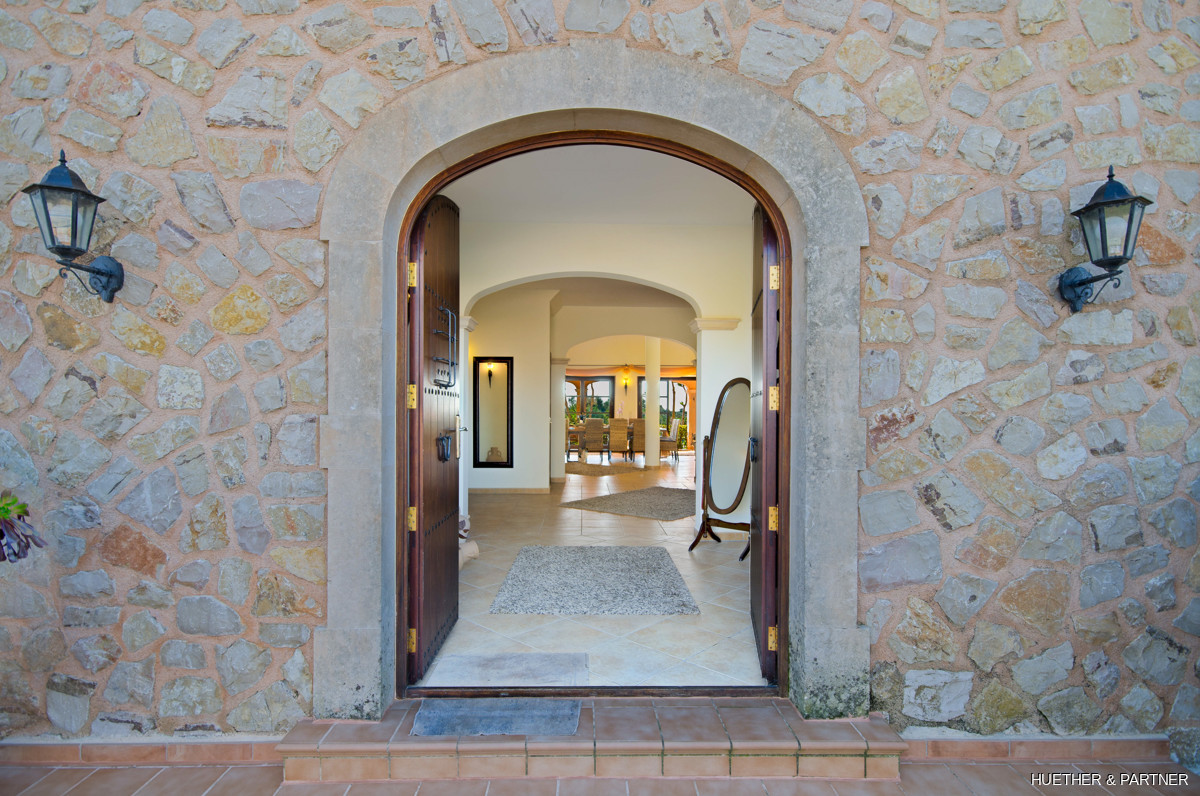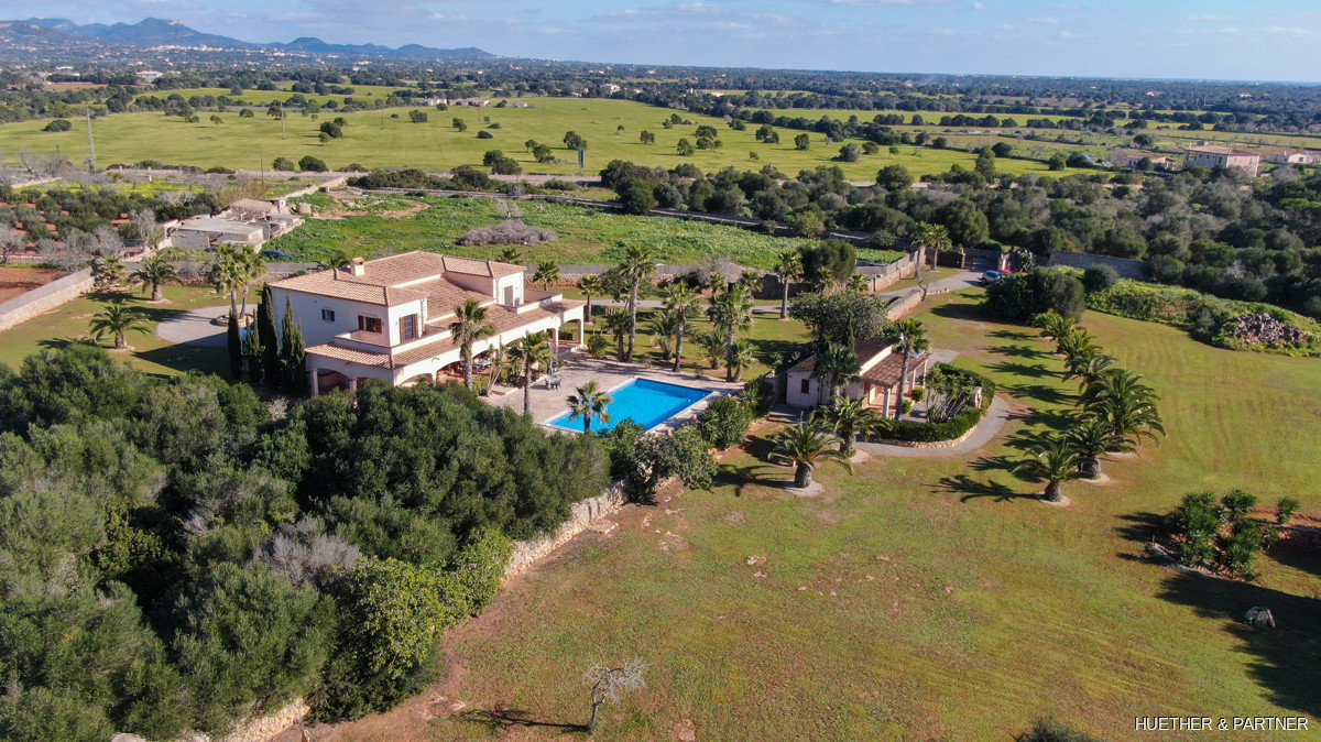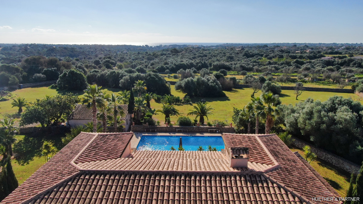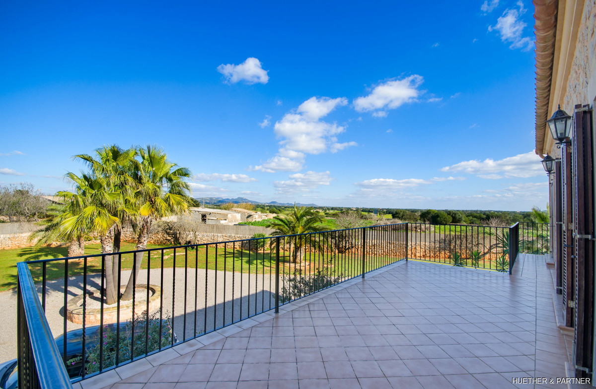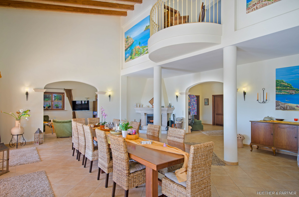 This exquisite Mallorcan finca is nestled on a 14,900 sqm plot, offering both privacy and stunning natural views. The property extends over two floors, featuring six bedrooms, including a master suite on the ground floor. The entrance leads to a welcoming dining area with a fireplace, and the large floor-to-ceiling windows open to a covered terrace, perfect for summer shade. The Mediterranean-style kitchen is fully equipped and adjoins a utility room and separate living area. Upstairs, a gallery leads to a billiard room and a large terrace with breathtaking sea views. The upper floor is divided into two wings, each with a spacious suite including a private living area, bedroom, and bathroom.