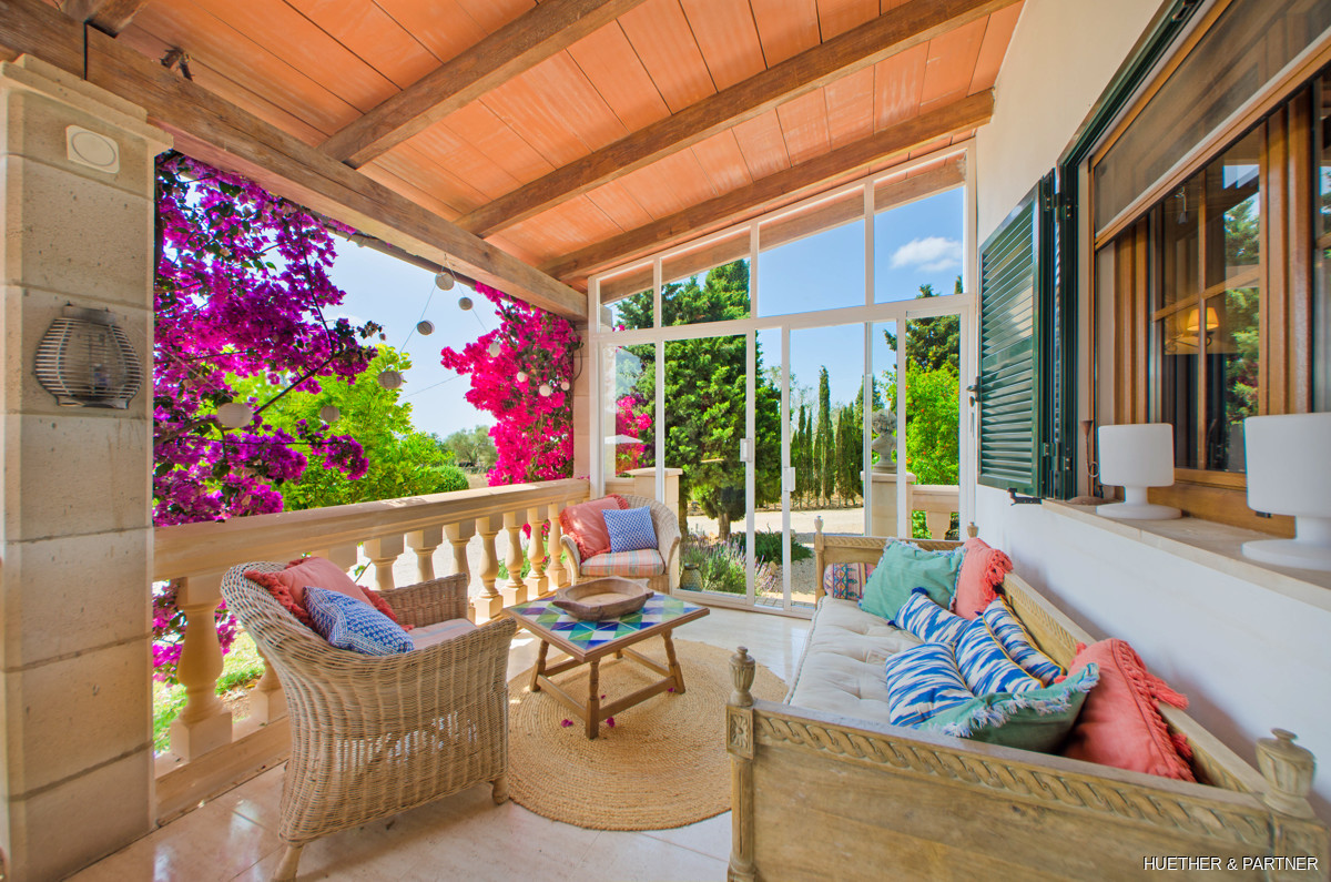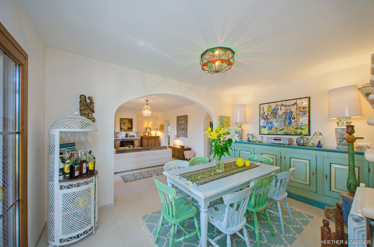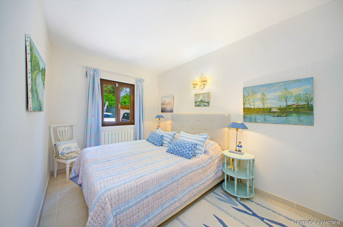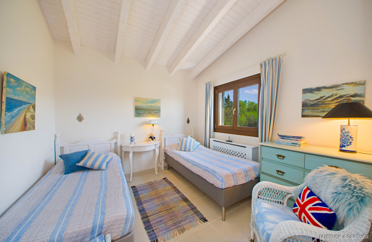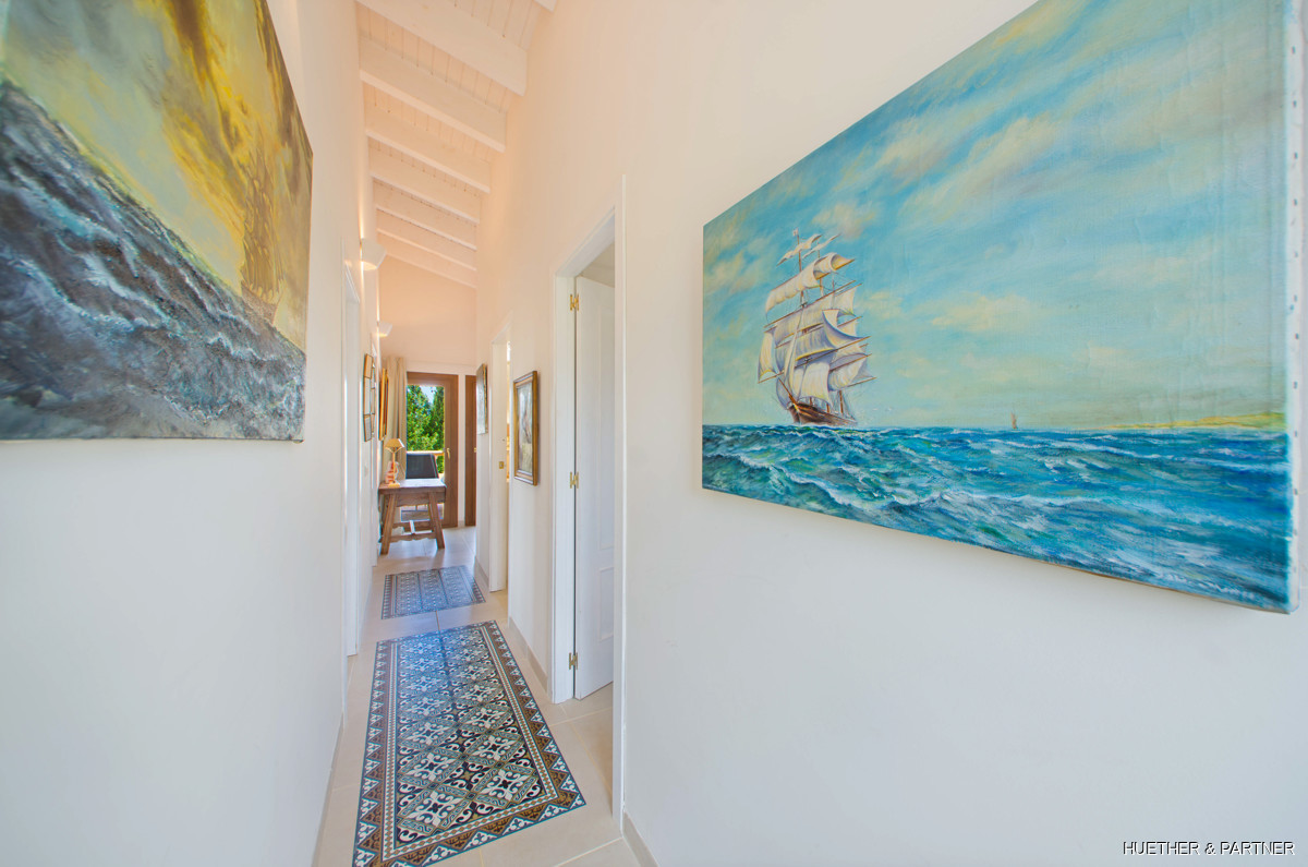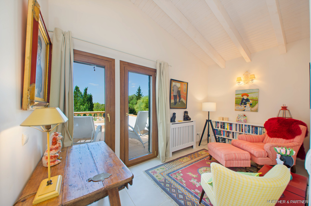 This stunning finca near Llucmajor combines Mediterranean charm with English and North German maritime influences, creating a unique atmosphere. The property features a saltwater pool, an outdoor kitchen with BBQ, and a covered veranda with glass sliding doors for wind protection. Inside, the ground floor includes a spacious living area with a fireplace, a kitchen, a tea-room with a Sylter corner bench, and a Mediterranean-style bathroom with a corner bathtub. Upstairs, three bedrooms are connected by a corridor, with one featuring a walk-in closet. Additionally, there is a cozy reading room leading to a rooftop terrace with distant sea views to Cabrera.