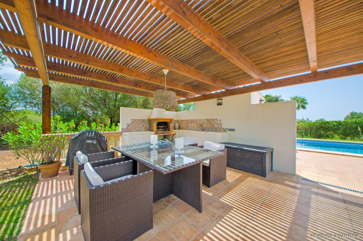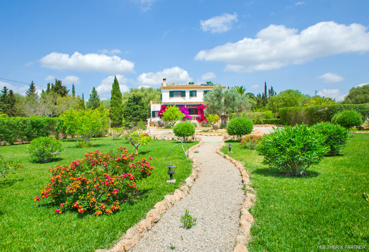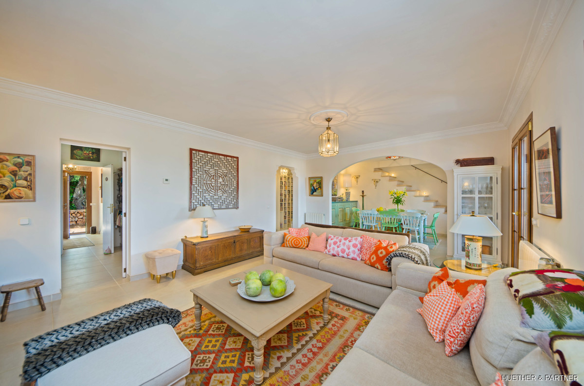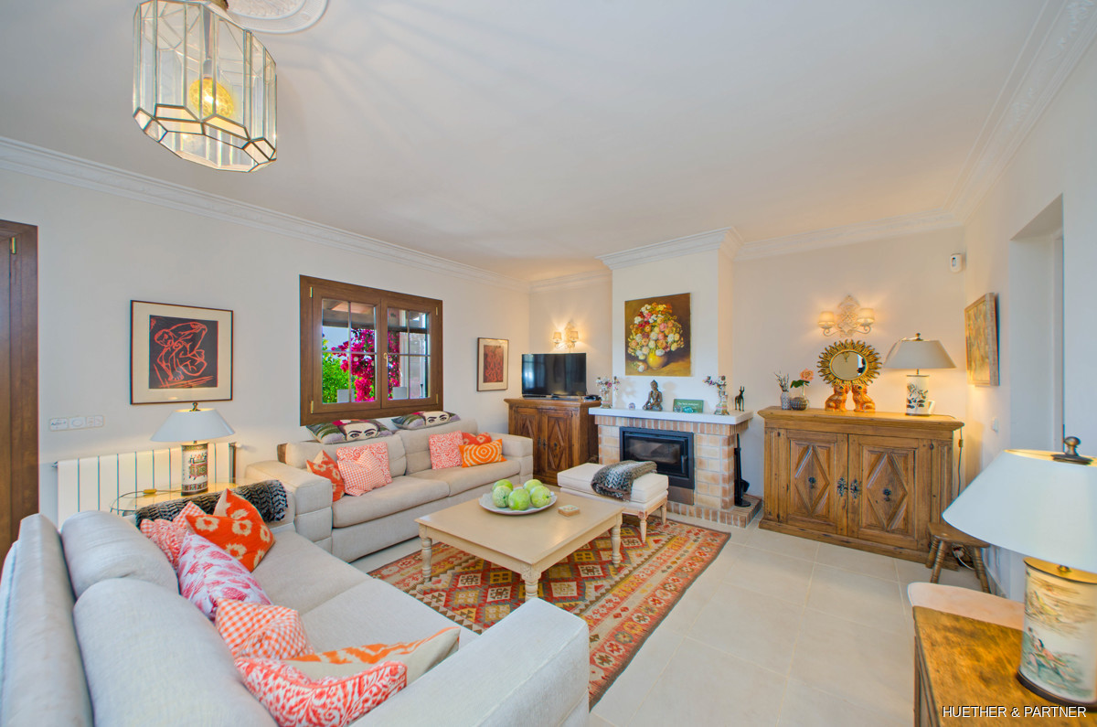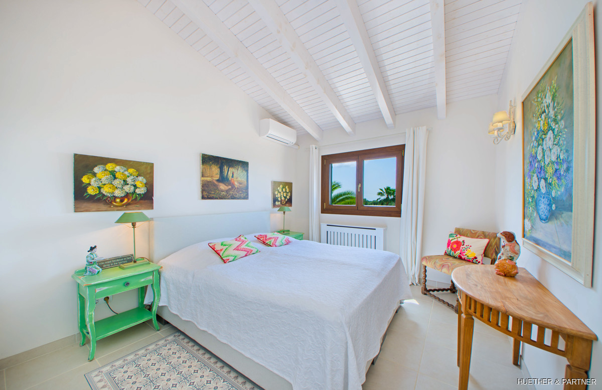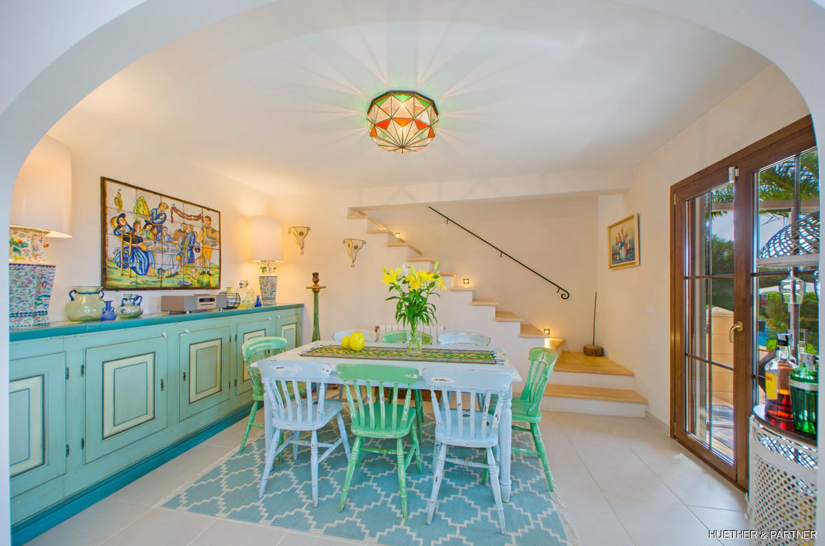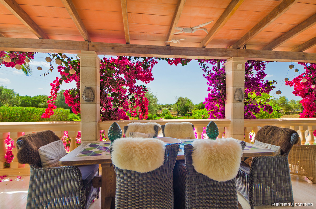 This stunning finca near Llucmajor combines Mediterranean charm with English and North German maritime influences, creating a unique atmosphere. The property features a saltwater pool, an outdoor kitchen with BBQ, and a covered veranda with glass sliding doors for wind protection. Inside, the ground floor includes a spacious living area with a fireplace, a kitchen, a tea-room with a Sylter corner bench, and a Mediterranean-style bathroom with a corner bathtub. Upstairs, three bedrooms are connected by a corridor, with one featuring a walk-in closet. Additionally, there is a cozy reading room leading to a rooftop terrace with distant sea views to Cabrera.