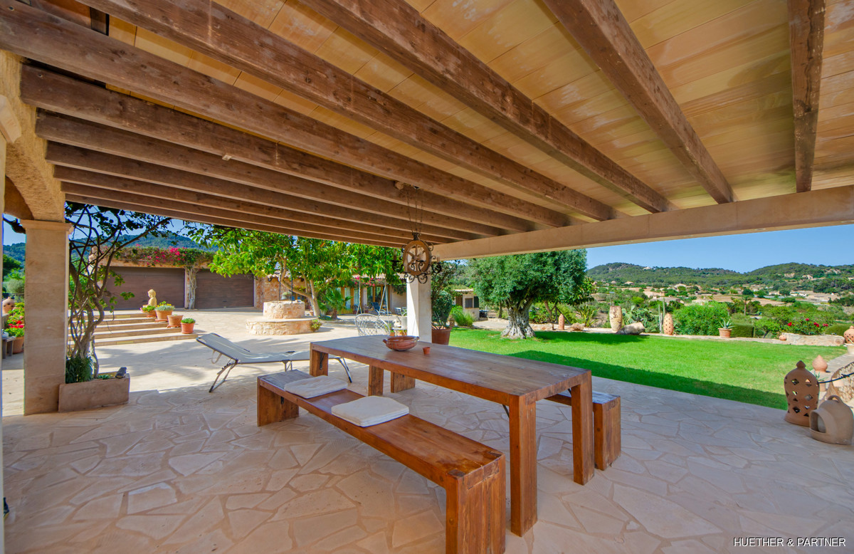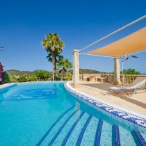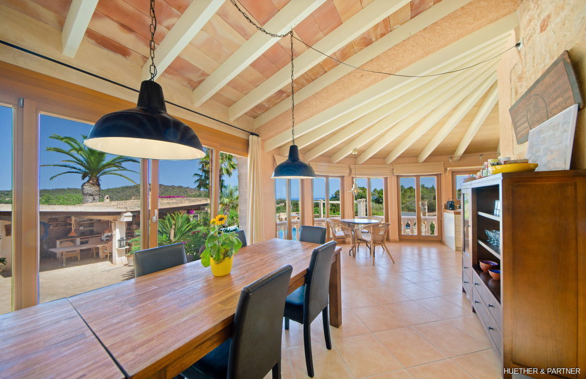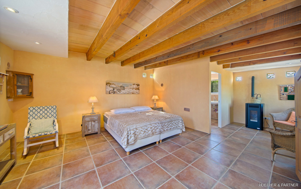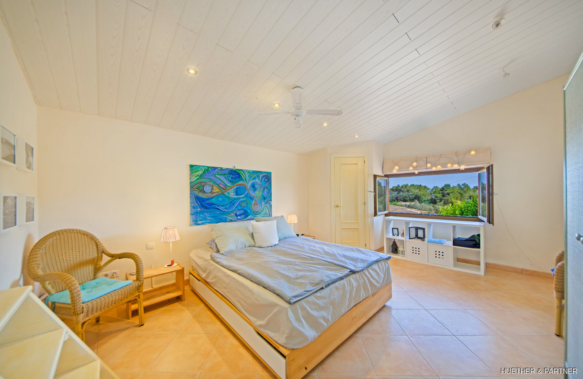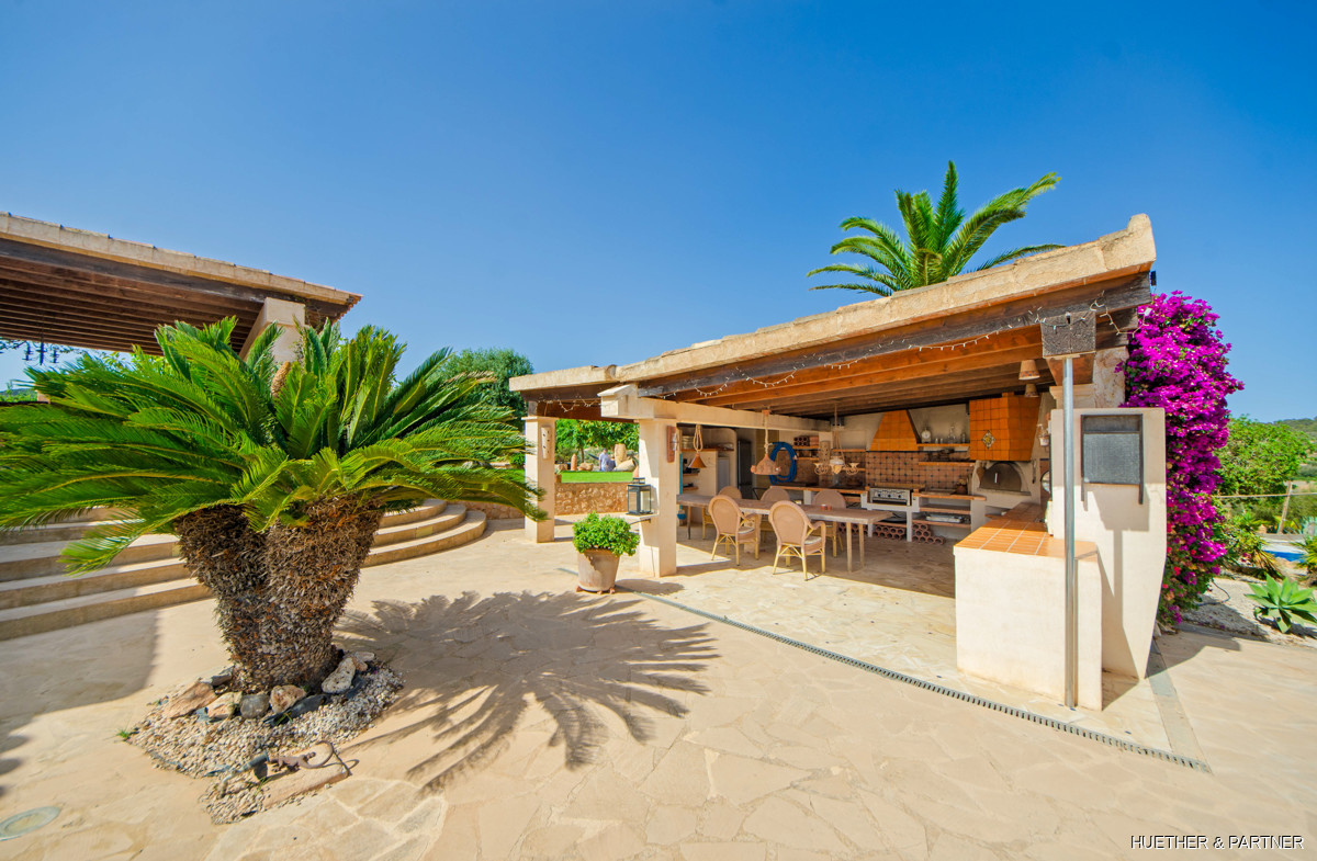 This stunning natural stone finca, located between Calonge and Es Carritxó, offers breathtaking views of the valley, sea, and the Castel Santuiri ruins. The property features a fully equipped outdoor kitchen, complete with a pizza oven and grill, alongside a mosaic-tiled pool and a luxurious jacuzzi. The main house boasts a spacious living/dining area with a fireplace and a semi-circular kitchen in the Mallorcan style, providing sea views. Additional accommodation includes a guesthouse and two guest apartments, each equipped with bedrooms and private bathrooms.