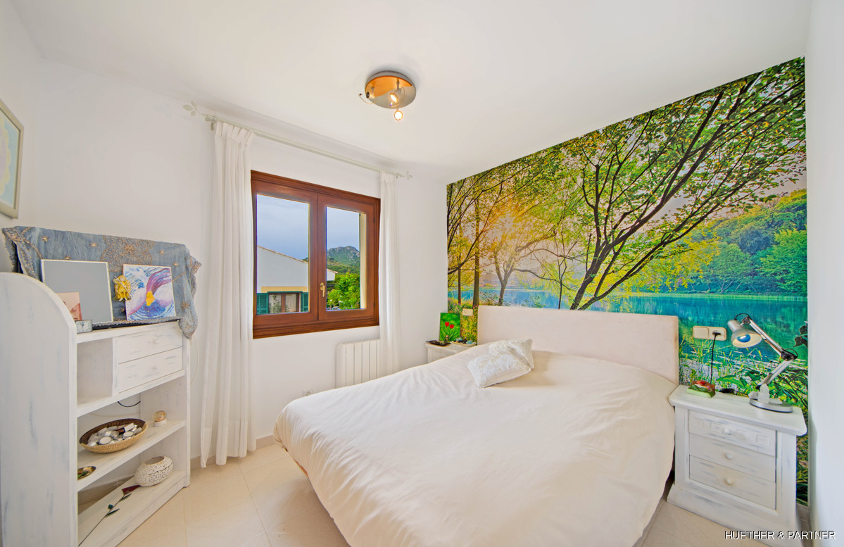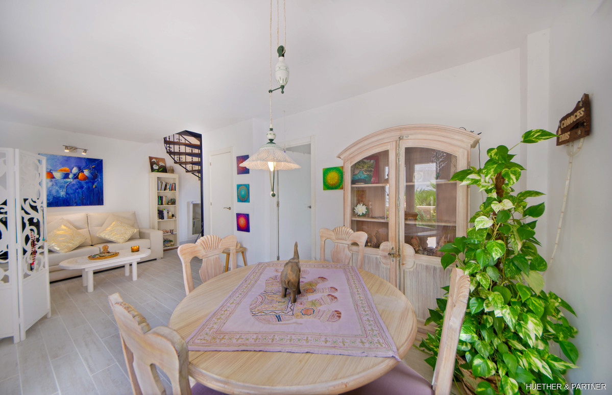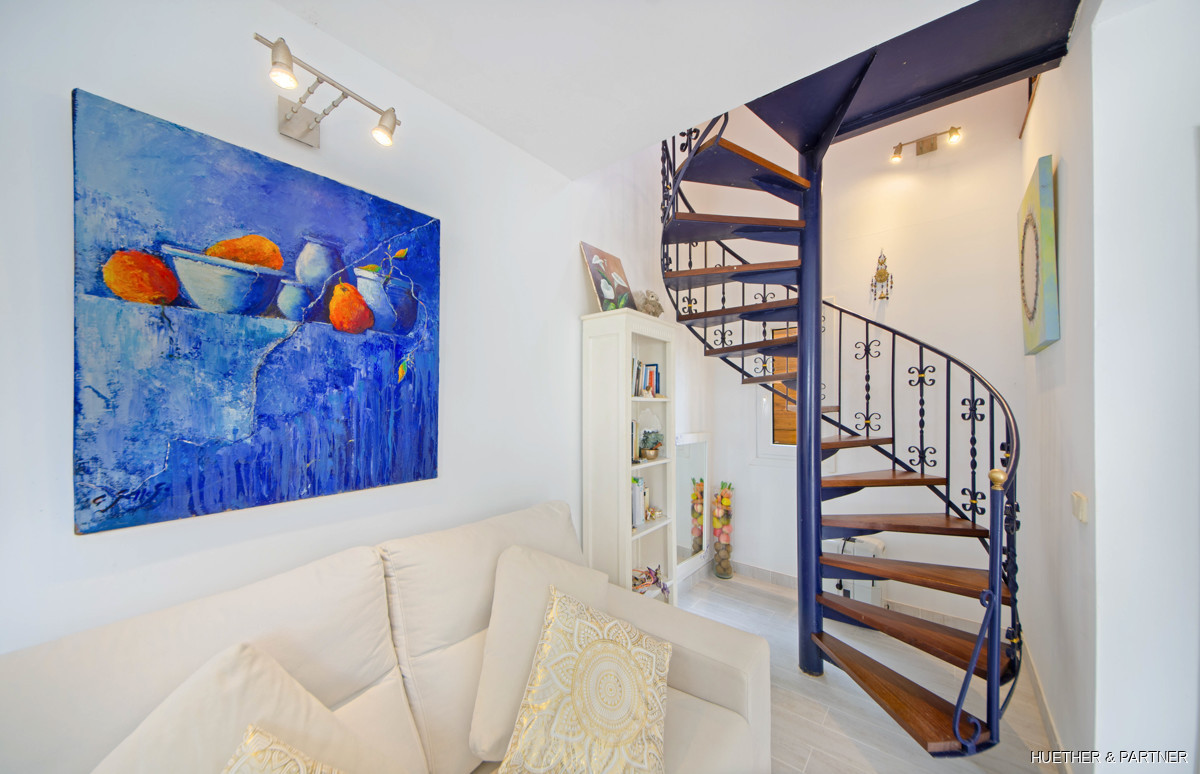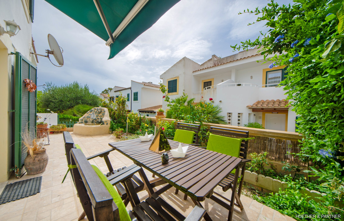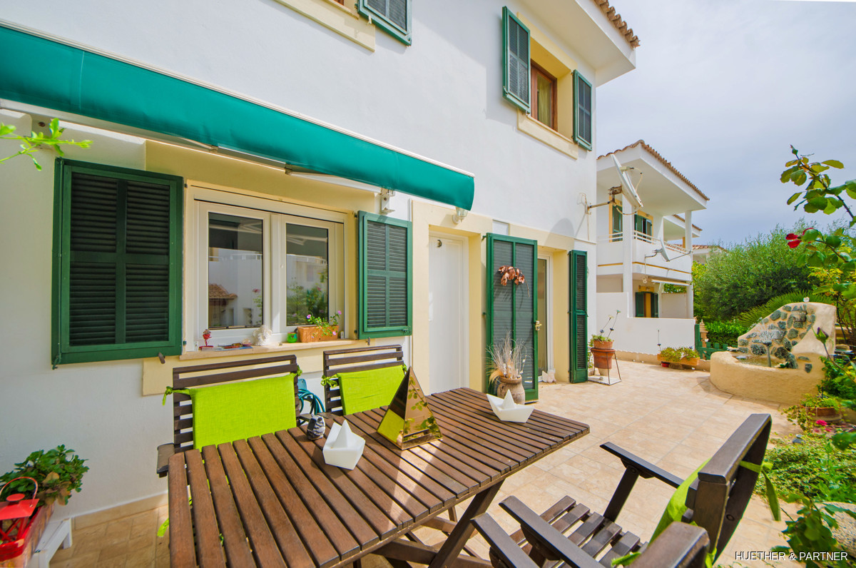 This delightful semi-detached house in Font de Sa Cala boasts a unique charm with its thoughtful design and practical features. Situated in a peaceful coastal village, the property is part of a small community of 12 townhouses, each offering individuality and privacy. The house spans approximately 55 m2 across two floors, connected by a spiral staircase. The entrance leads to a lovingly landscaped front garden and a large terrace with a small fountain, creating a welcoming ambiance. The ground floor features a bright living/dining area, seamlessly connected to the kitchen by stylish laminate-look tiled flooring. A convenient guest WC completes the ground floor offering.