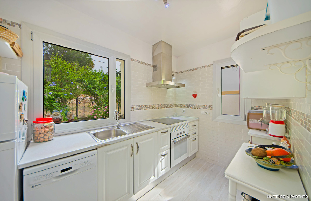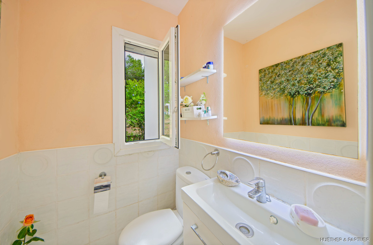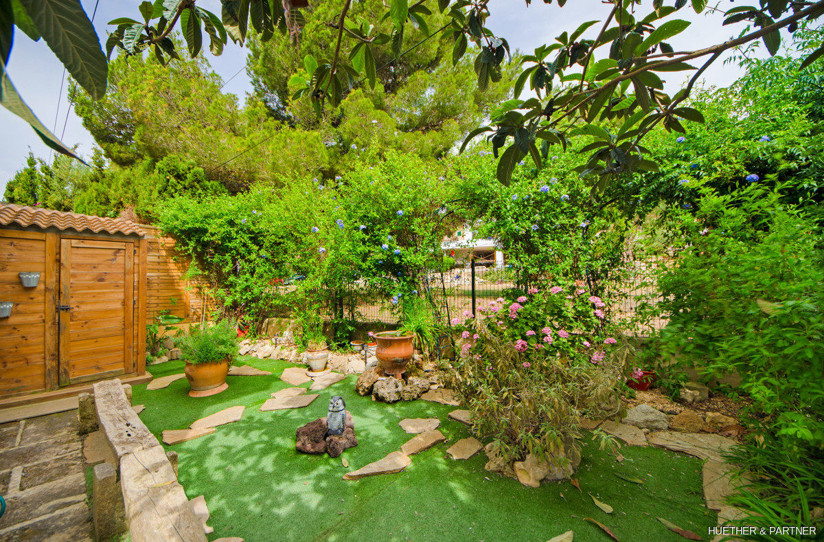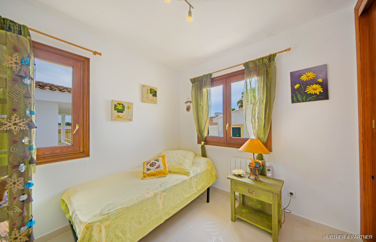 This delightful semi-detached house in Font de Sa Cala boasts a unique charm with its thoughtful design and practical features. Situated in a peaceful coastal village, the property is part of a small community of 12 townhouses, each offering individuality and privacy. The house spans approximately 55 m2 across two floors, connected by a spiral staircase. The entrance leads to a lovingly landscaped front garden and a large terrace with a small fountain, creating a welcoming ambiance. The ground floor features a bright living/dining area, seamlessly connected to the kitchen by stylish laminate-look tiled flooring. A convenient guest WC completes the ground floor offering.