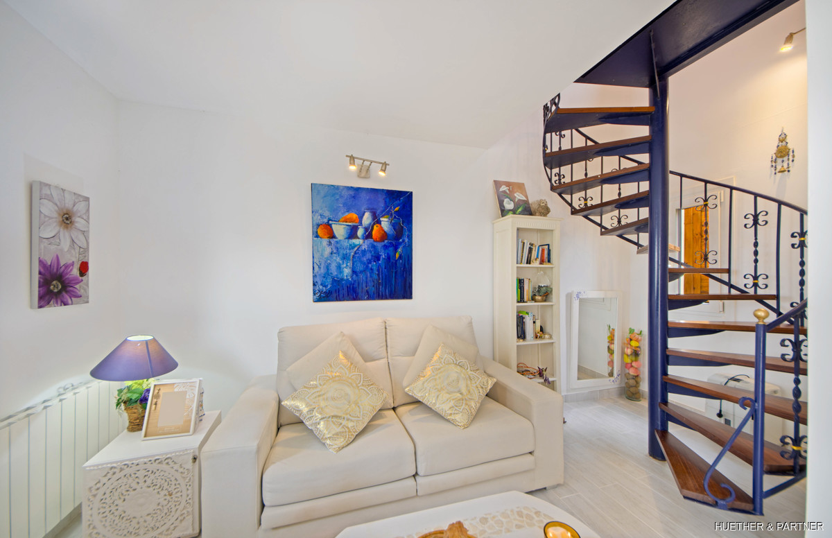 Upstairs, the spiral staircase leads to two bedrooms, one with mountain views, and a bathroom with a bathtub. A laundry room with a window front provides ample natural light. The property includes a small private garden backing onto a green zone, offering tranquility and privacy. The house is sold fully furnished, excluding decor and personal items.