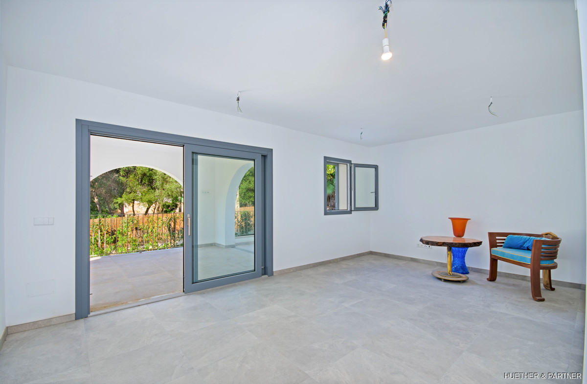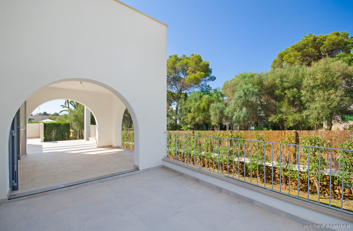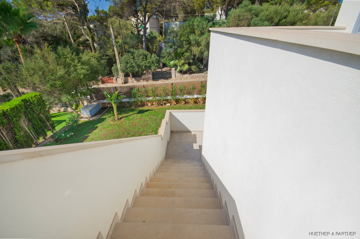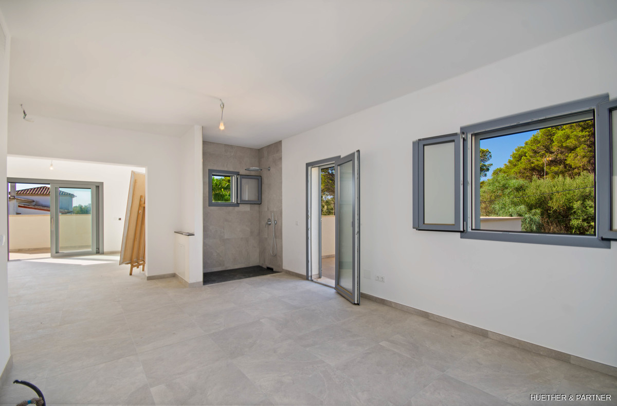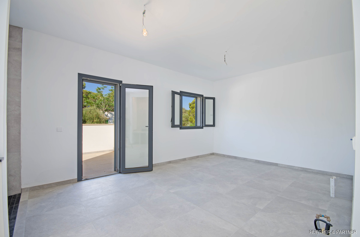 This modern Bauhaus-style villa is located on a unique corner plot, just a 5-minute walk from the picturesque harbor of Porto Petro. The villa, built on the foundation of a traditional 1969 Mallorcan stone house, features integrated historical elements such as arches, stone steps, terrace beams, and benches by the main entrance. The ground floor offers a guest WC, a living room with access to a covered terrace, a kitchen with garden access, two bedrooms, a bathroom, and an OTIS elevator connecting the floors.
