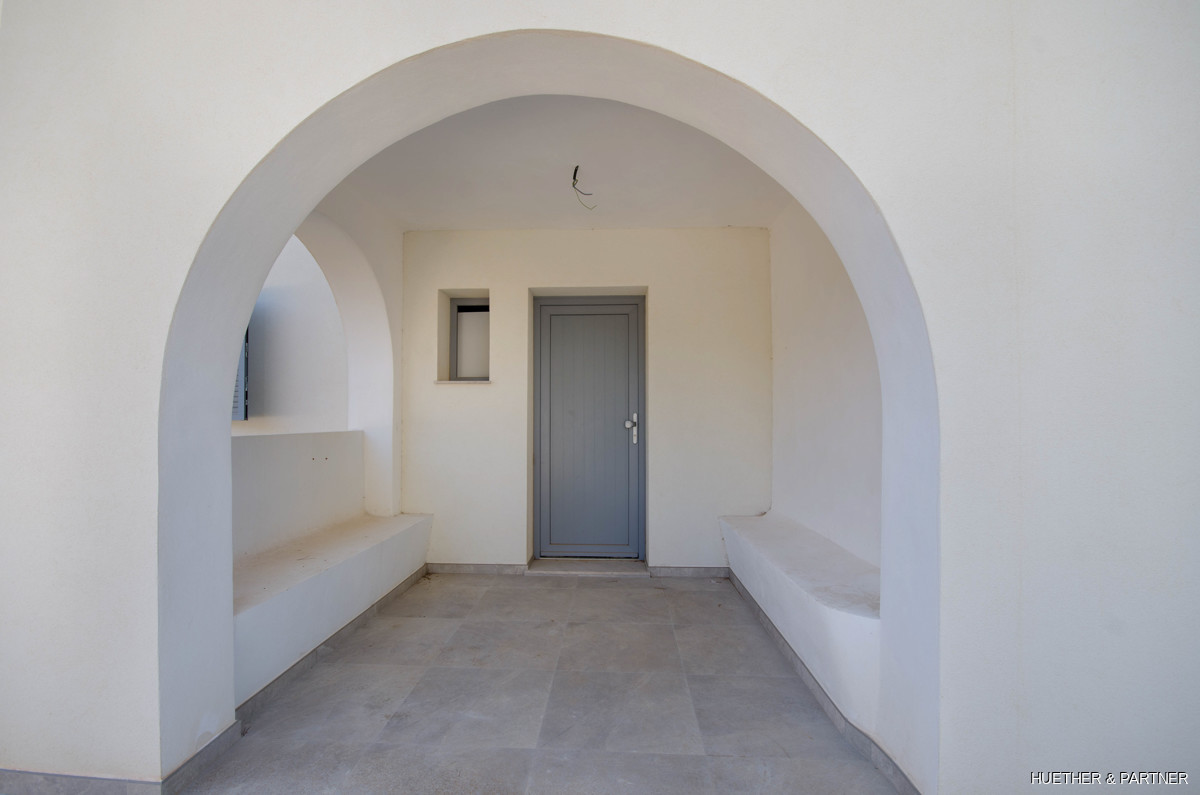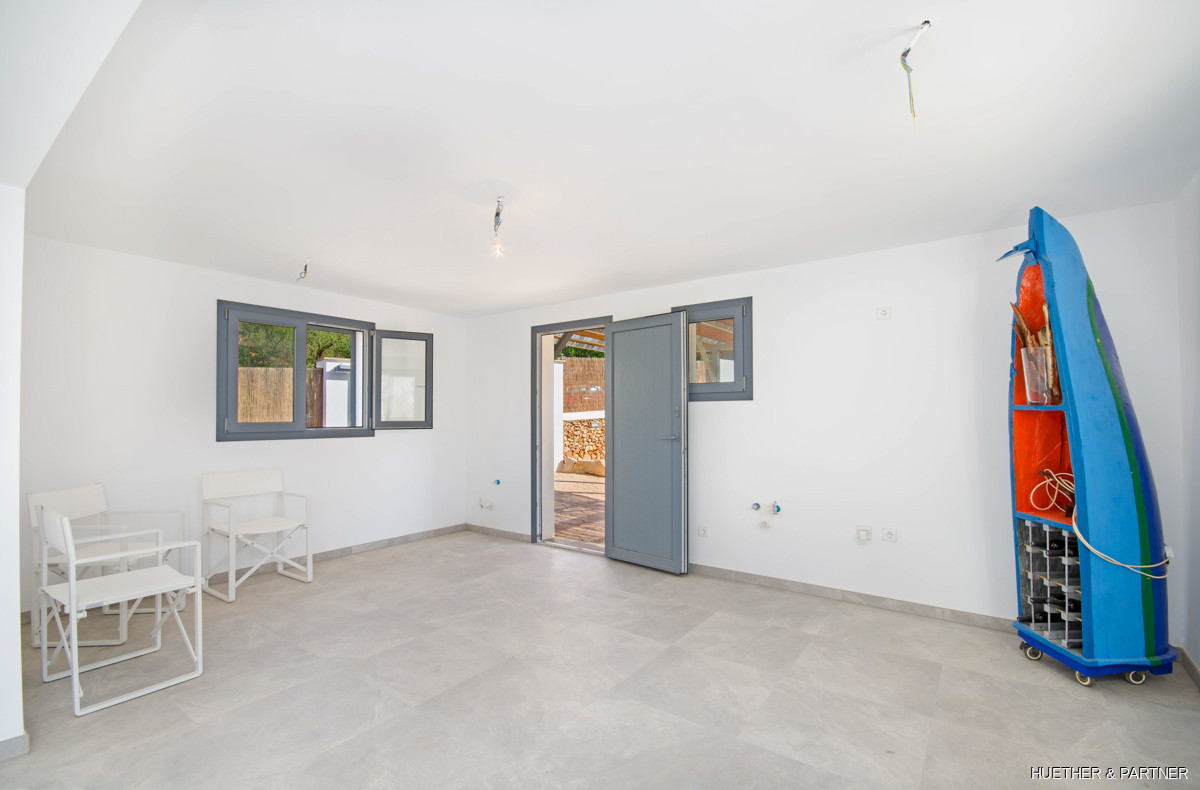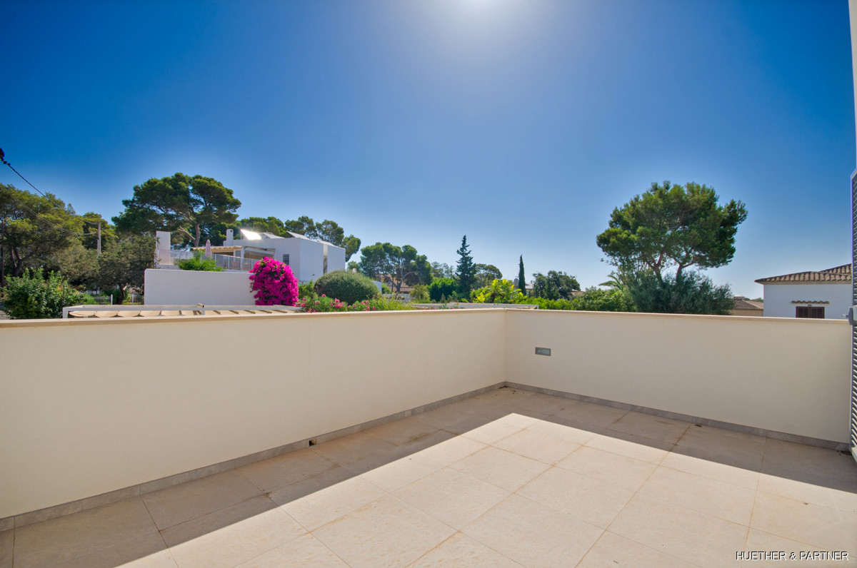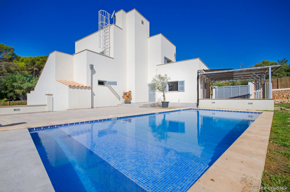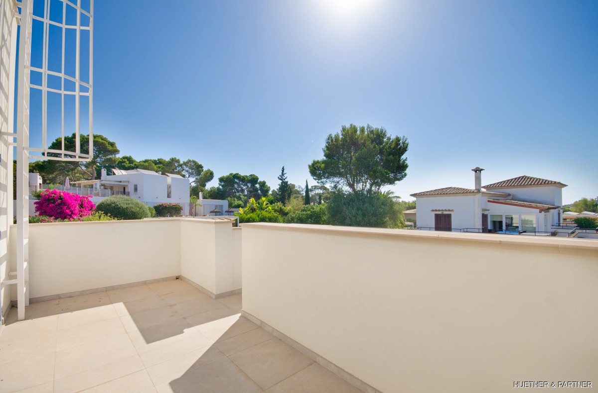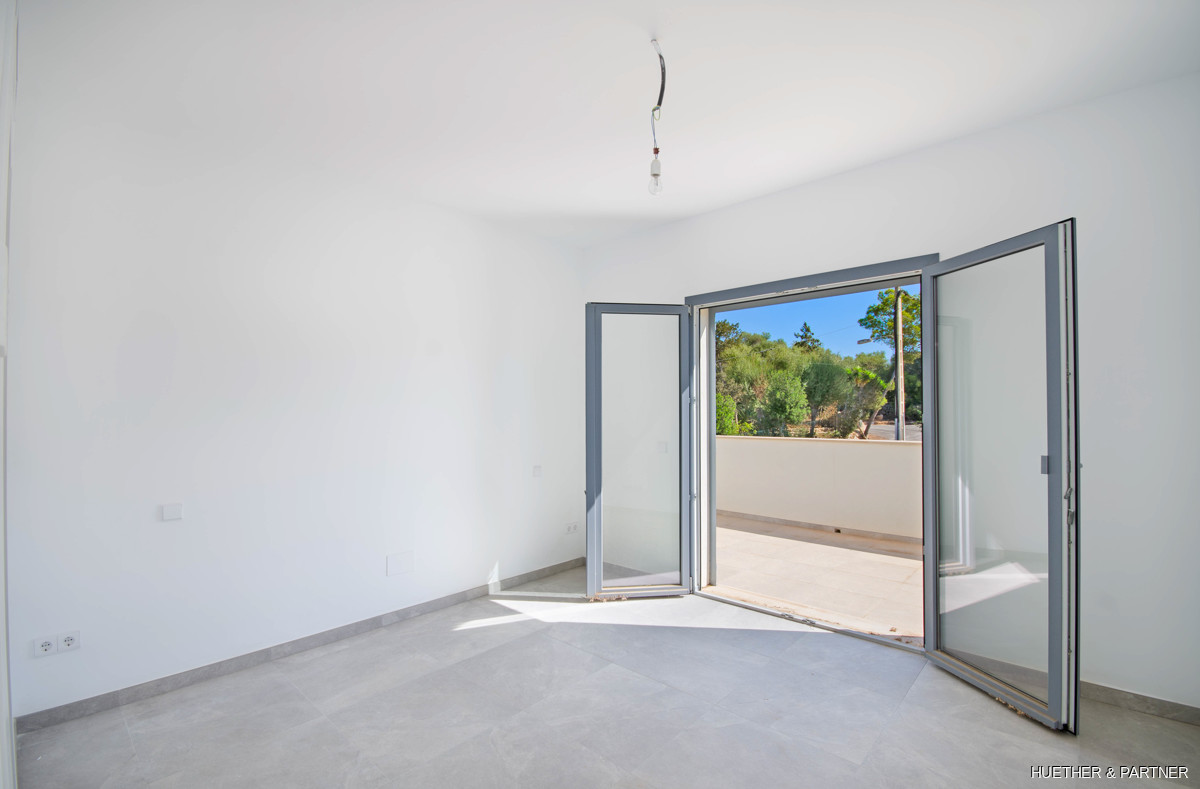 This modern Bauhaus-style villa is located on a unique corner plot, just a 5-minute walk from the picturesque harbor of Porto Petro. The villa, built on the foundation of a traditional 1969 Mallorcan stone house, features integrated historical elements such as arches, stone steps, terrace beams, and benches by the main entrance. The ground floor offers a guest WC, a living room with access to a covered terrace, a kitchen with garden access, two bedrooms, a bathroom, and an OTIS elevator connecting the floors.