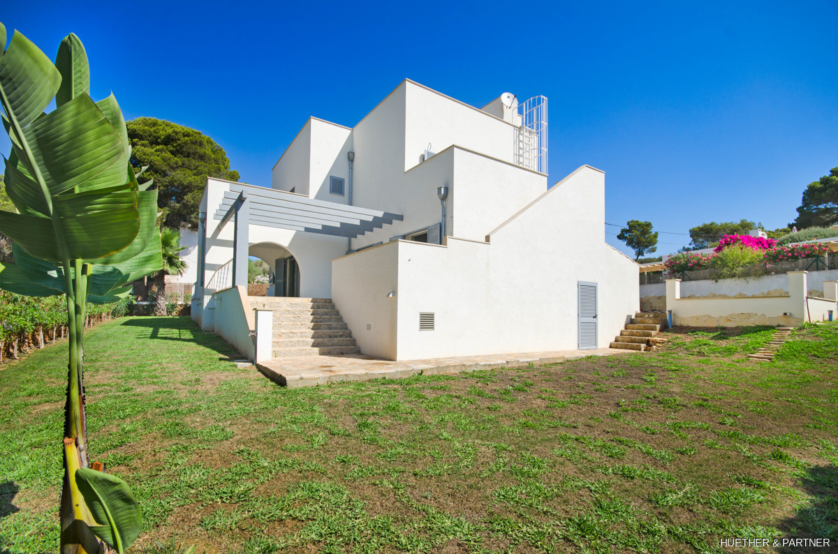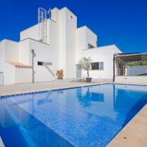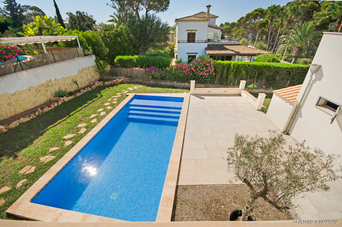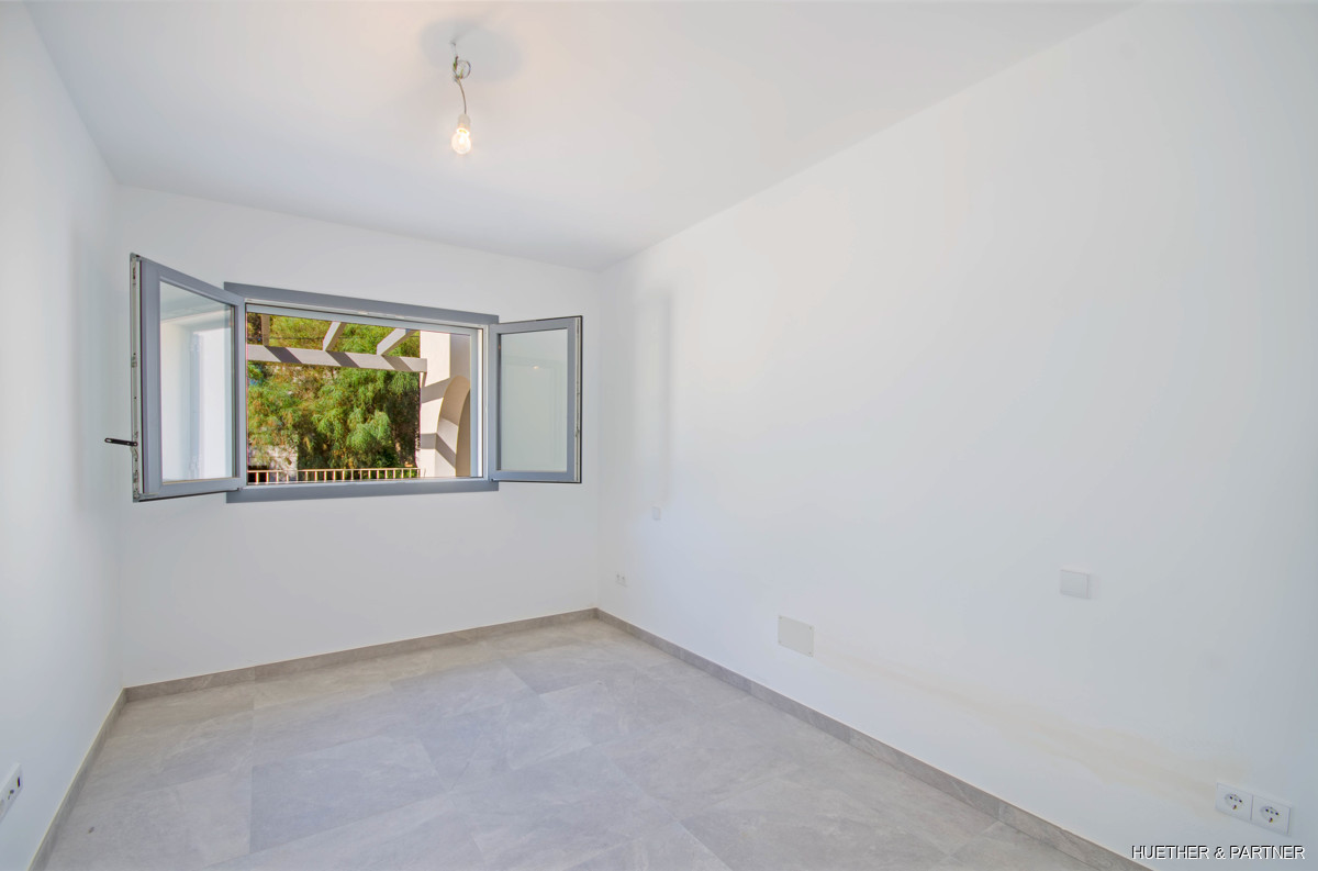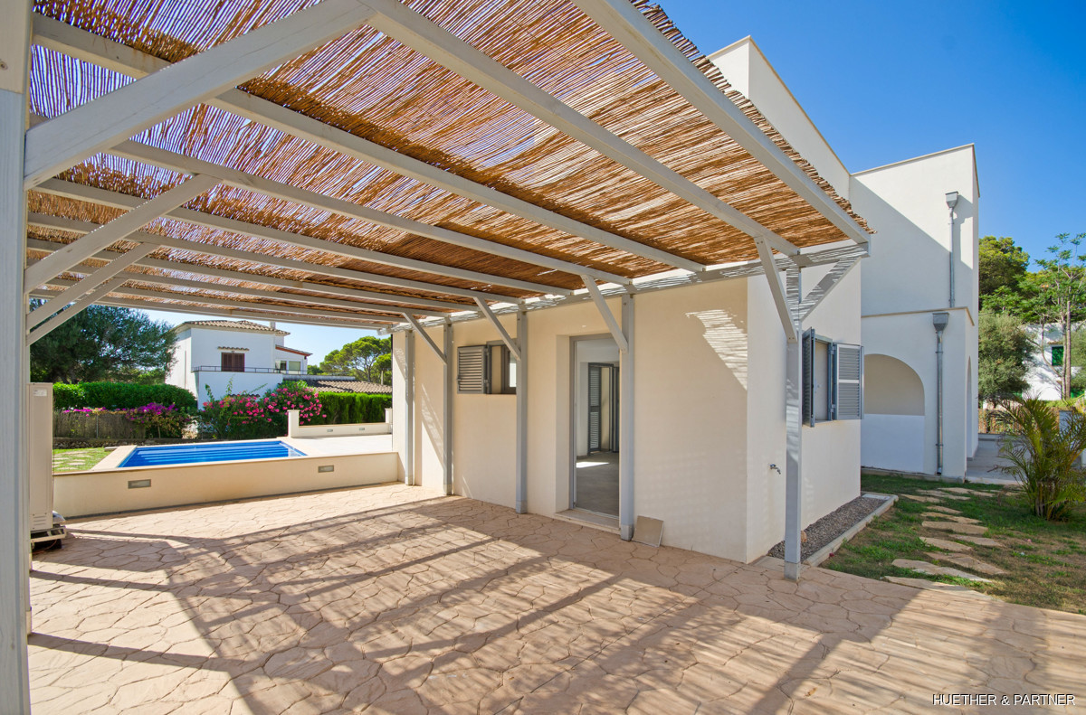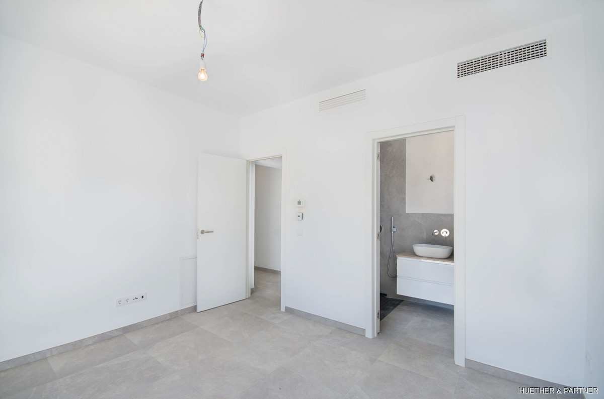 This modern Bauhaus-style villa is located on a unique corner plot, just a 5-minute walk from the picturesque harbor of Porto Petro. The villa, built on the foundation of a traditional 1969 Mallorcan stone house, features integrated historical elements such as arches, stone steps, terrace beams, and benches by the main entrance. The ground floor offers a guest WC, a living room with access to a covered terrace, a kitchen with garden access, two bedrooms, a bathroom, and an OTIS elevator connecting the floors.