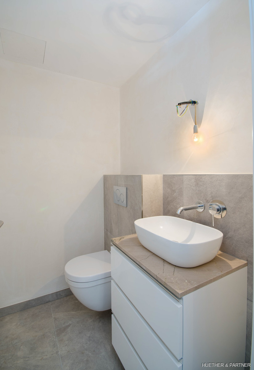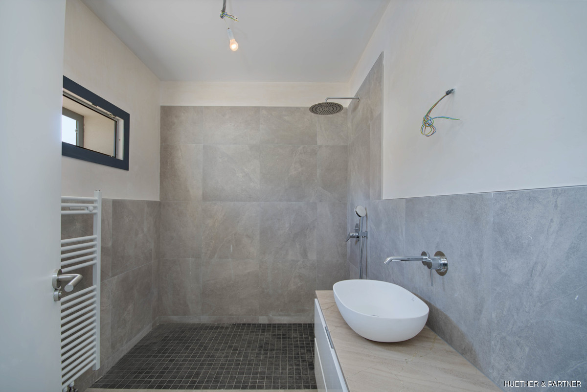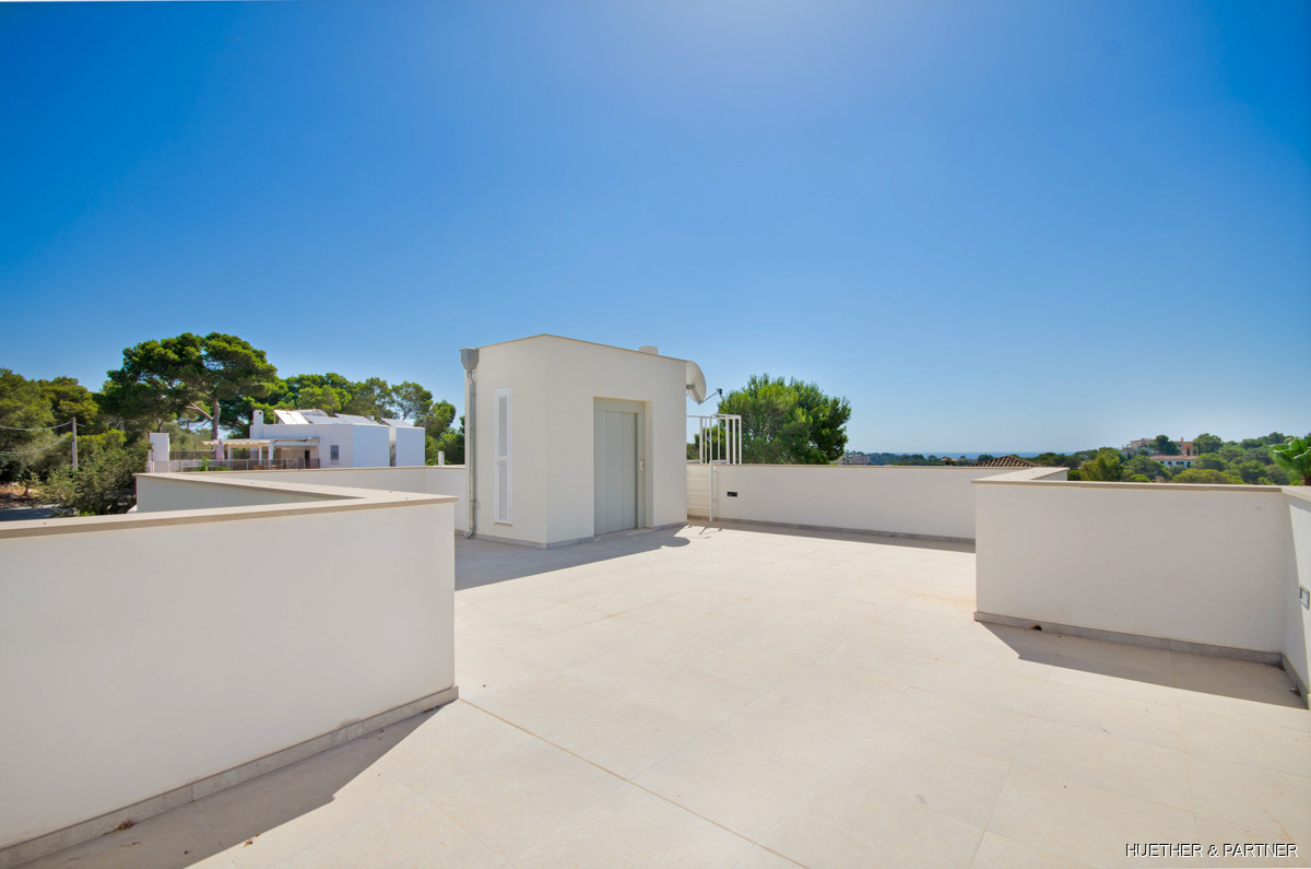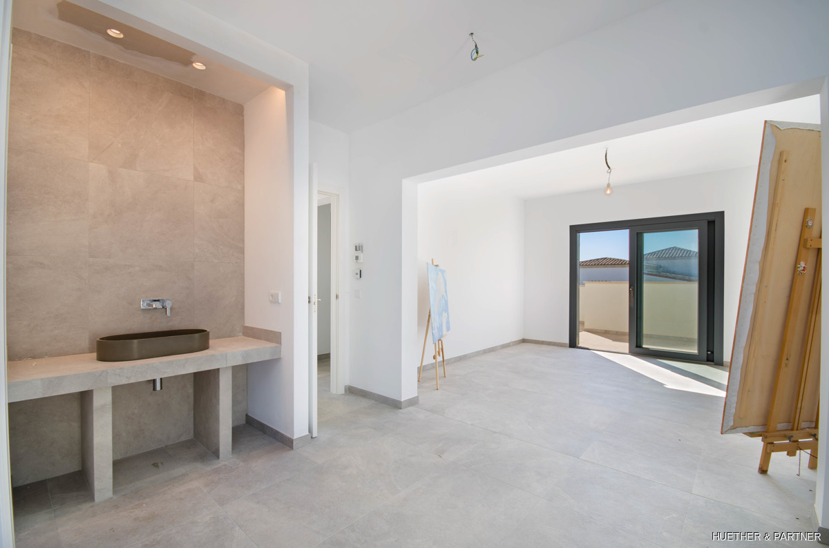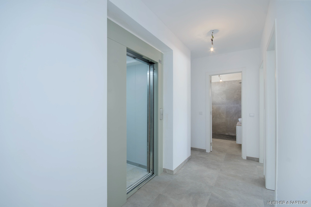 The first floor hosts two bedrooms, each with en-suite bathrooms and private terraces. The spacious master bedroom includes an open bath and planned fitness area, featuring an open washbasin, separate WC, open shower, and a pre-installed connection for a freestanding bathtub or whirlpool. The property also boasts a 90 m² rooftop terrace with views of fields and the sea. High walls ensure privacy for sunbathing on all terraces, and the lift provides access to the rooftop terrace.