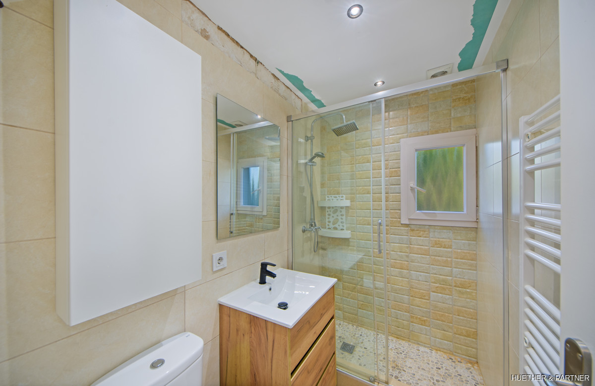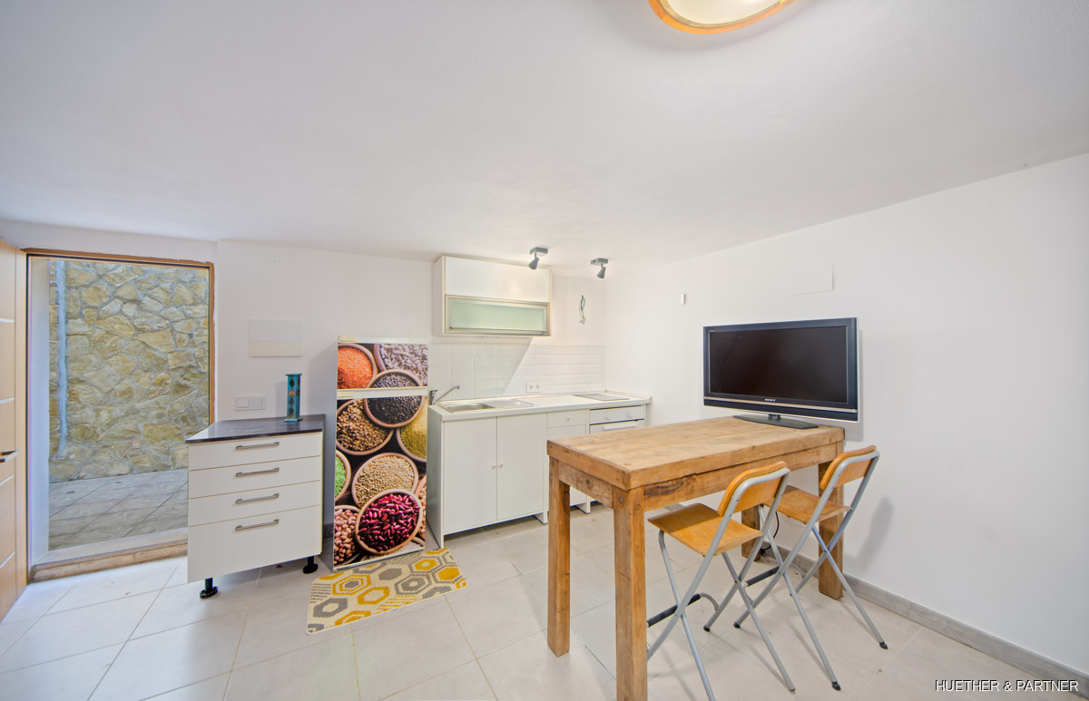 The main living area includes two bedrooms and a bathroom, while outside youll find a utility area for a washing machine and boiler. A generous terrace provides views of the greenery and neighborhood, with a staircase leading to a rooftop terrace offering distant sea views. Below the terrace, a small guest apartment includes a kitchenette, bathroom, and living/sleeping area.