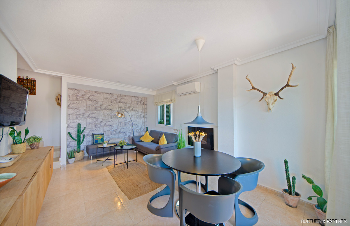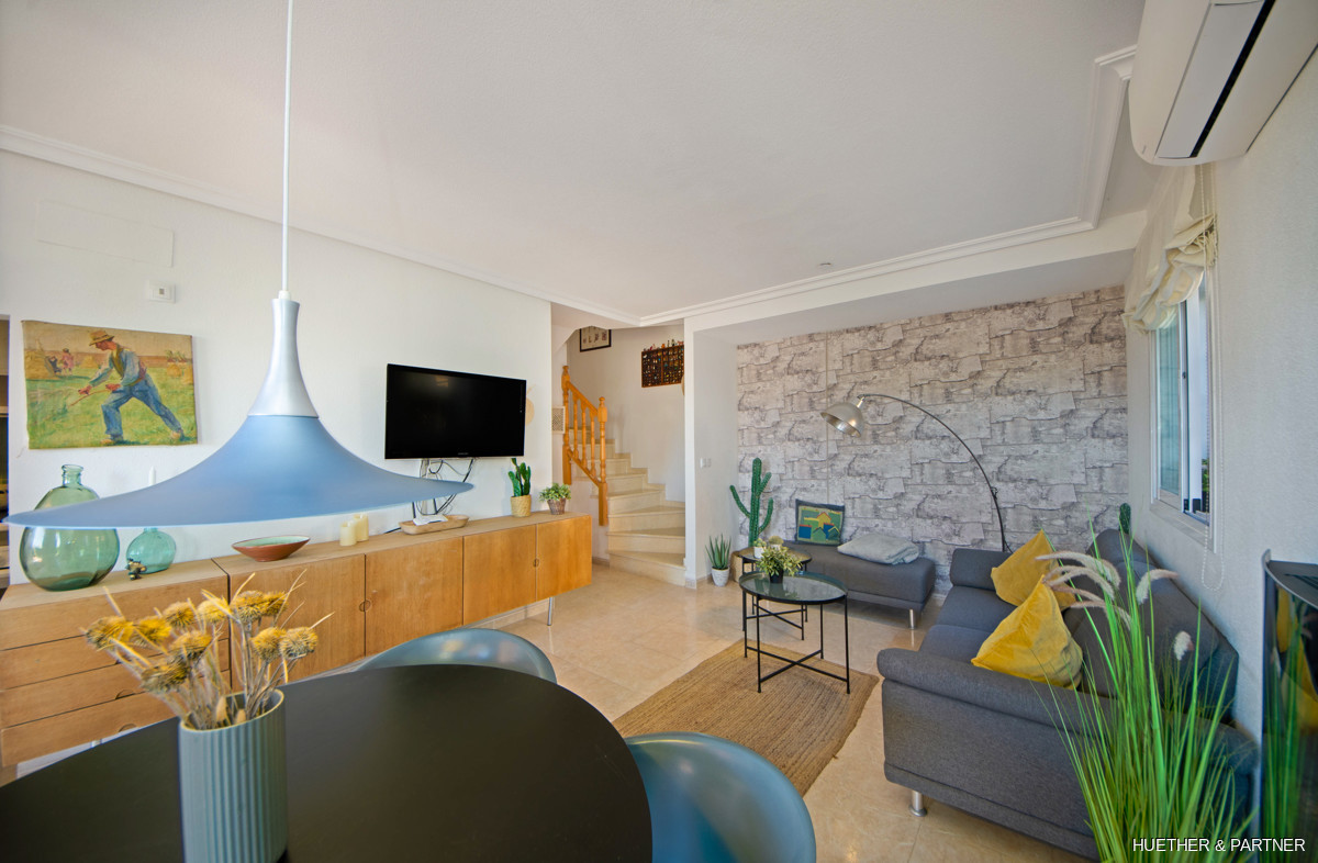 This charming end row house offers a blend of comfort and style in a well-maintained community. The property features double-glazed sliding windows, aluminum shutters, and a modern air conditioning system. Enjoy the convenience of a new washing machine and dishwasher, along with an electric fireplace and built-in wardrobes. The living space is spread over two floors, featuring a spacious living/dining area with access to the veranda, a fully equipped kitchen, a bathroom, and a storage room.