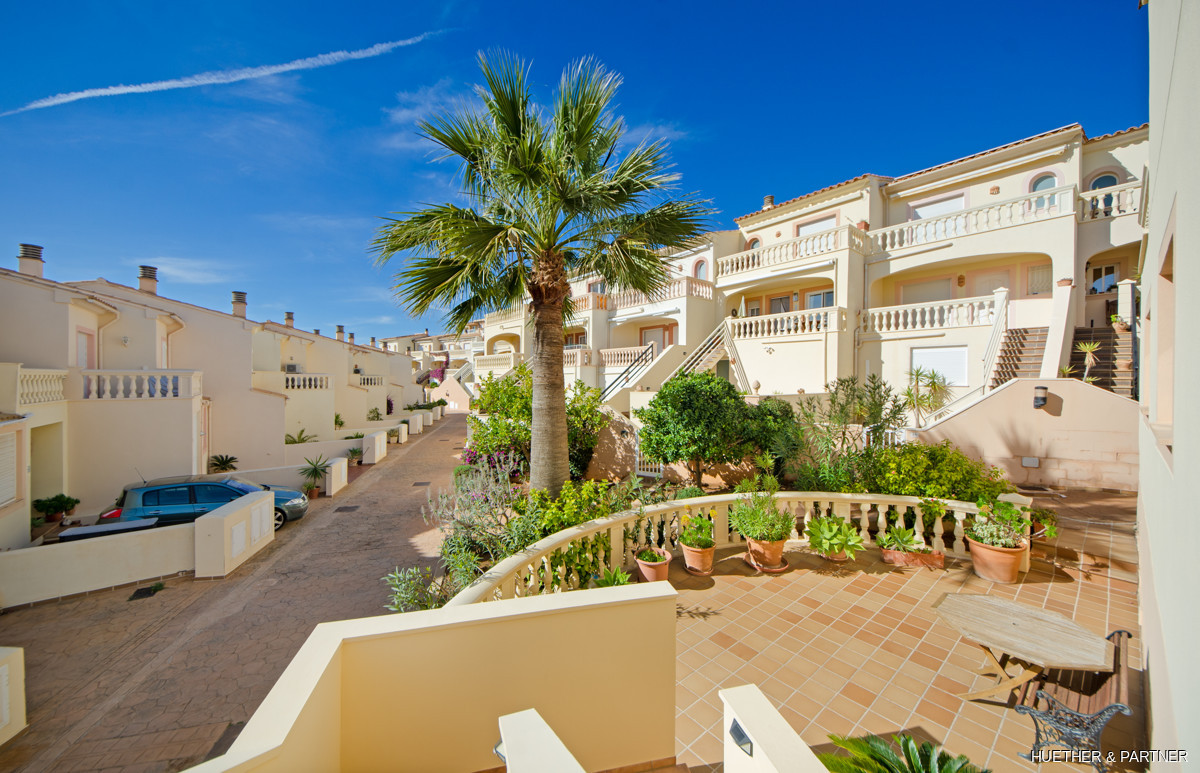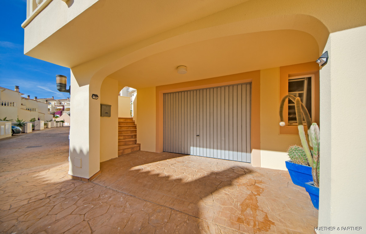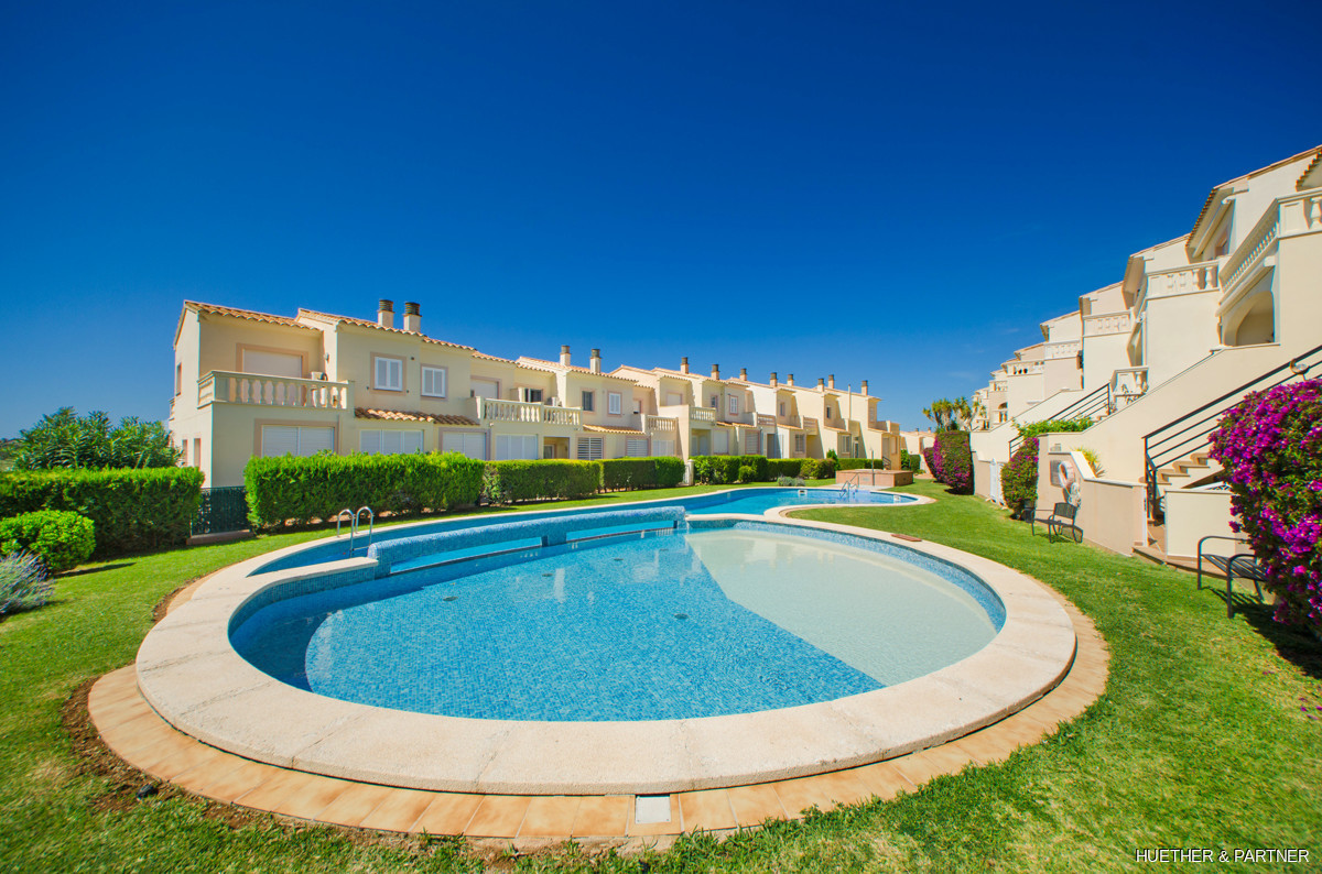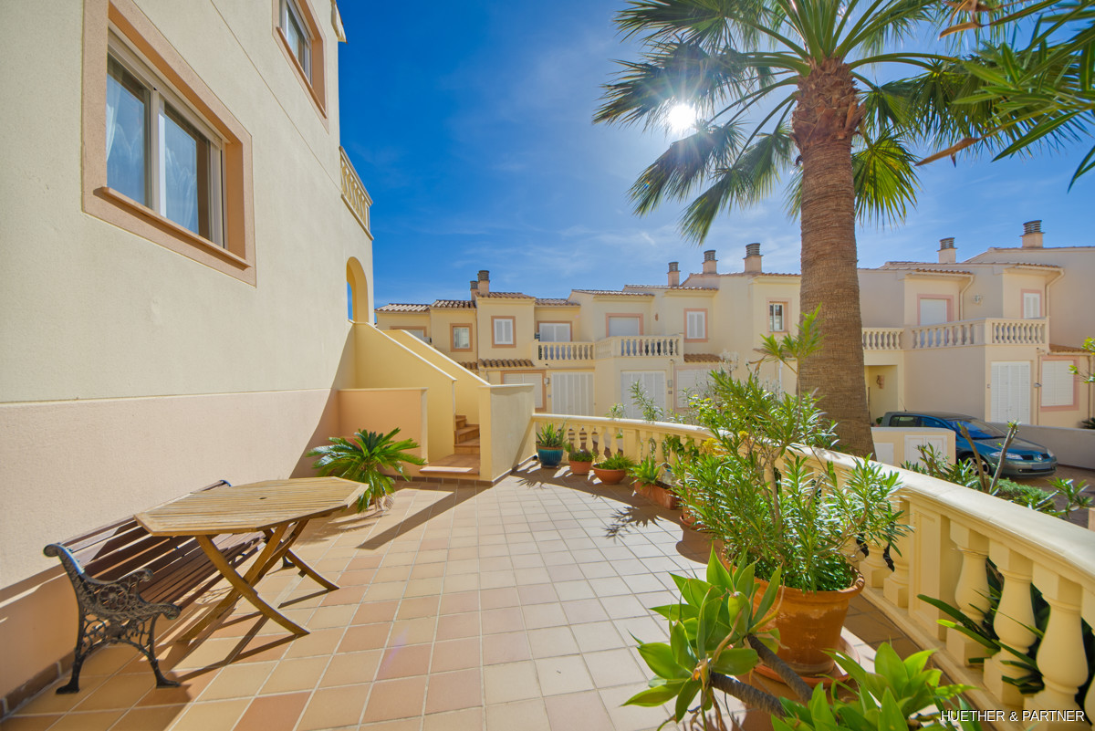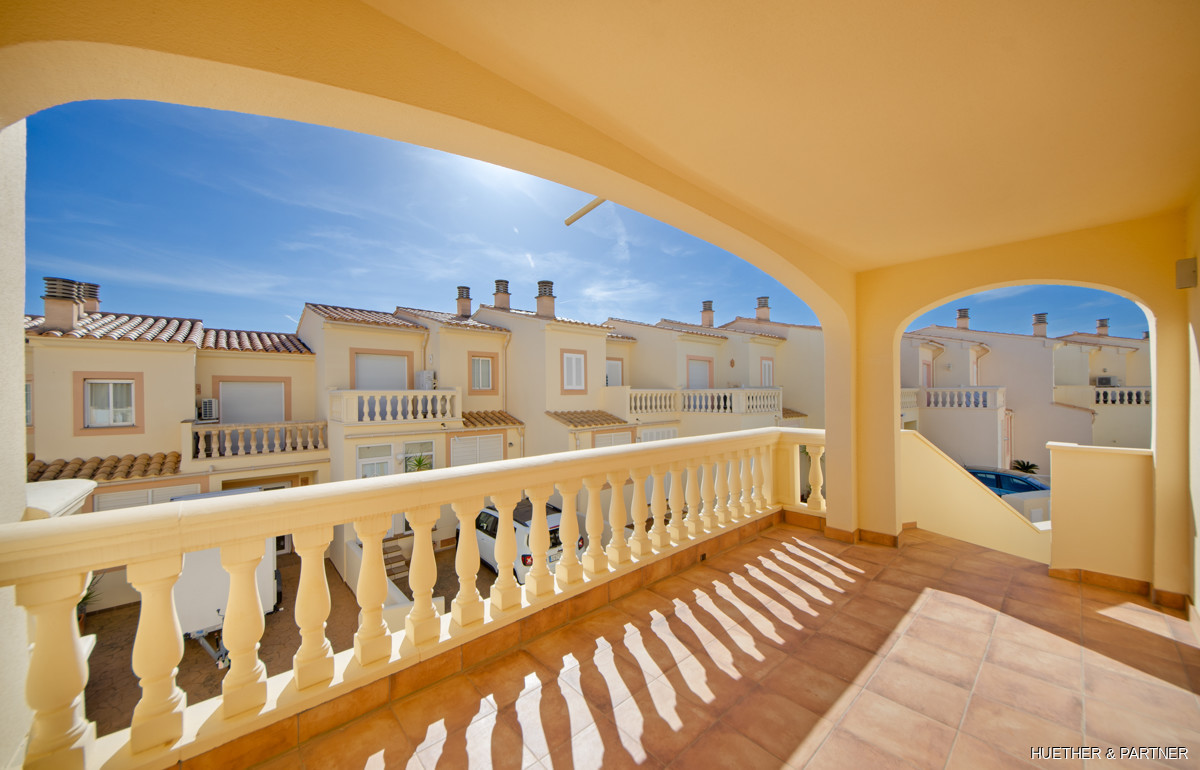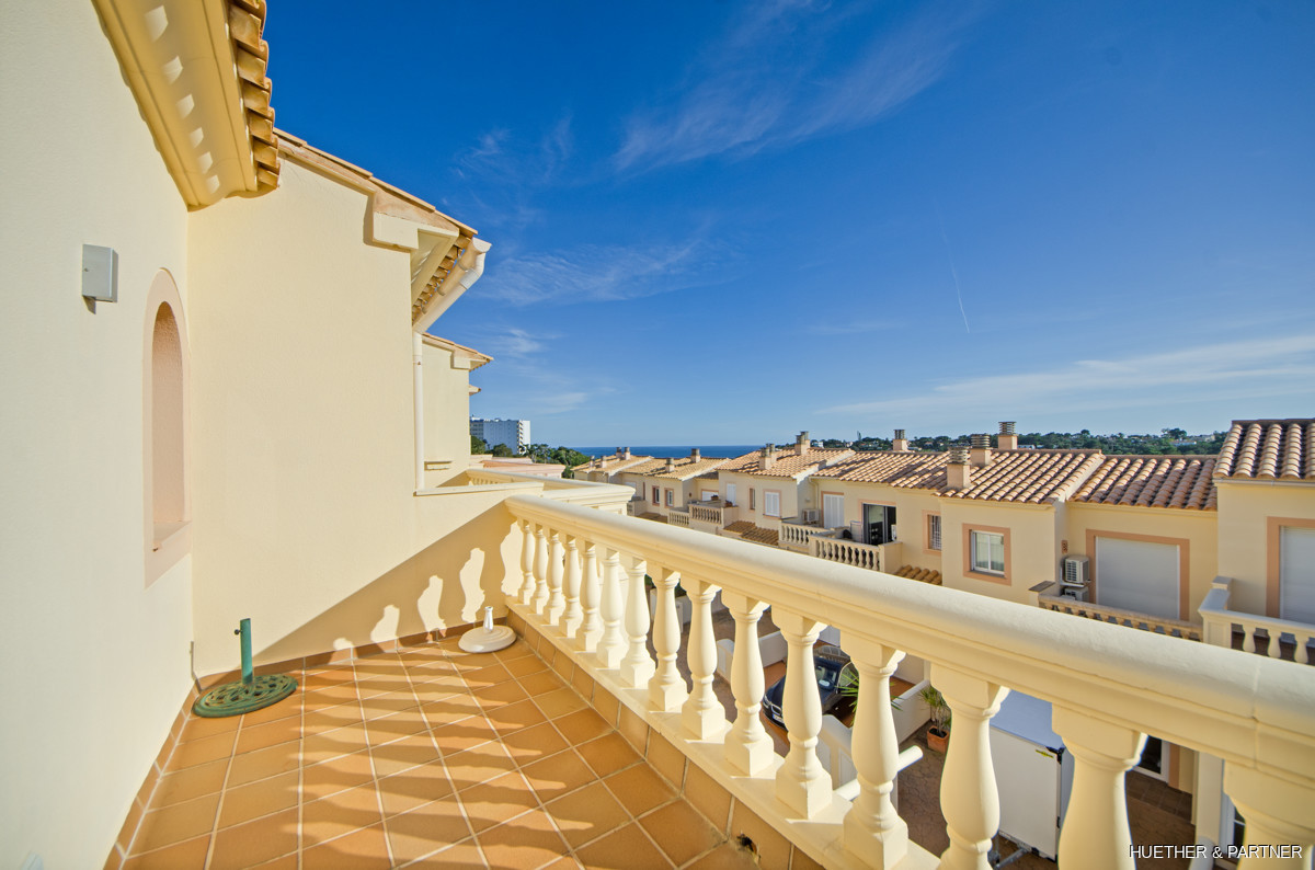 The main floor includes a spacious living/dining area, a kitchen with built-in appliances, and a guest WC. Upstairs, two bedrooms each have a private terrace and built-in wardrobes, along with a bathroom featuring a corner bathtub. The rooftop terrace offers stunning views of the sea and the Sant Salvador monastery. The complex is gated, ensuring privacy, and includes a communal pool not visible from the street. The beach and town center are a short 5-minute walk away.