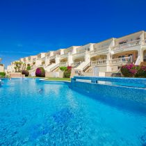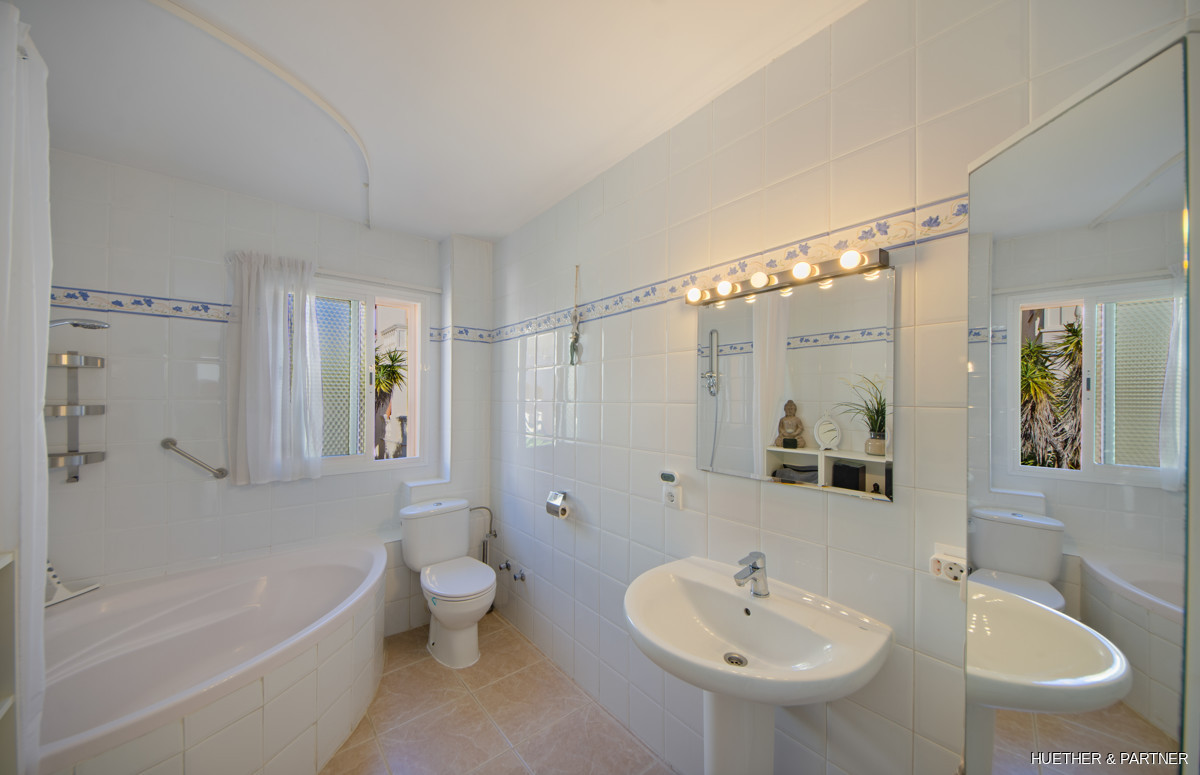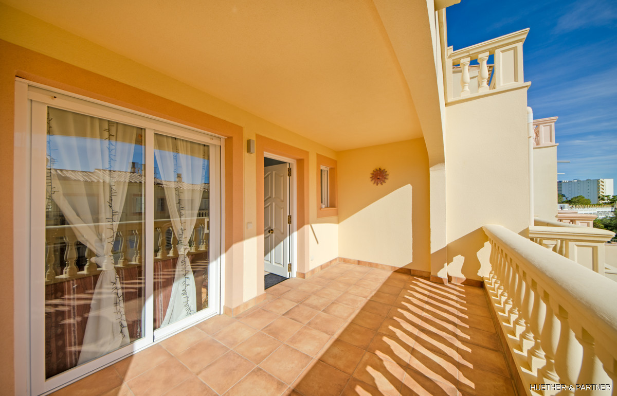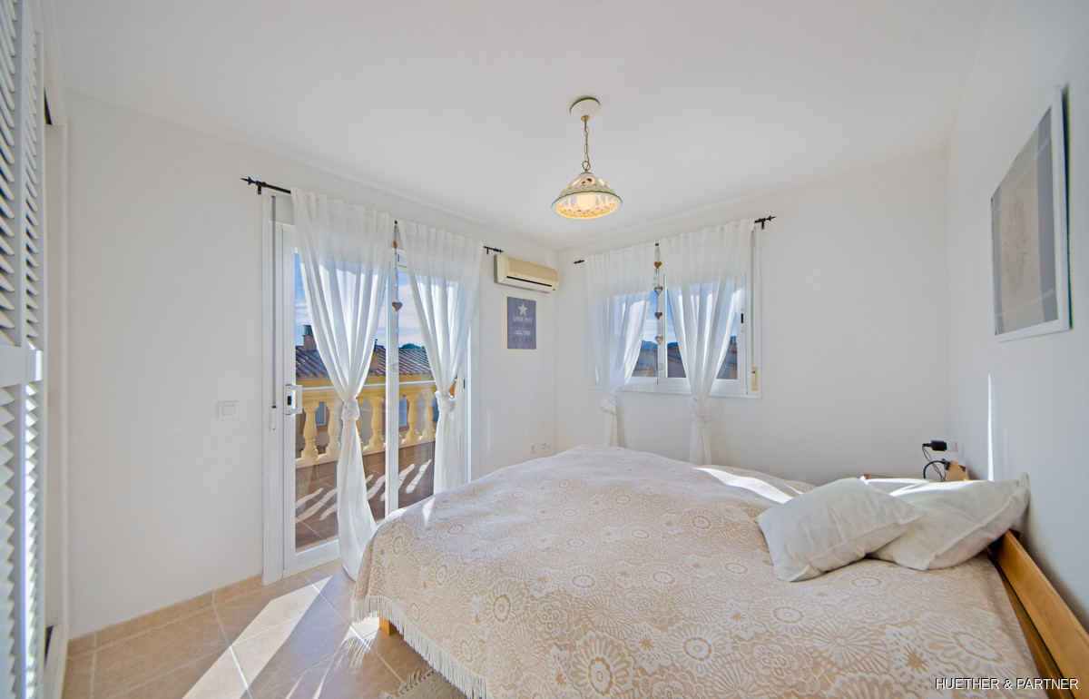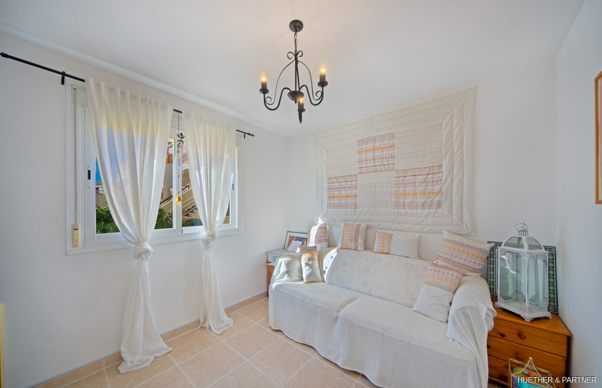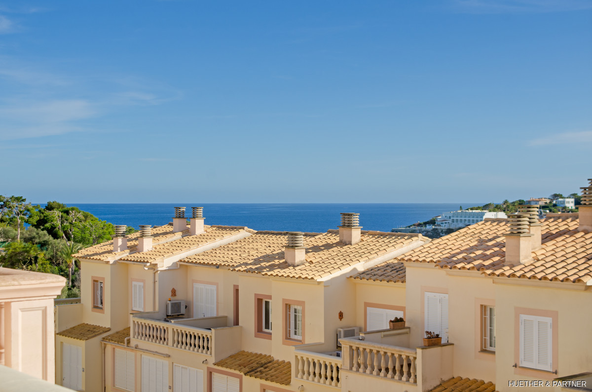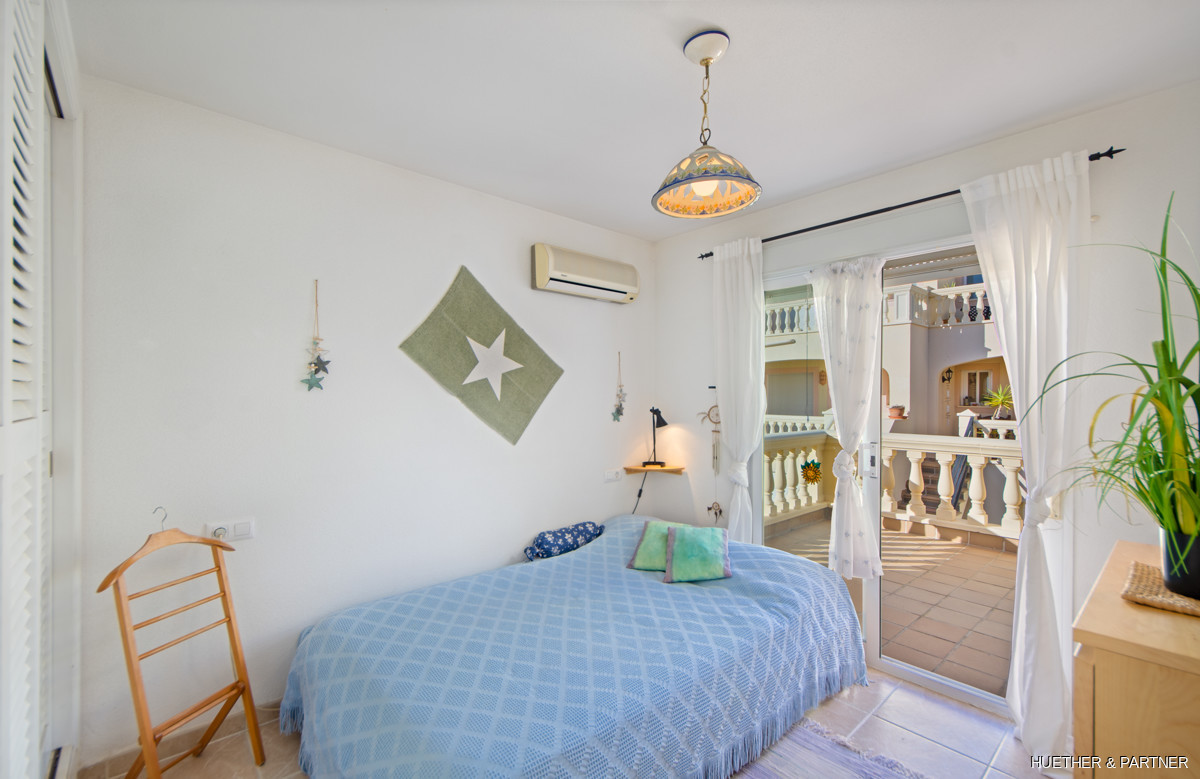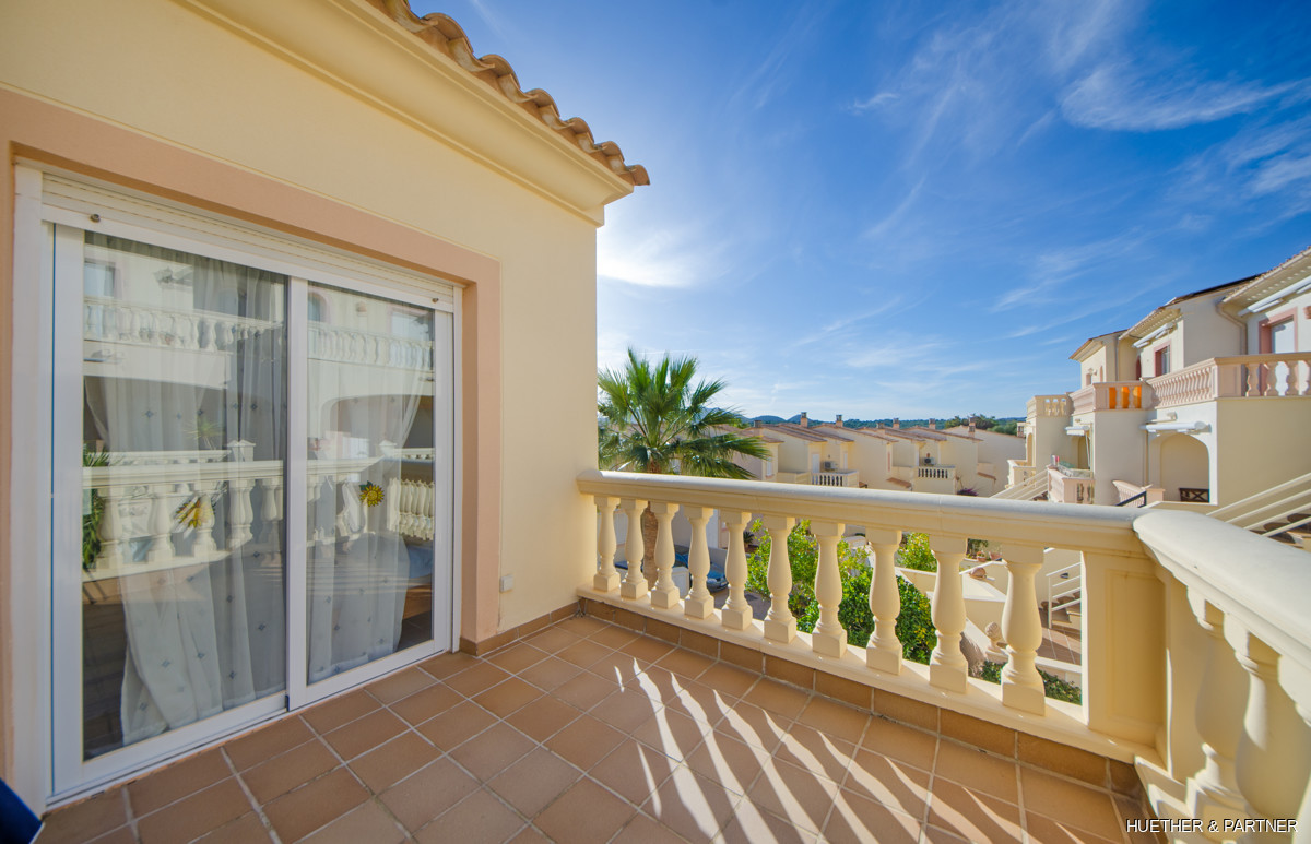 The main floor includes a spacious living/dining area, a kitchen with built-in appliances, and a guest WC. Upstairs, two bedrooms each have a private terrace and built-in wardrobes, along with a bathroom featuring a corner bathtub. The rooftop terrace offers stunning views of the sea and the Sant Salvador monastery. The complex is gated, ensuring privacy, and includes a communal pool not visible from the street. The beach and town center are a short 5-minute walk away.