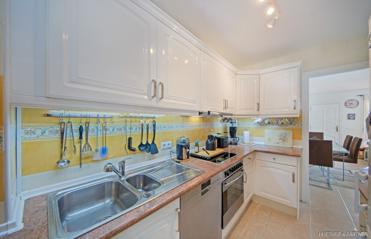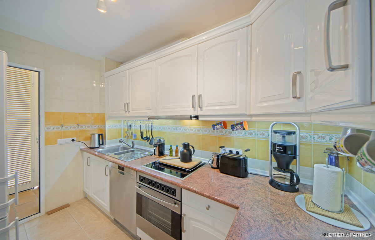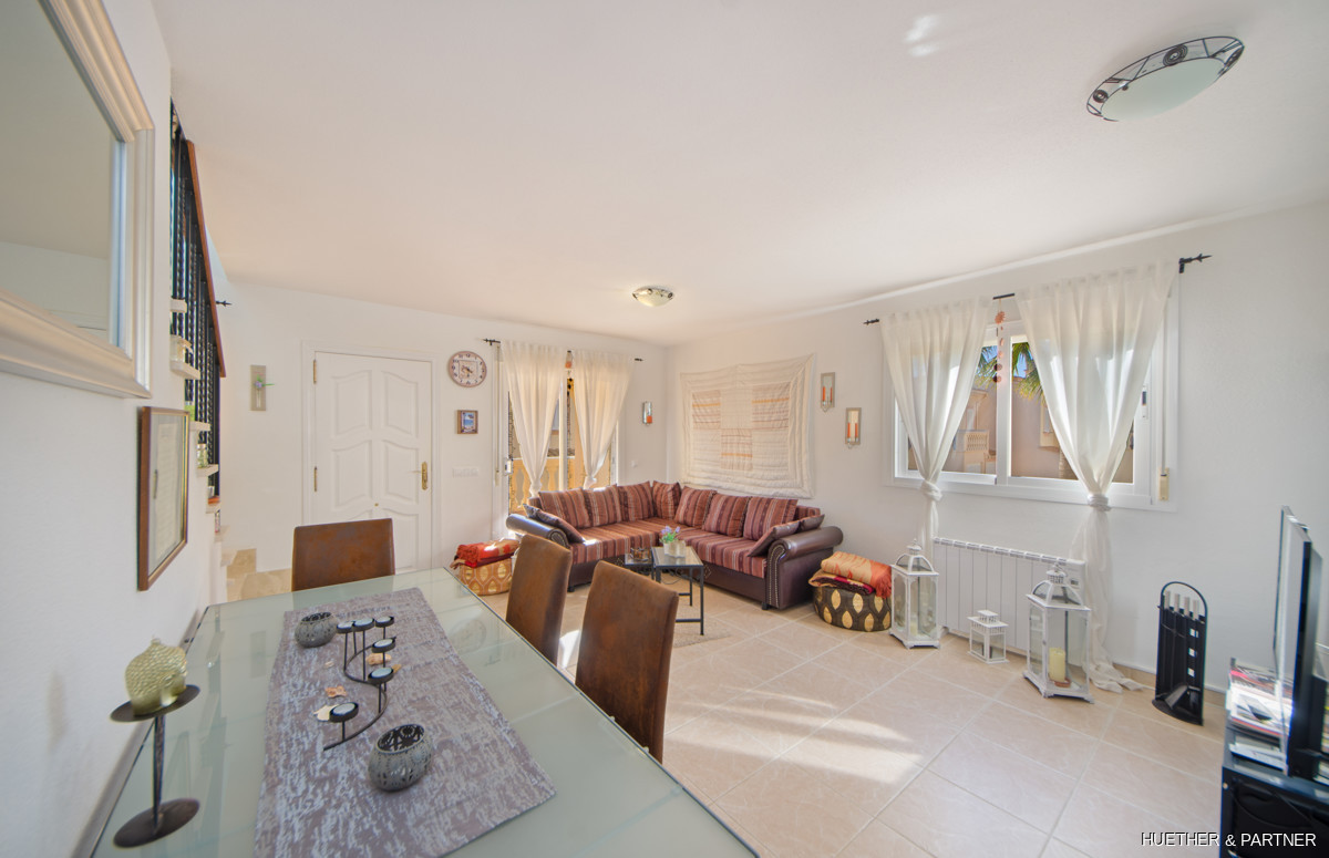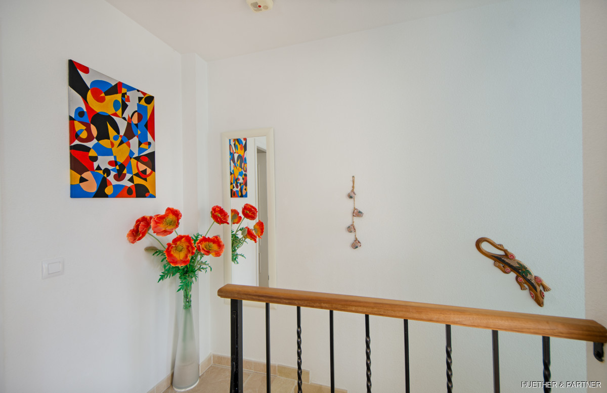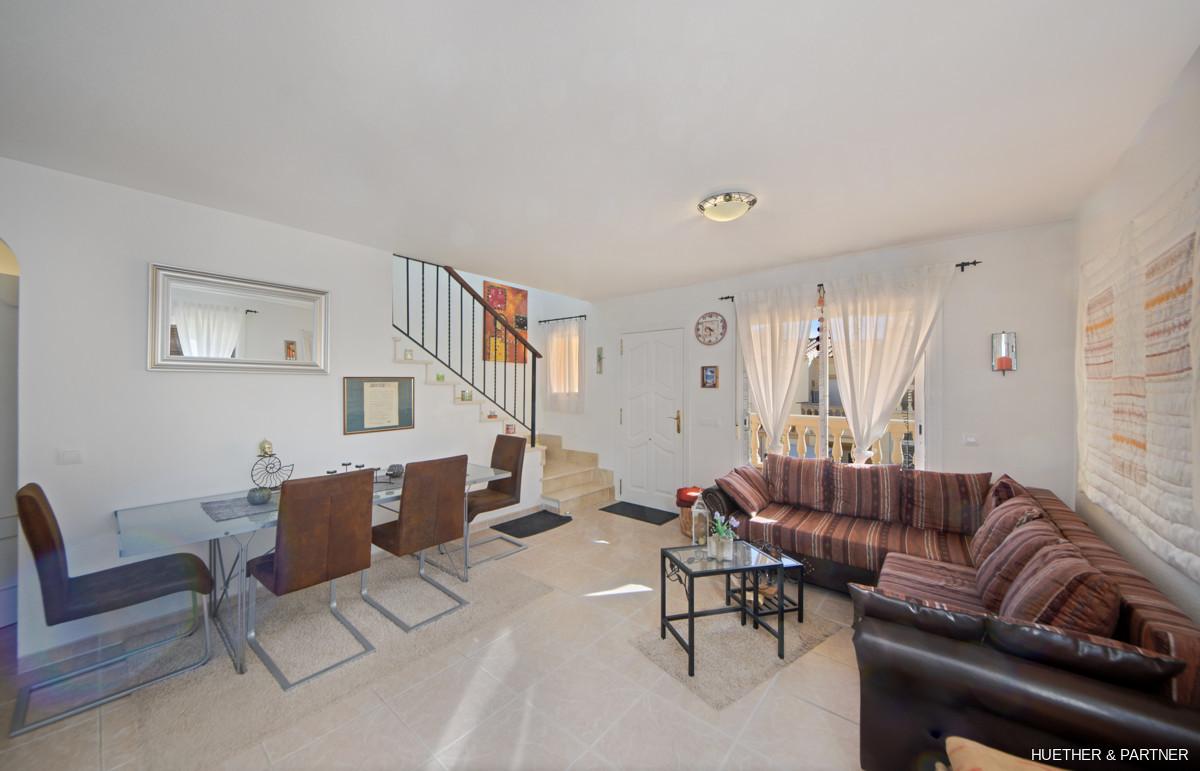 This beautiful end-terraced house in a well-maintained residential complex offers a large private double garage and is fully furnished, excluding personal items, decor, TV, stereo, and washing machine. The property features a newly tiled terrace and staircase, a fully renovated and tiled double garage, and an air conditioning system for both heating and cooling.