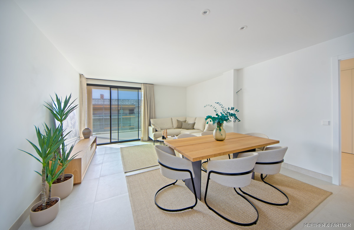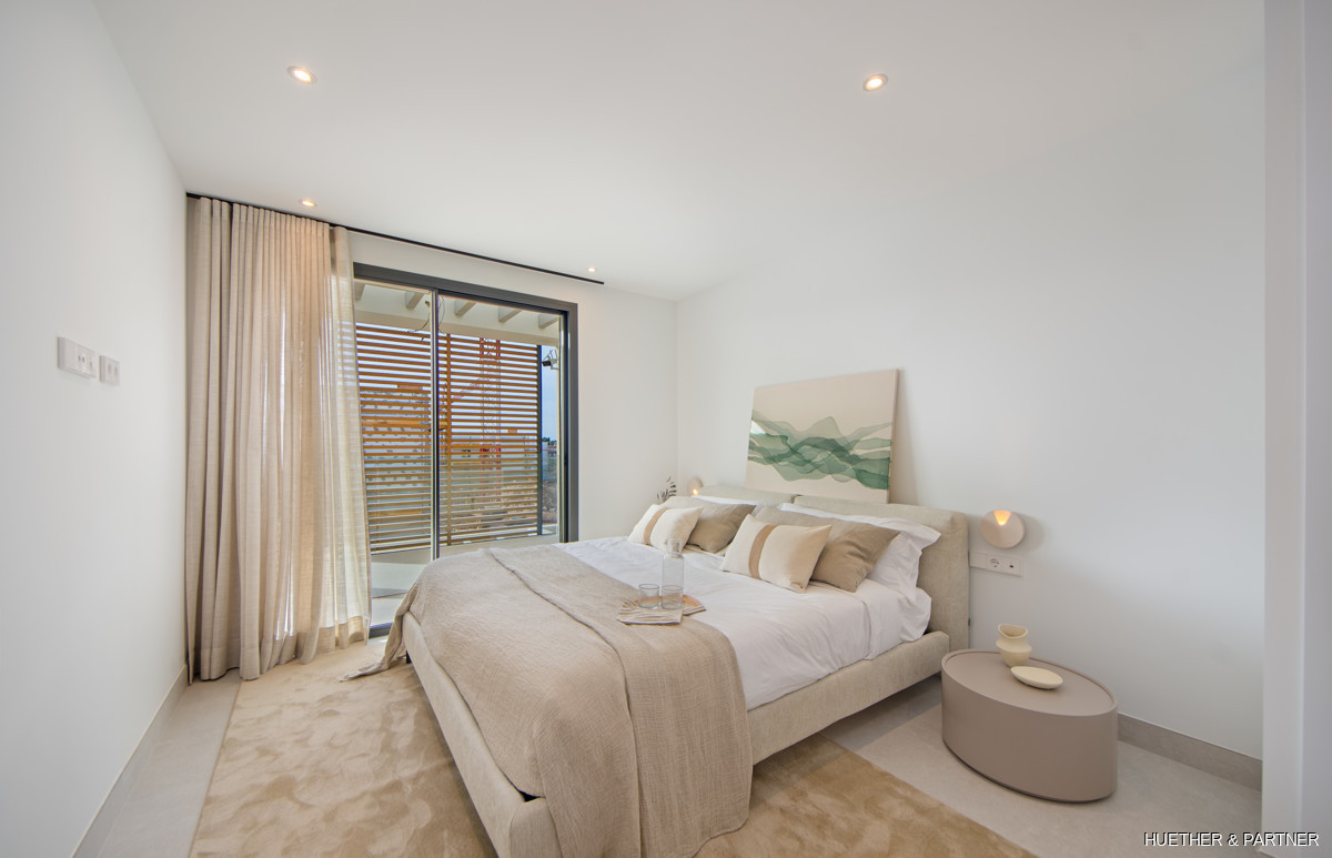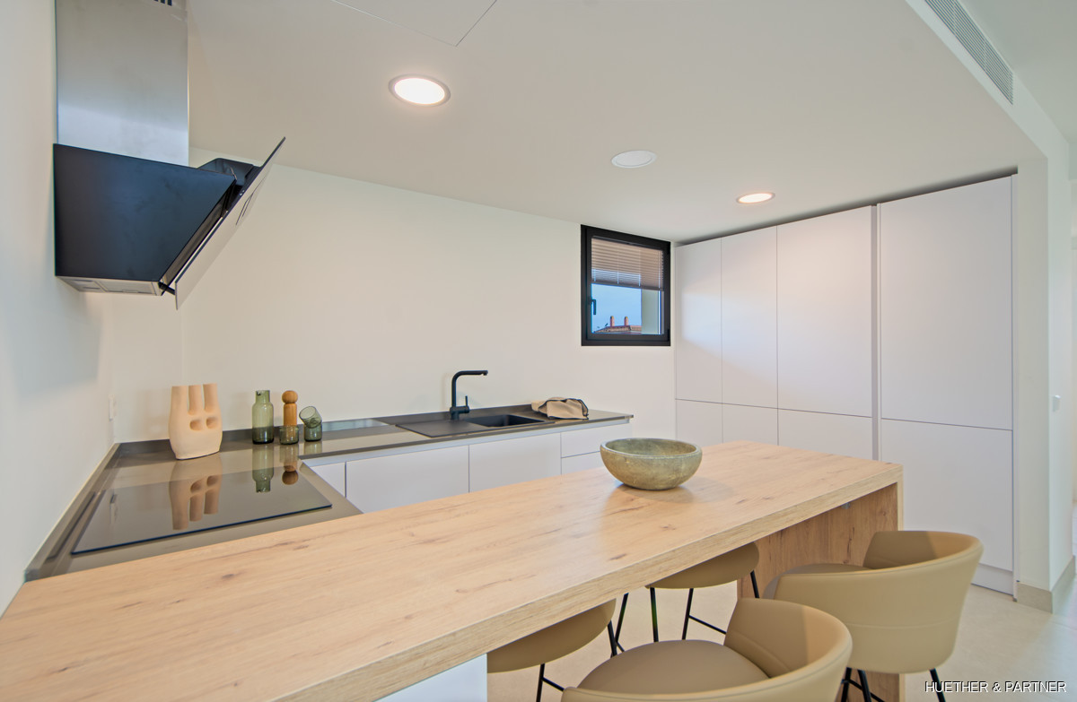 Additional amenities include a covered carport, private storage room, and an electric vehicle charging station. The community area invites an active lifestyle with its fitness center and beautiful surroundings. Embrace comfortable living all year round in this stunning development with 69 units, located close to three of Mallorcas most beautiful beaches.