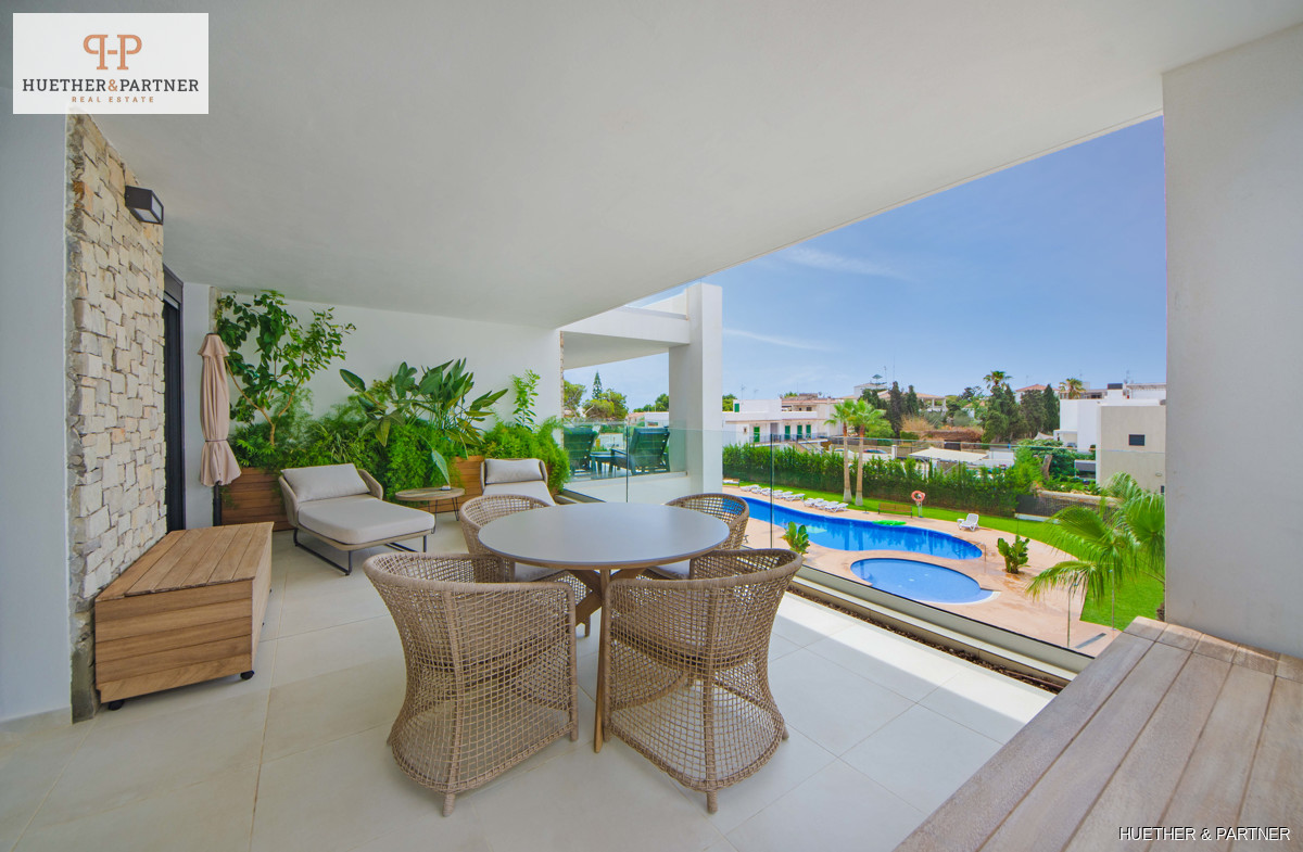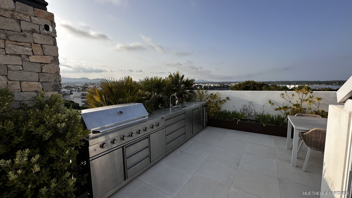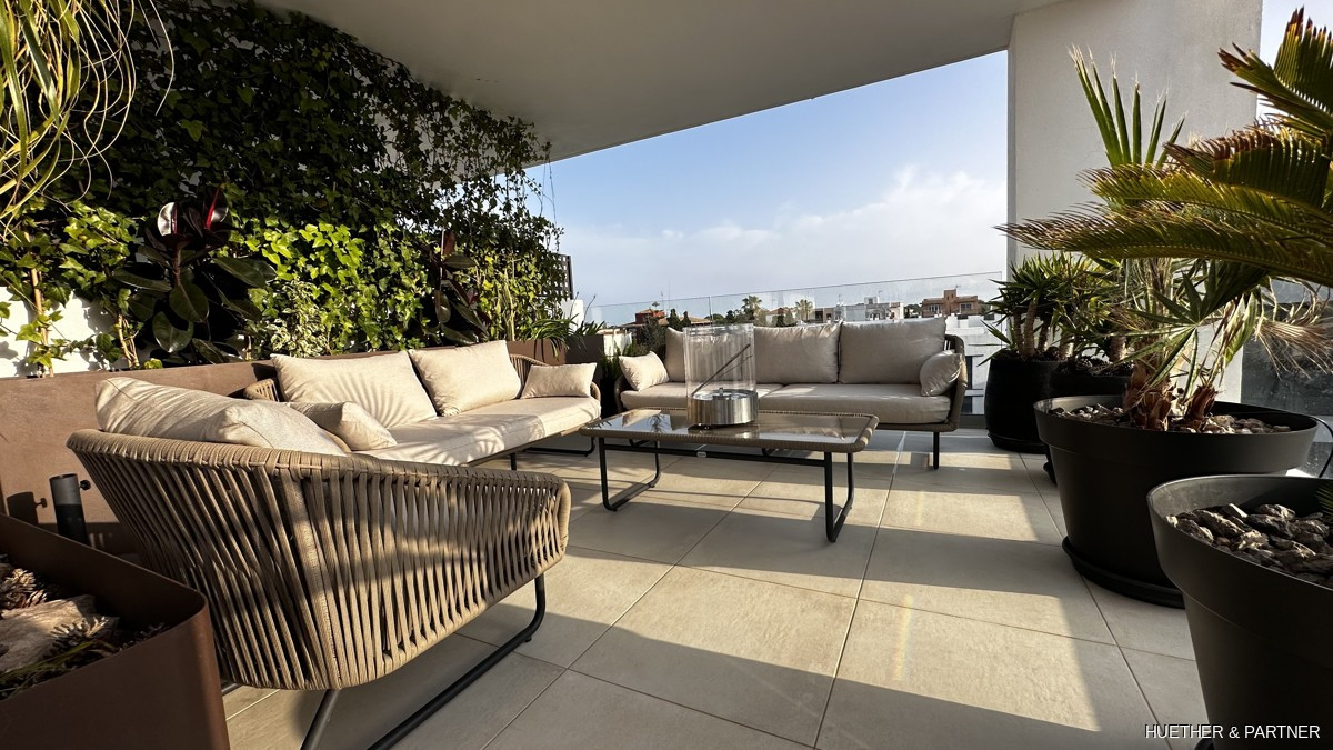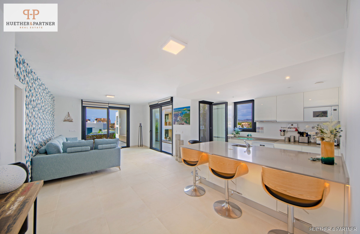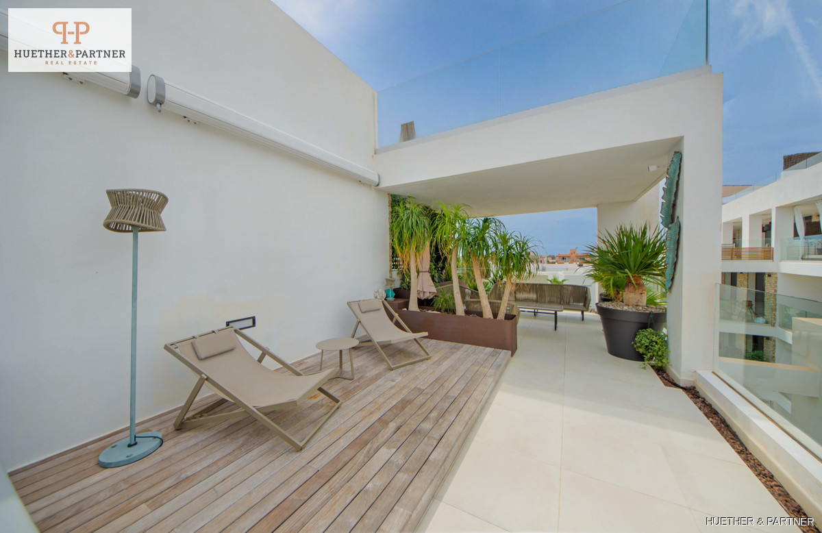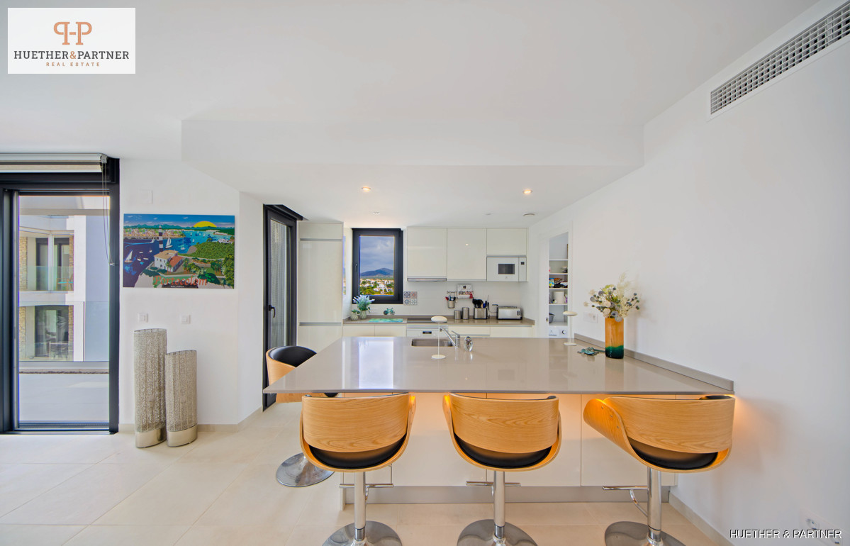 This luxurious penthouse in Portocolom offers a unique blend of modern design and exclusivity. It features two large balcony terraces adjoining the living area, a private rooftop terrace accessible via a staircase with a hydraulic lift roof, and a private whirlpool overlooking the largest natural harbor on the island. Fully furnished, including high-quality terrace furniture and glass balustrades, the penthouse also boasts a spacious living/dining area with an open kitchen, two bedrooms, and two bathrooms. The apartment comes with a climate control system through a duct, built-in wardrobes, and floor-level showers. Residents can enjoy the communal pool and a private covered parking space.