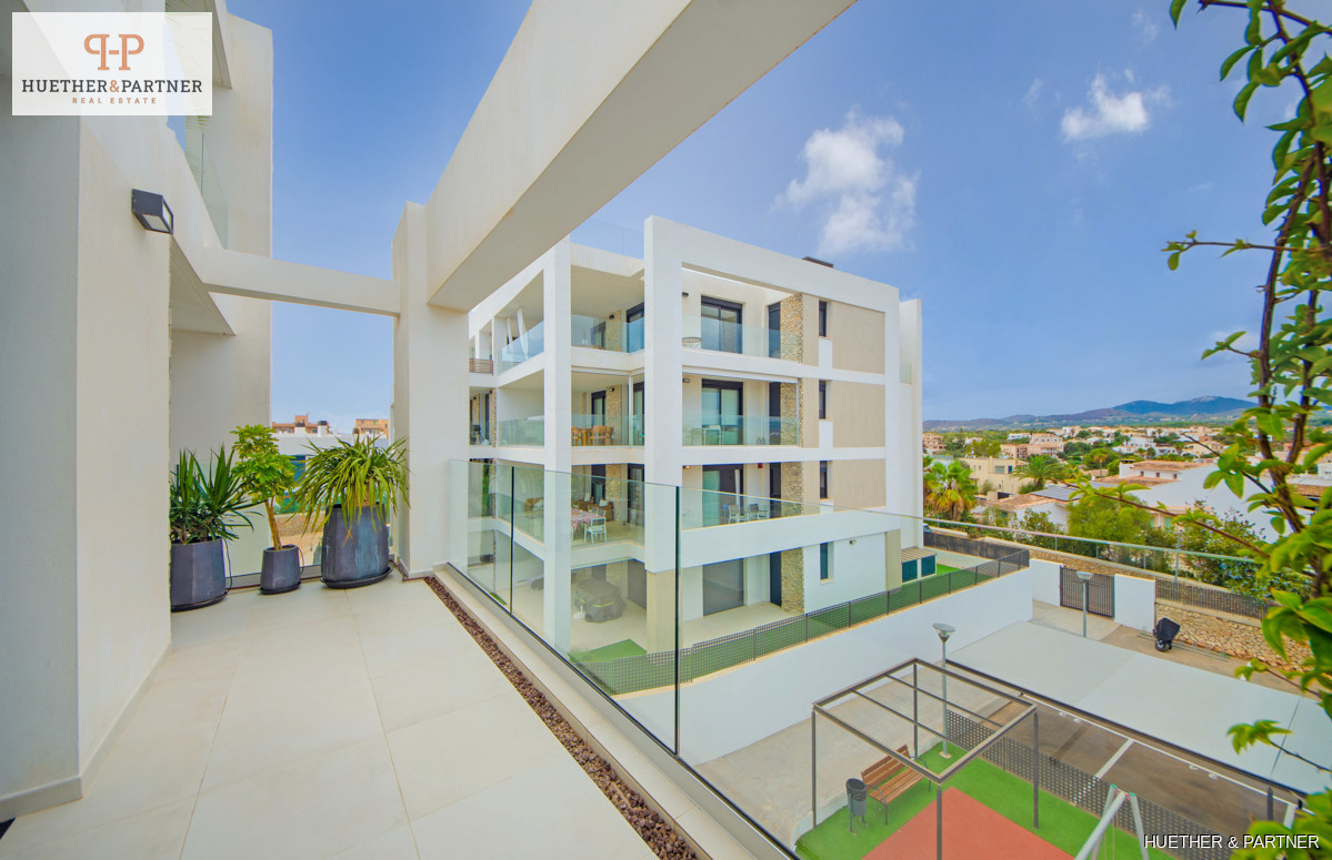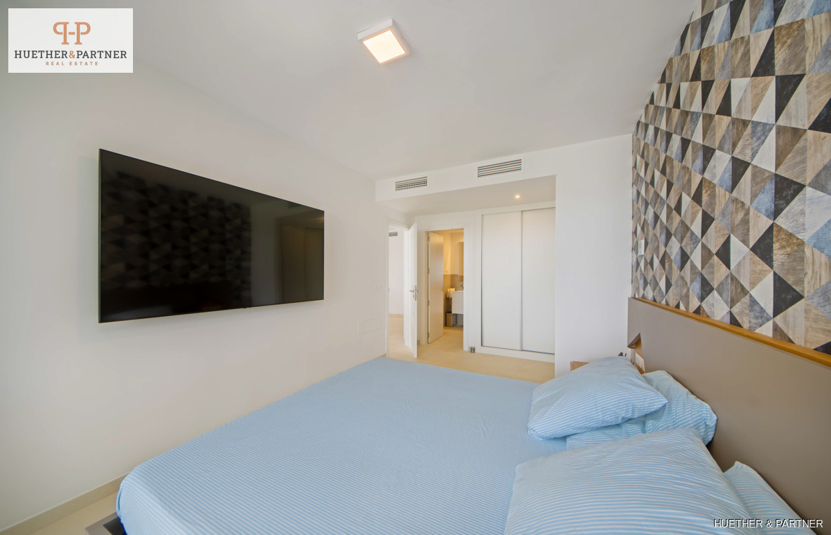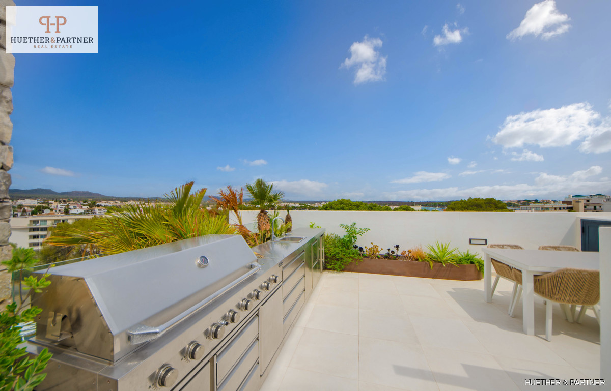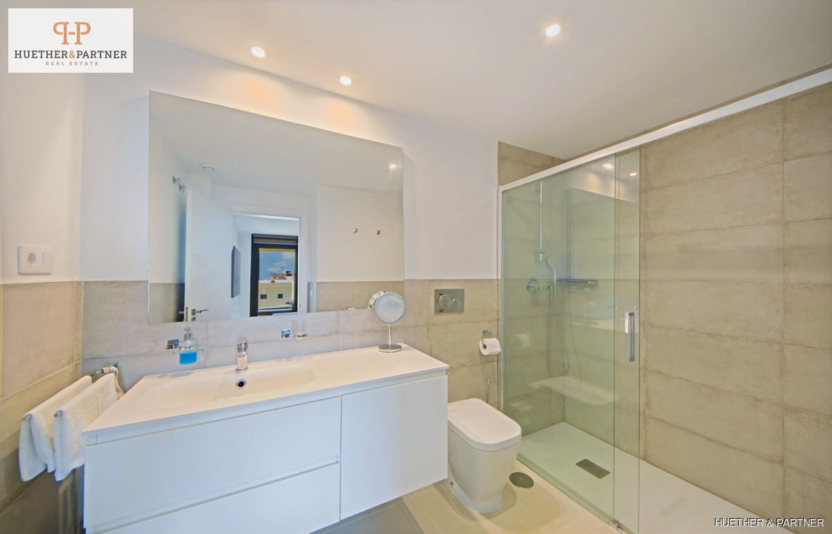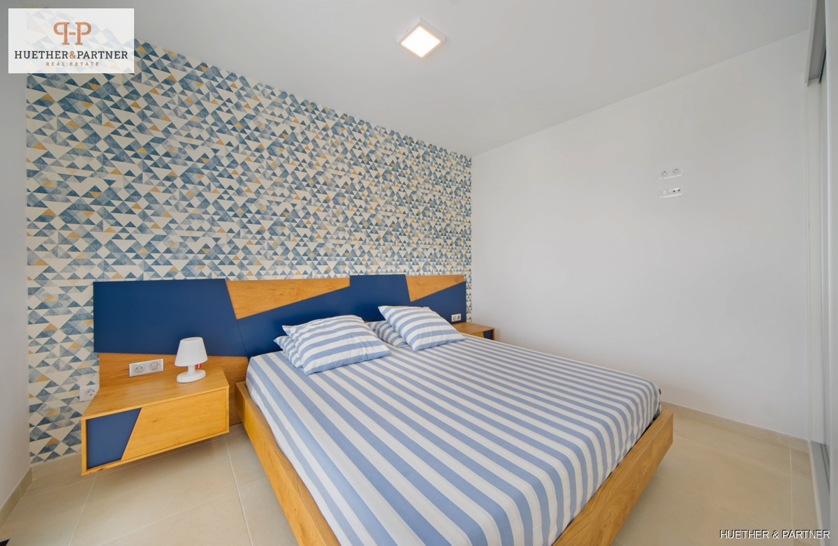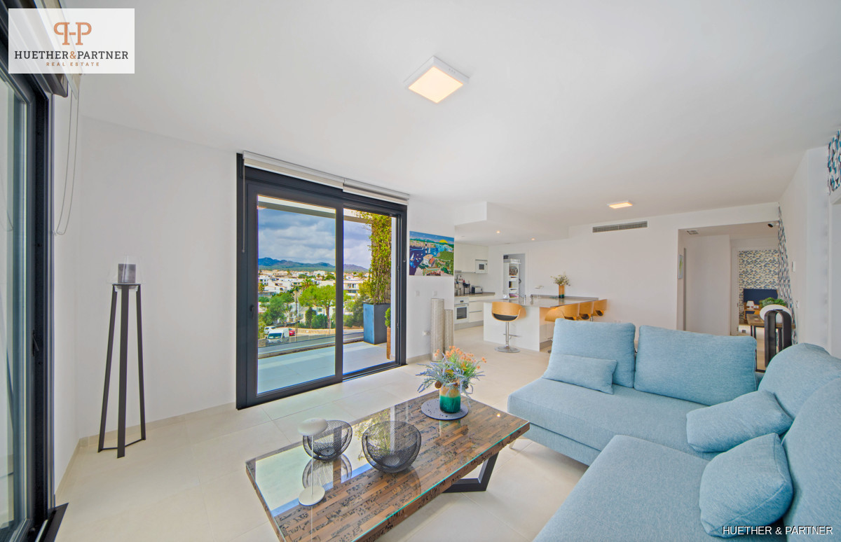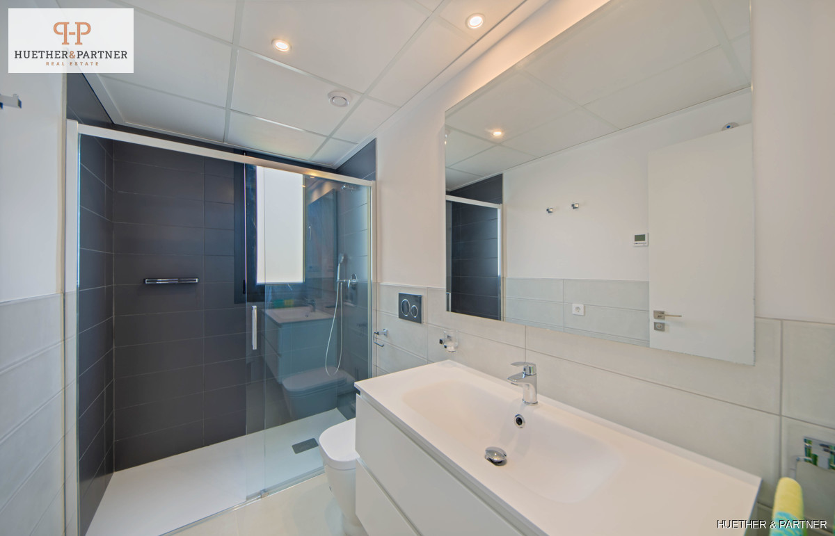 This luxurious penthouse in Portocolom offers a unique blend of modern design and exclusivity. It features two large balcony terraces adjoining the living area, a private rooftop terrace accessible via a staircase with a hydraulic lift roof, and a private whirlpool overlooking the largest natural harbor on the island. Fully furnished, including high-quality terrace furniture and glass balustrades, the penthouse also boasts a spacious living/dining area with an open kitchen, two bedrooms, and two bathrooms. The apartment comes with a climate control system through a duct, built-in wardrobes, and floor-level showers. Residents can enjoy the communal pool and a private covered parking space.