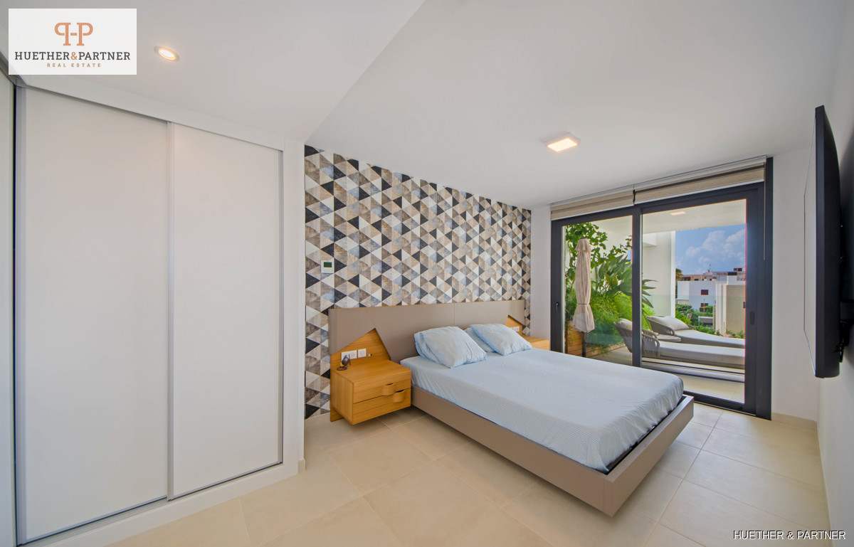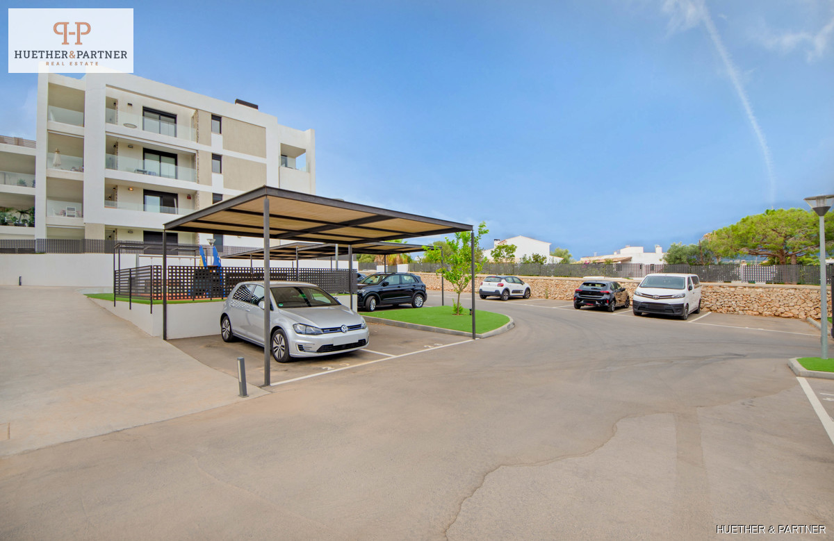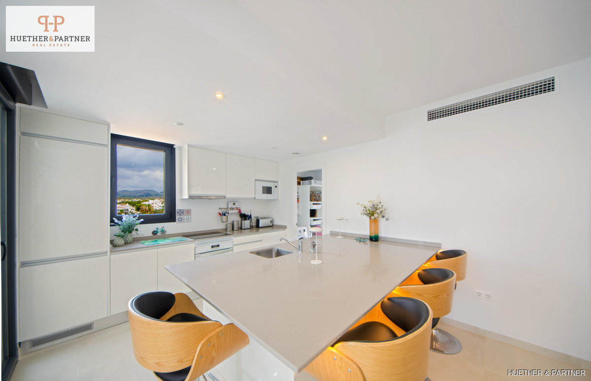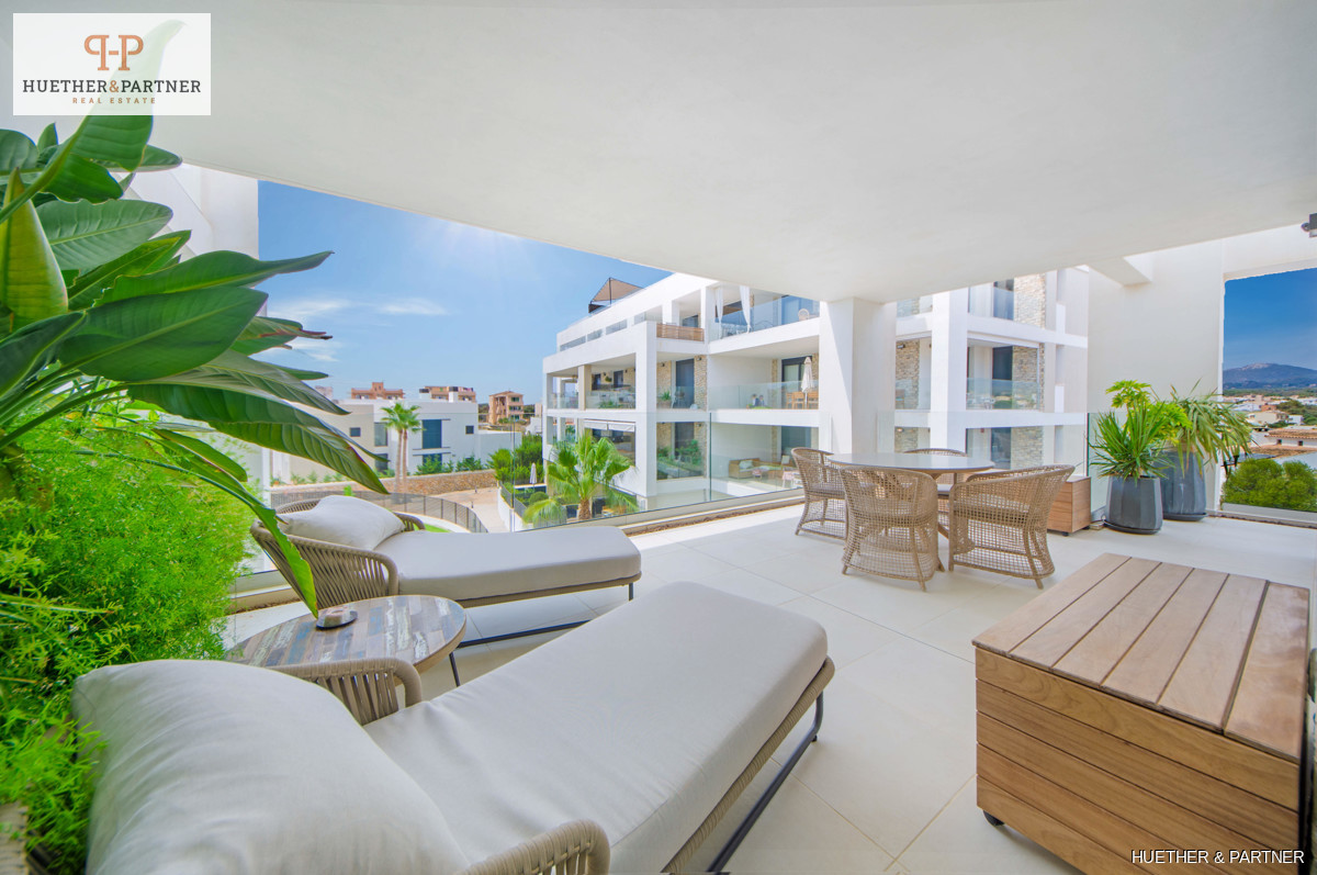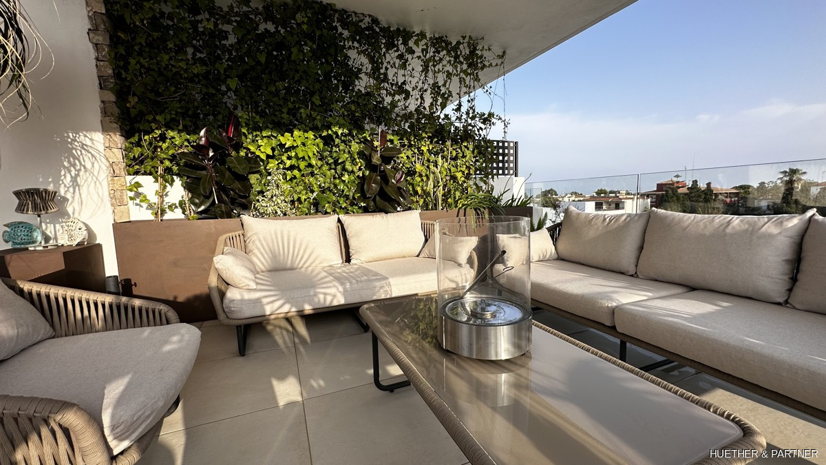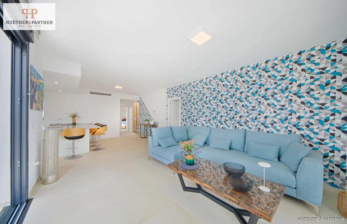 This luxurious penthouse in Portocolom offers a unique blend of modern design and exclusivity. It features two large balcony terraces adjoining the living area, a private rooftop terrace accessible via a staircase with a hydraulic lift roof, and a private whirlpool overlooking the largest natural harbor on the island. Fully furnished, including high-quality terrace furniture and glass balustrades, the penthouse also boasts a spacious living/dining area with an open kitchen, two bedrooms, and two bathrooms. The apartment comes with a climate control system through a duct, built-in wardrobes, and floor-level showers. Residents can enjoy the communal pool and a private covered parking space.