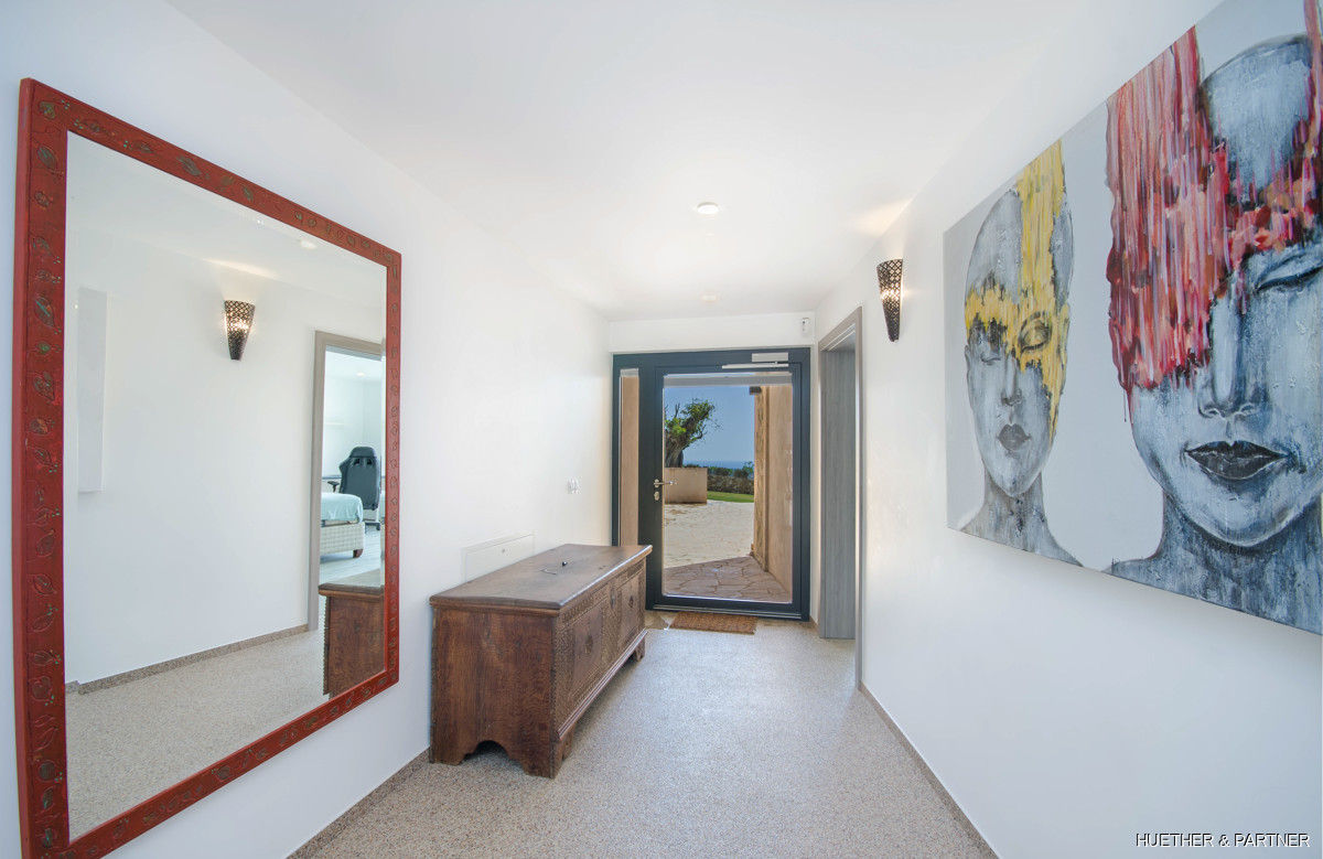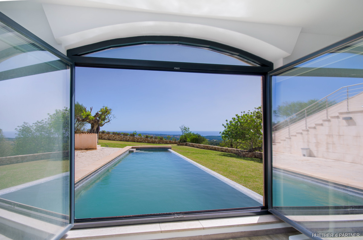 This exclusive luxury villa in Manacor offers a stunning panoramic sea view and is nestled in a serene natural reserve. The property boasts a heated pool powered by a heat pump, with features like automatic covering, multi-color lighting, and a 35m2 area. The villa spans 354m2, including four spacious bedrooms, each with an en-suite bathroom. On the ground floor, two bedrooms have direct access to the pool area. An expansive living area with panoramic windows and an open-plan kitchen equipped with Neff and Smeg appliances provides an ideal space for relaxation and entertainment.