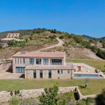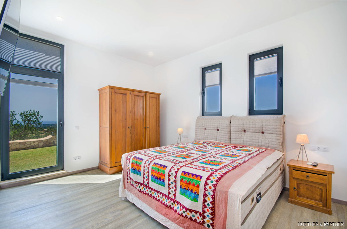 The first-floor master suite includes a dressing area and opens onto a vast terrace with unparalleled views. Additional features include a large office or potential fitness room, a utility room, and a guest WC. The property is equipped with double-glazed ALU windows, solar panels for hot water, a 30,000L water reservoir from a private well, and automatic garden irrigation. This villa offers privacy and tranquility, with a guarantee of no further construction in the vicinity.