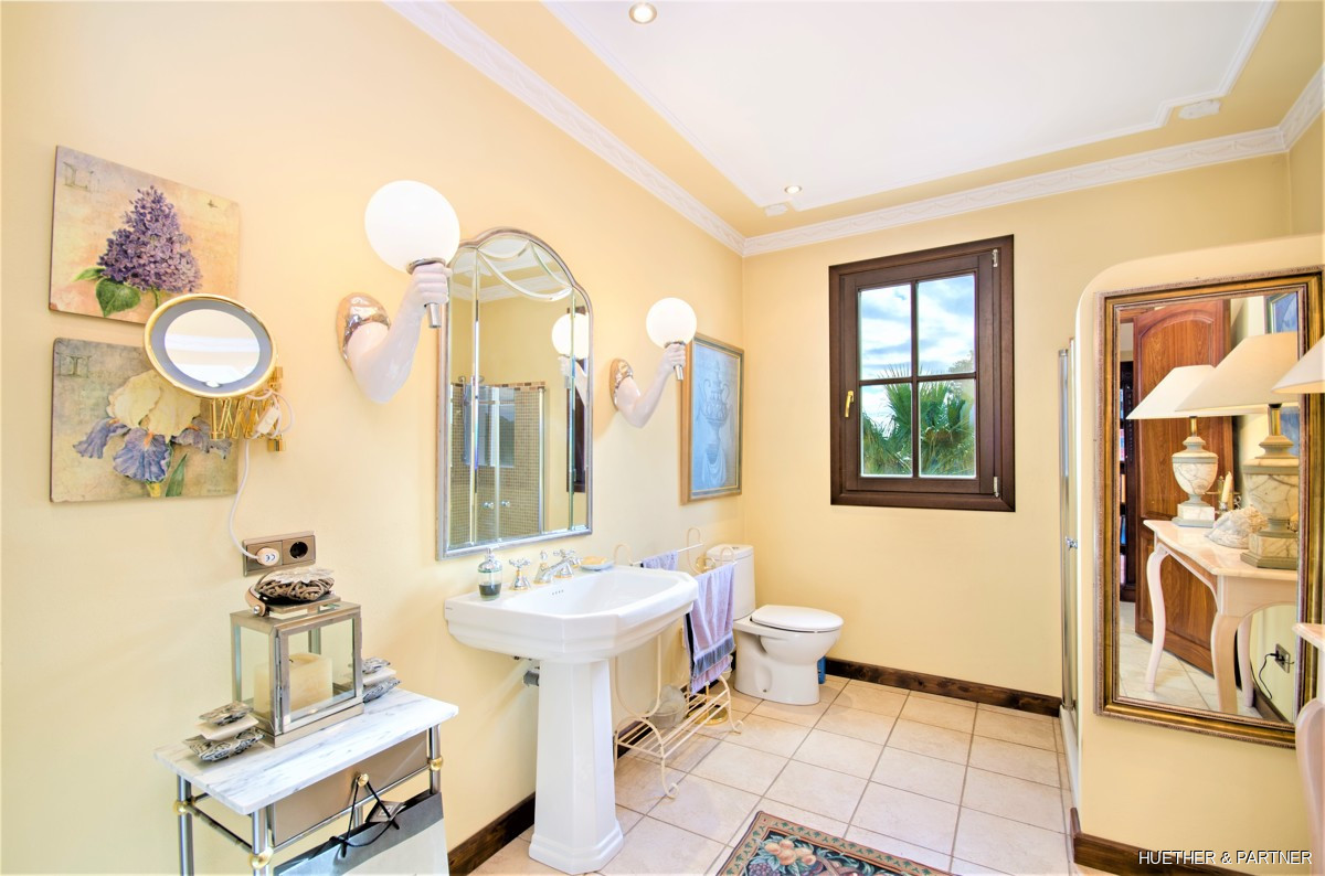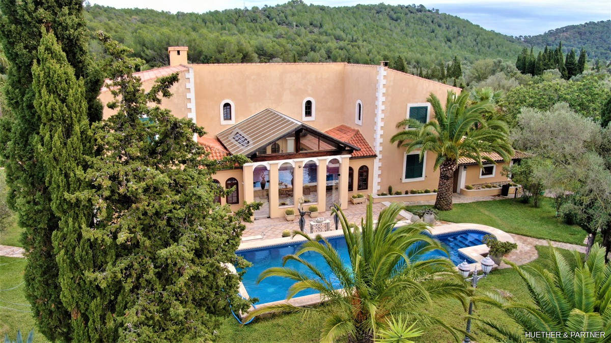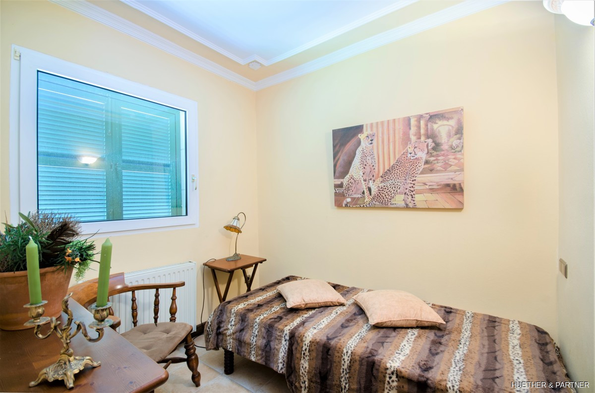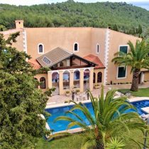 This extraordinary villa in Arta boasts an impressive layout with top-notch amenities. The ground floor features a spacious living and dining room with a fireplace and a modern country-style kitchen, also equipped with a cozy fireplace nook. Both rooms open to a patio, which is protected by a glass roof, creating a stunning winter garden with pool views. The two-bedroom suites, located on the upper floor, include a work/living area and a luxurious bathroom with a freestanding bathtub inspired by historical designs.