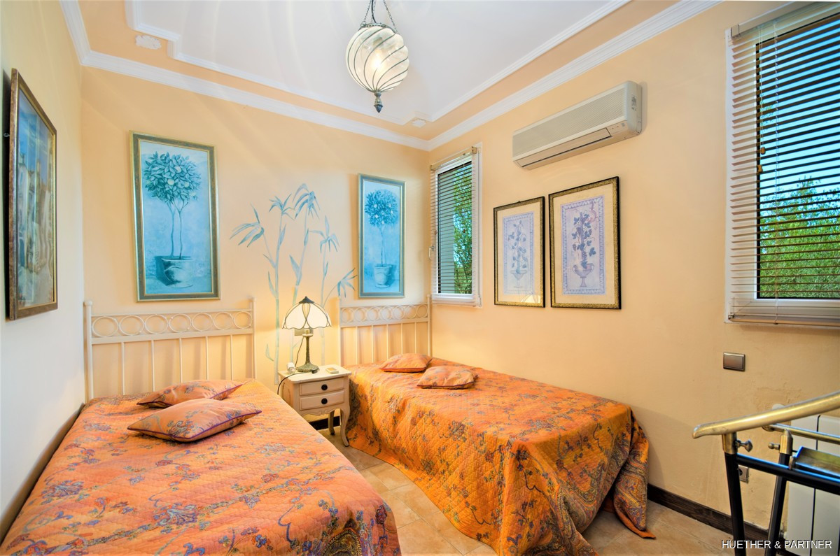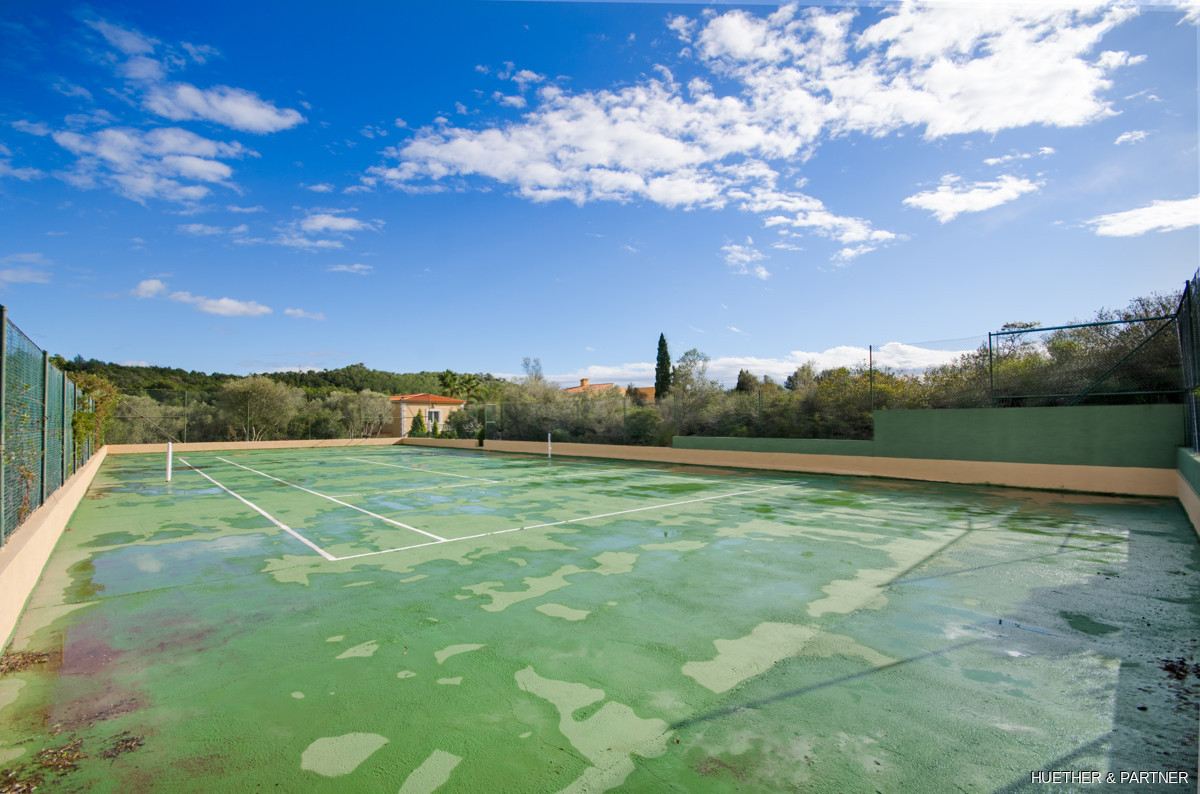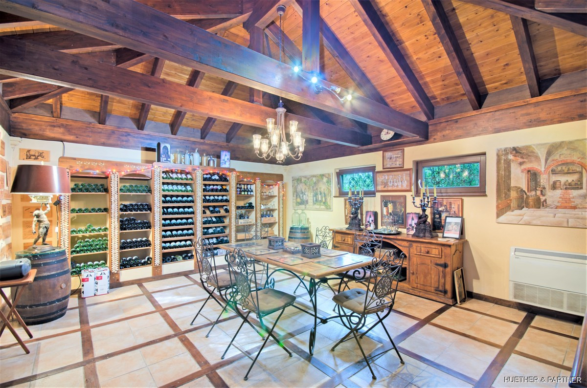 The property includes a beautifully landscaped garden, a pavilion, and various terraces surrounding a 10m x 5m pool. Additional features are a private wine cellar, a tennis court, a guesthouse, and a double garage with a heating room, all situated away from the main house. The villa is fully air-conditioned, equipped with central and underfloor heating, and custom-made wooden windows and doors with double glazing, ensuring comfort and exclusivity.