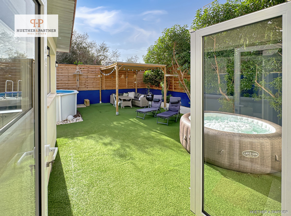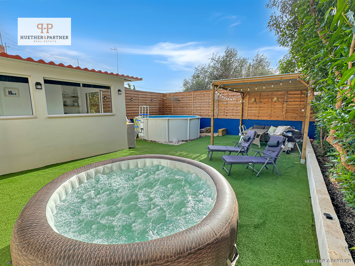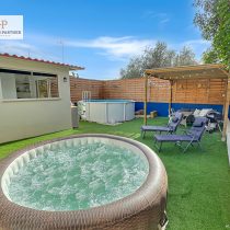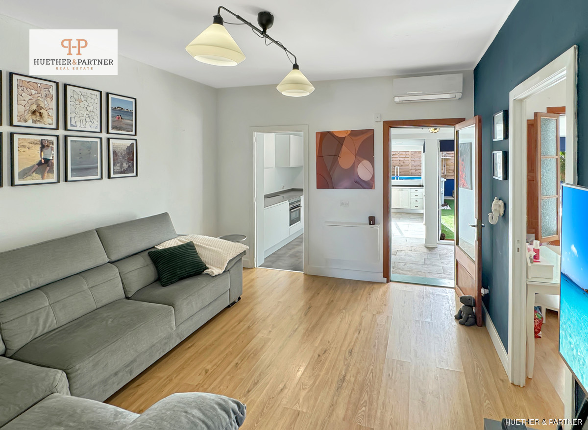 This charming Mediterranean-style village house is located near the famous Es Trenc beach in southern Mallorca. Situated on a 249 sqm plot, the house offers a constructed area of approximately 123 sqm, although the actual living space may be larger according to the owner. The property includes a master bedroom, two smaller bedrooms, a versatile room used as a study or playroom, two bathrooms (one en suite), a living area, a sunroom with a cozy sitting area, and a large courtyard featuring an outdoor seating area and an above-ground pool.