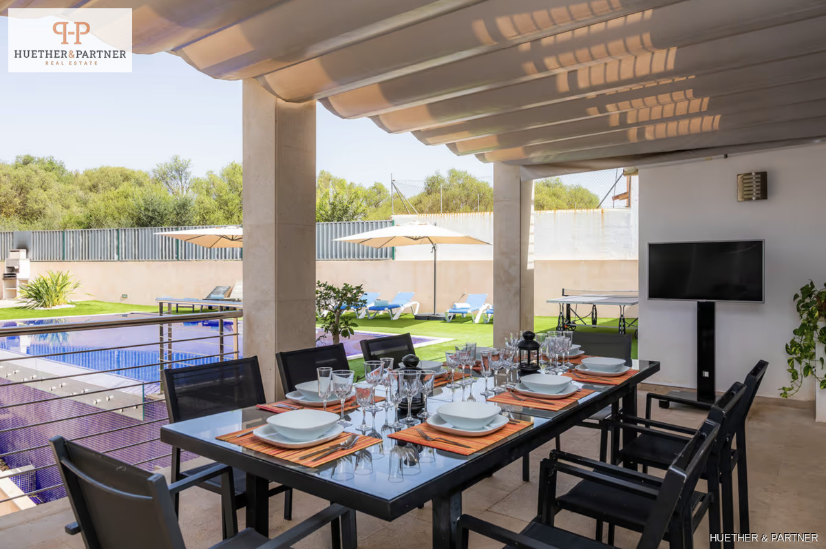 This exquisite two-story villa, located on the outskirts of Felanitx, offers a perfect blend of luxury and functionality. With an ETV license, it accommodates up to 8 guests and includes a spacious living and dining area featuring a large aquarium. The modern kitchen is fully equipped with high-gloss fronts, and the property boasts four bedrooms and four bathrooms.