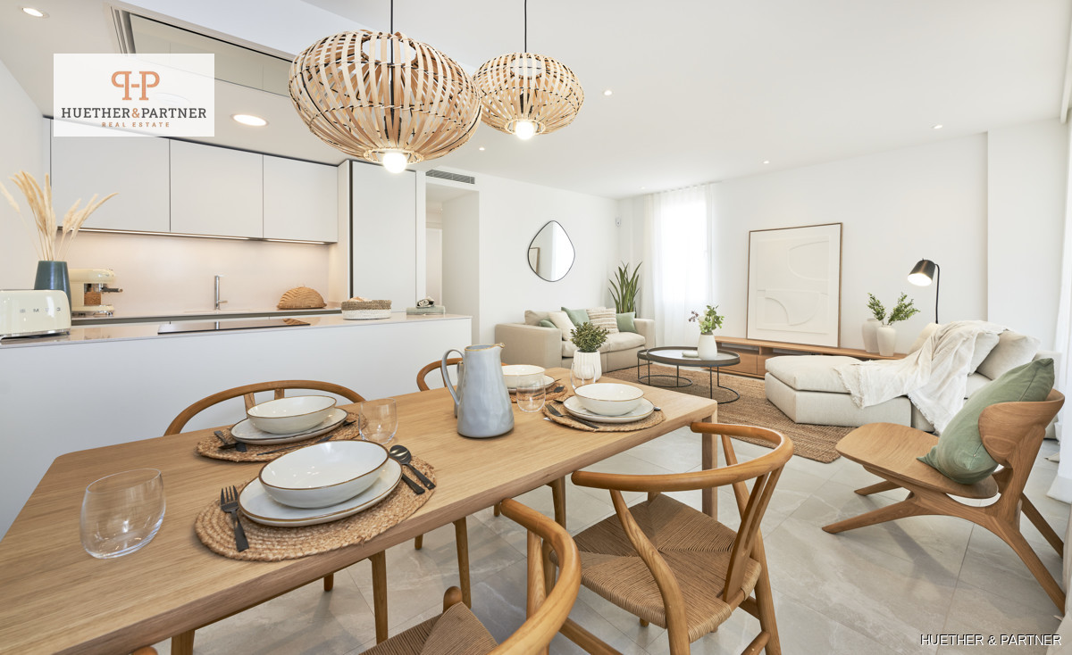 This new development in Cala dOr offers 36 avant-garde style apartments, featuring high-quality finishes and modern amenities. Each apartment includes a well-equipped kitchen with light-toned furnishings, induction cooktop, oven, and extractor. Bathrooms are fitted with wooden hanging washbasins, showers with flush trays, and Tres in-wall fixtures. Large porcelain tiles from Saloni cover the apartment floors and terraces, ensuring slip resistance outdoors.