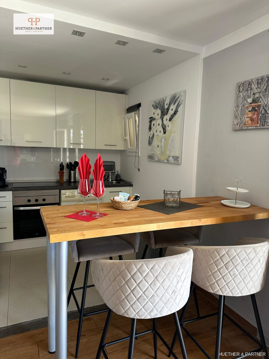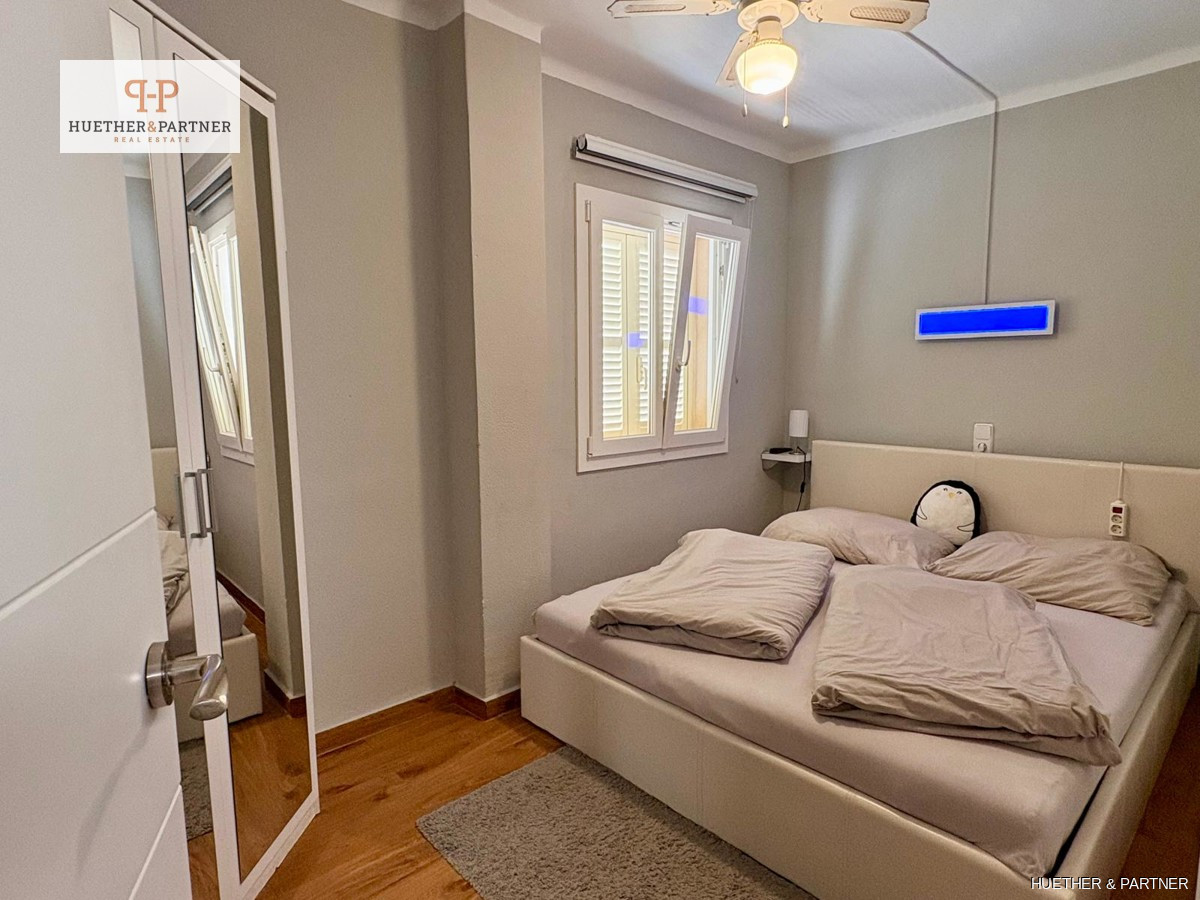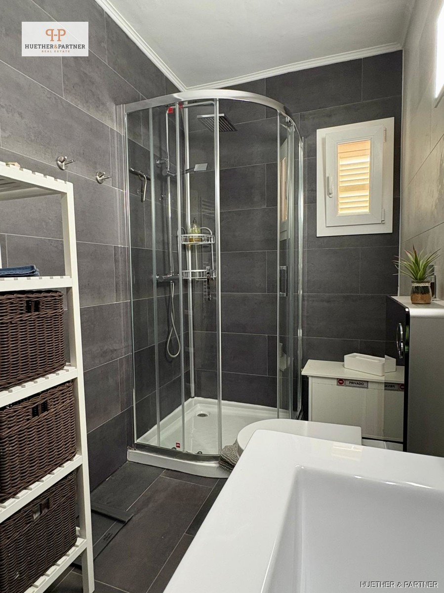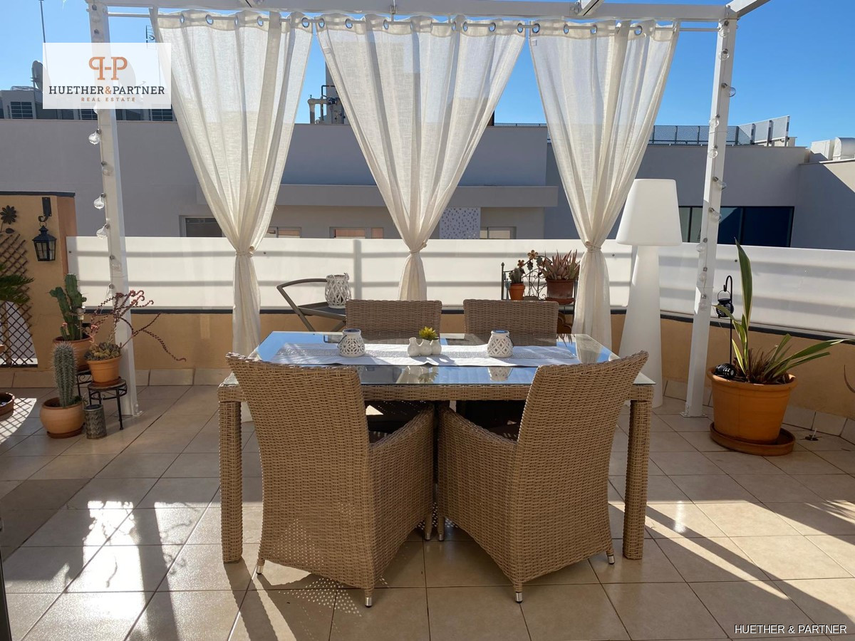 This charming penthouse, fully renovated and furnished, offers a spacious rooftop terrace, perfect for enjoying the Spanish sun. Located on the fourth and top floor, the apartment is easily accessible via stairs. It features a modern living-dining area leading to the large, southeast-facing terrace equipped with high-quality garden furniture, a pergola, and an outdoor shower.