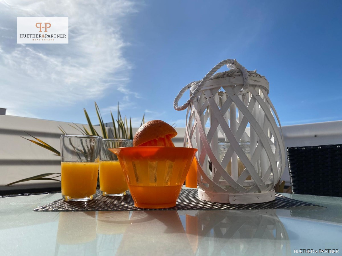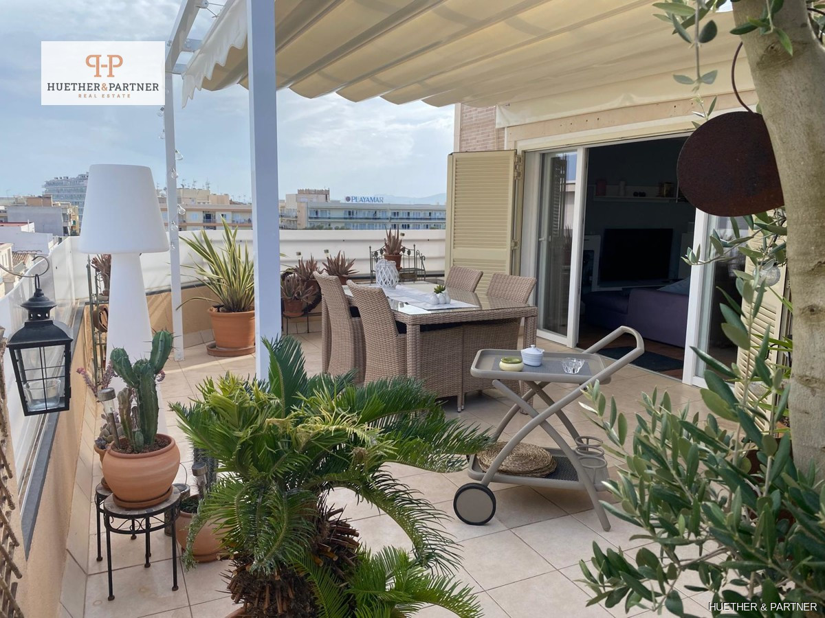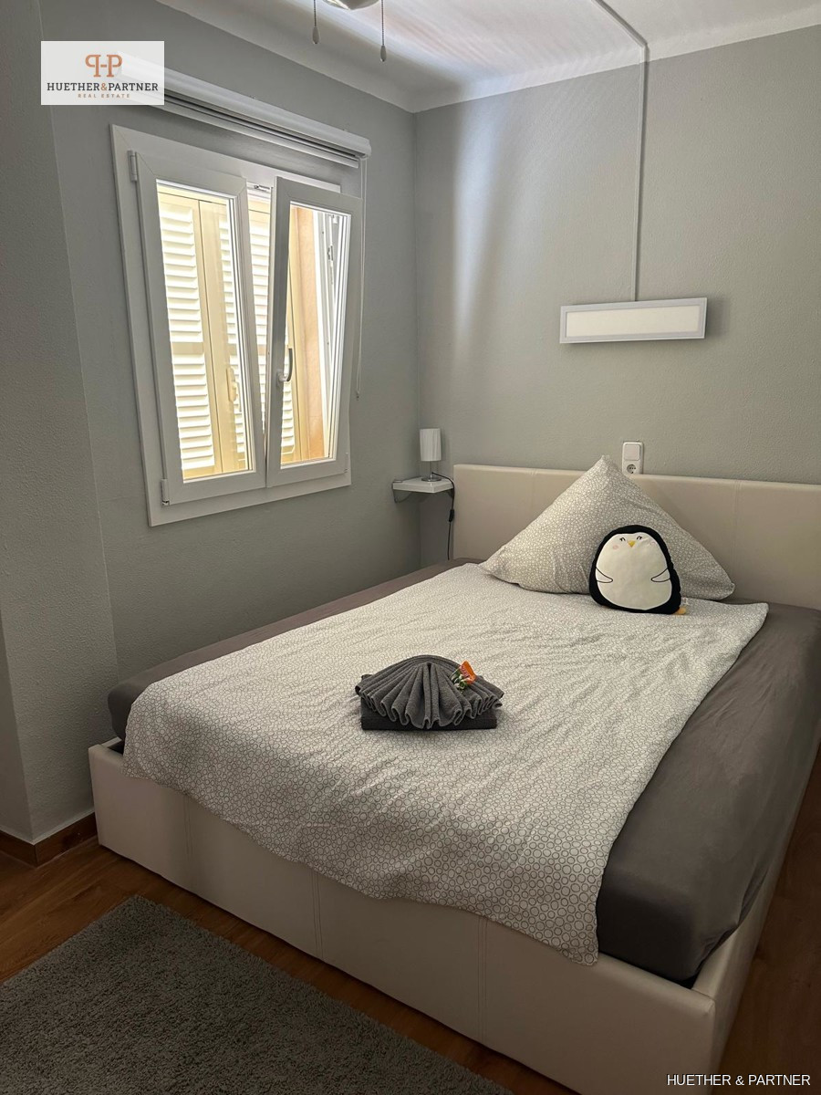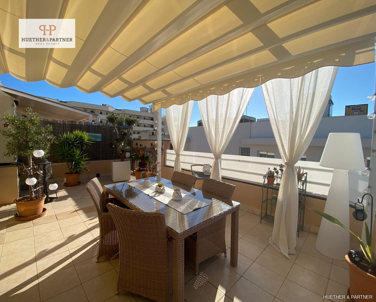 This charming penthouse, fully renovated and furnished, offers a spacious rooftop terrace, perfect for enjoying the Spanish sun. Located on the fourth and top floor, the apartment is easily accessible via stairs. It features a modern living-dining area leading to the large, southeast-facing terrace equipped with high-quality garden furniture, a pergola, and an outdoor shower.