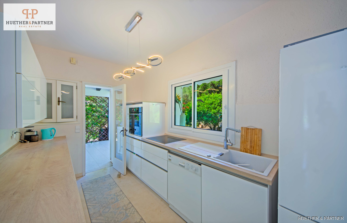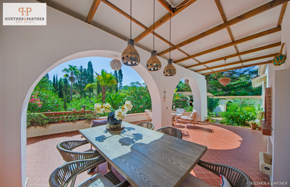 This elegant chalet, located near the bay of Cala Murada, offers a stunning view of nature from its expansive 3680 m² plot. The property features a spacious living area with a cozy living room complete with a fireplace, a modern kitchen, and a dining room leading to a covered terrace. Two double bedrooms, each with generous shower bathrooms, provide comfortable accommodations. A standout feature is the 48 m² mosaic-tiled pool, surrounded by lush gardens filled with Mediterranean plants, palm trees, and pines.