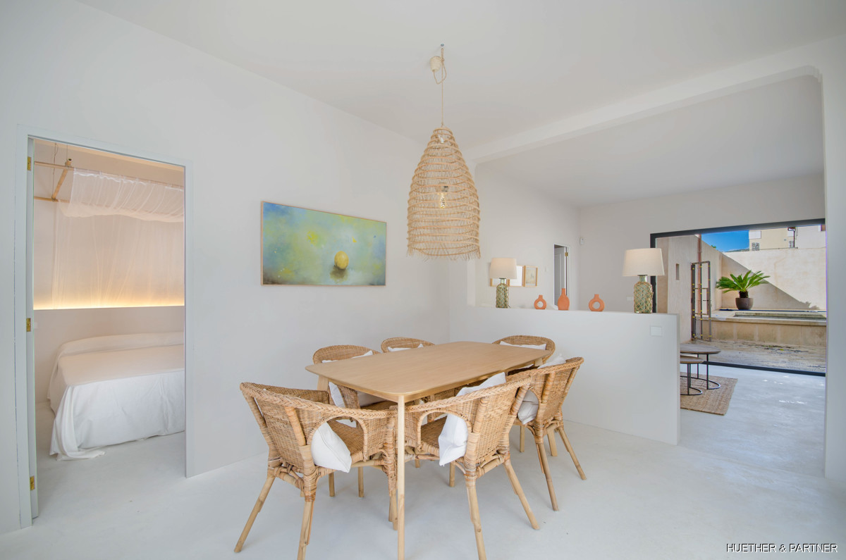 This beautifully renovated townhouse in Cala Ratjada combines modern design with traditional Mallorcan charm. The property features a spacious open-plan living and dining area, a fully equipped kitchen with appliances from Teka, beko, and Whirlpool, and a main house with three bedrooms, including one with an en-suite bathroom and dressing room. The home also includes underfloor heating and pre-installed centralized air conditioning. The guest apartment offers an additional bedroom and bathroom, accessible from the courtyard, which also hosts a private bodega.