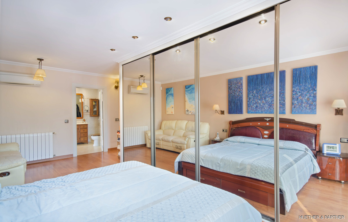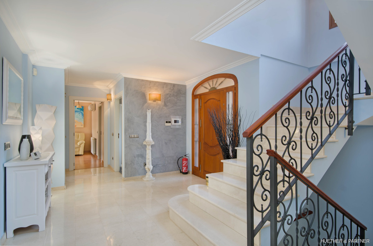 This expansive Marratxi family home spans 250m² and boasts a variety of luxurious features. Built in 2005 on an 800m² corner plot, the property includes a private saltwater pool, a modern alarm system, and individually controlled climate settings in every room. The house also offers a private underground garage, currently repurposed as a personal gym and storage area, alongside a carport and a welcoming entrance hall adorned with white marble flooring.