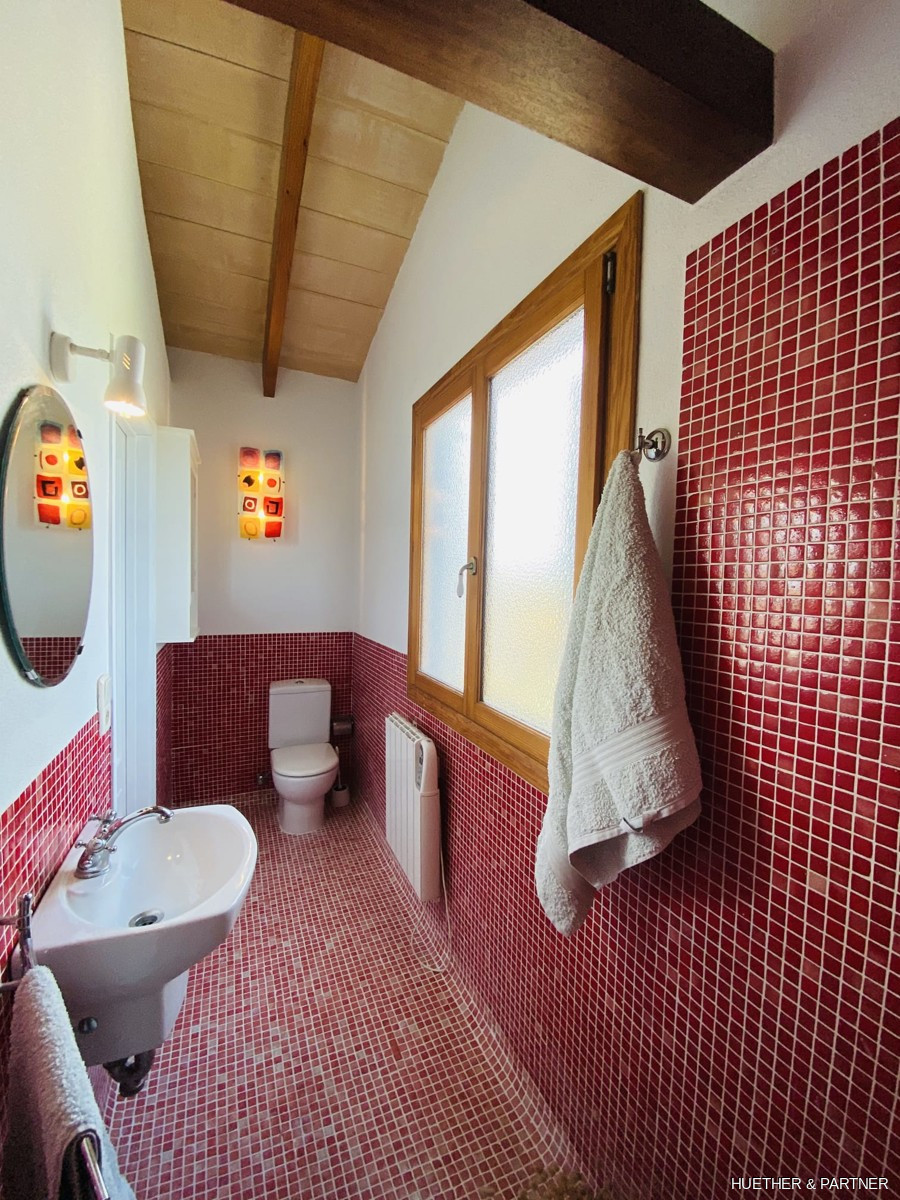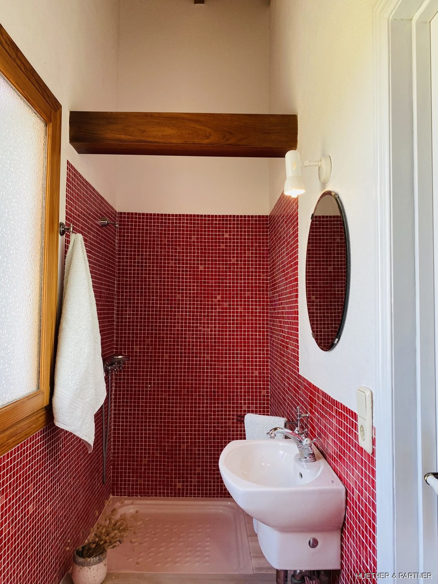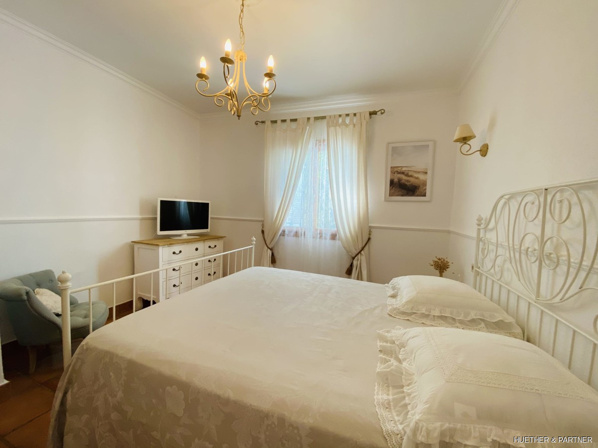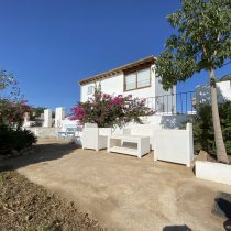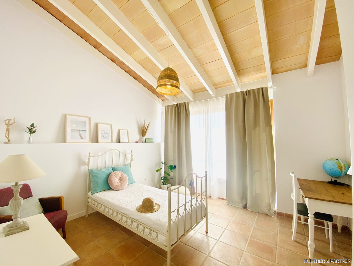 Upstairs, a stone-styled staircase leads to open spaces currently used as an office, with two bedrooms capable of fitting double beds. Large windows offer panoramic coastal views. One bedroom has a built-in wardrobe, and the other has a private dressing room, with a bathroom featuring a mosaic-tiled shower. The 14,464 m2 plot allows for pool construction, with the project pending approval, making it ideal for a small family seeking rural living with proximity to town and beaches.
