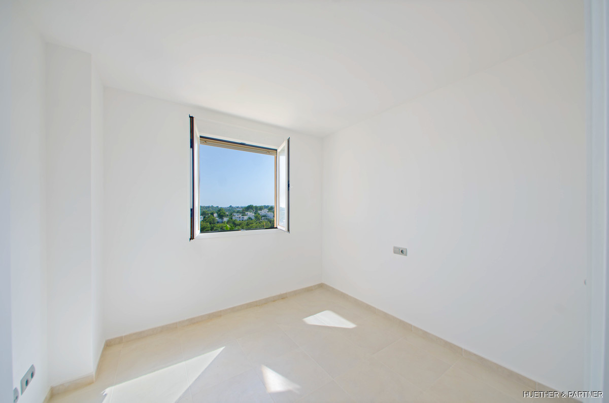 The apartment is offered unfurnished, providing a blank canvas for personalization. The building boasts aluminum shutters and doors, a lift, and a community pool that is exclusive to residents, ensuring privacy and security. Climate control is available but not yet connected, allowing for customization by the new owner.