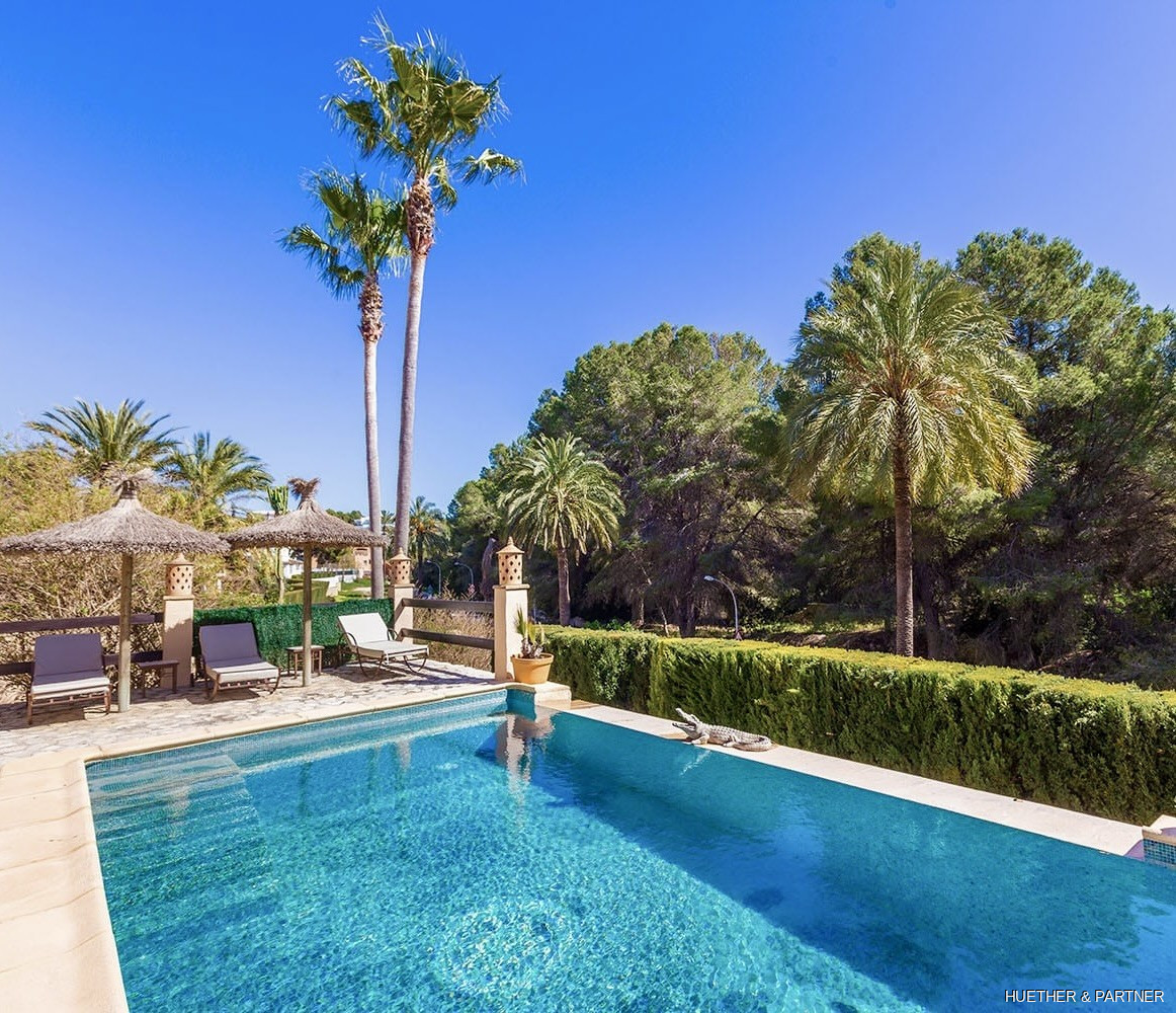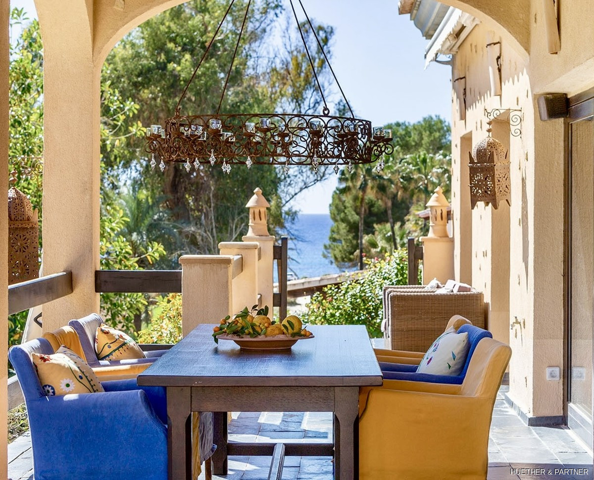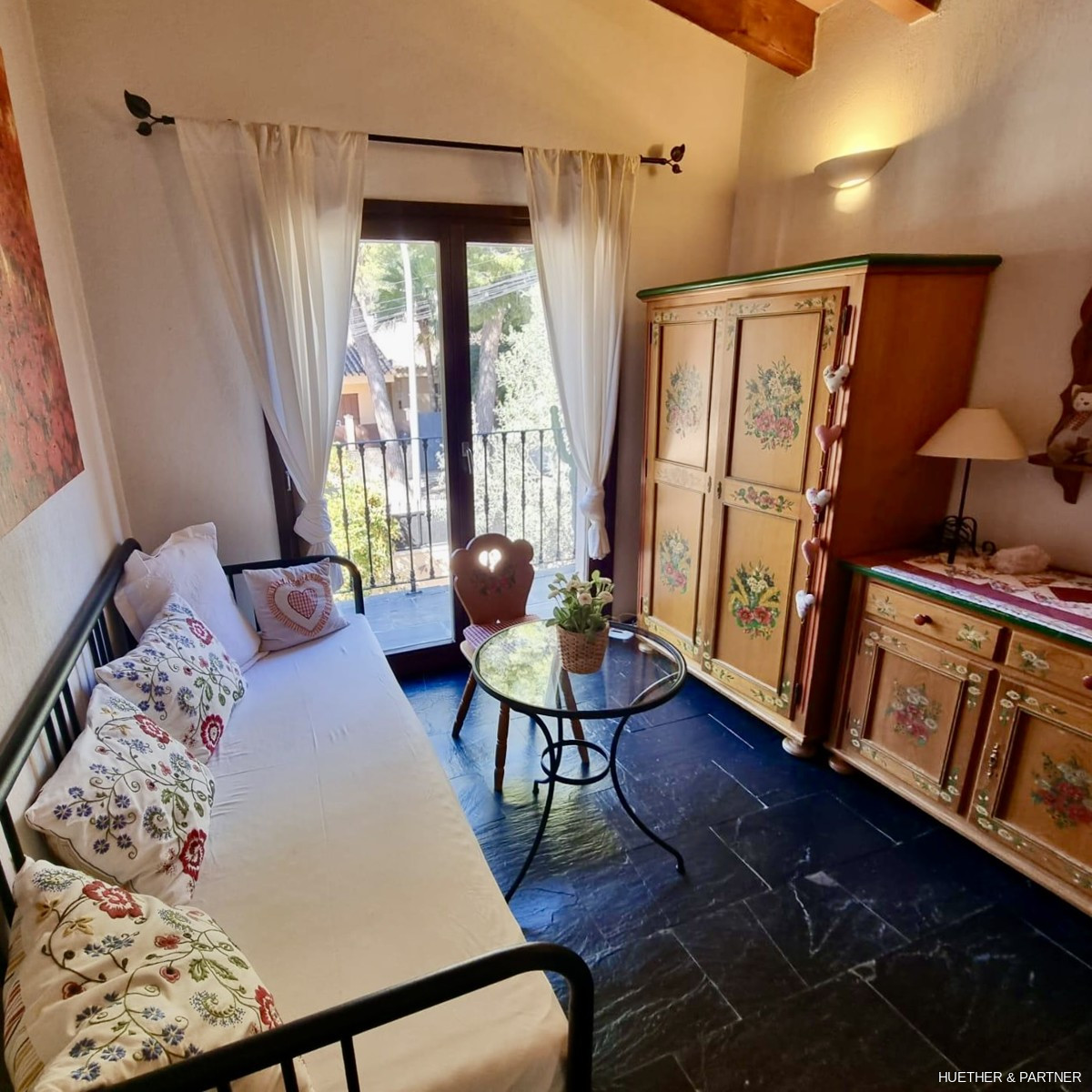 Experience luxury living in this south-facing villa located in a serene and exclusive neighborhood. The property boasts a double garage, state-of-the-art alarm system with cameras, and both indoor and outdoor pools. The interior features a high ceiling ranging from 3.25 to 4.50 meters, elegant slate flooring, and large built-in wardrobes offering ample storage. Comfort is ensured with underfloor heating, air conditioning, and a modern kitchen designed in the Mallorcan style. The villa also includes a guest apartment and direct access to the beach path, located just 100 meters from a secluded bay.