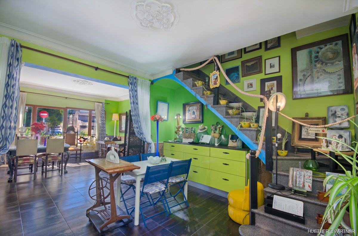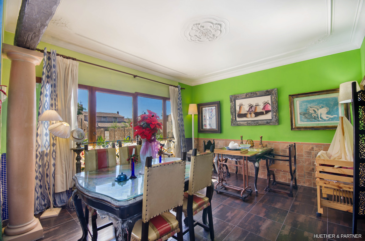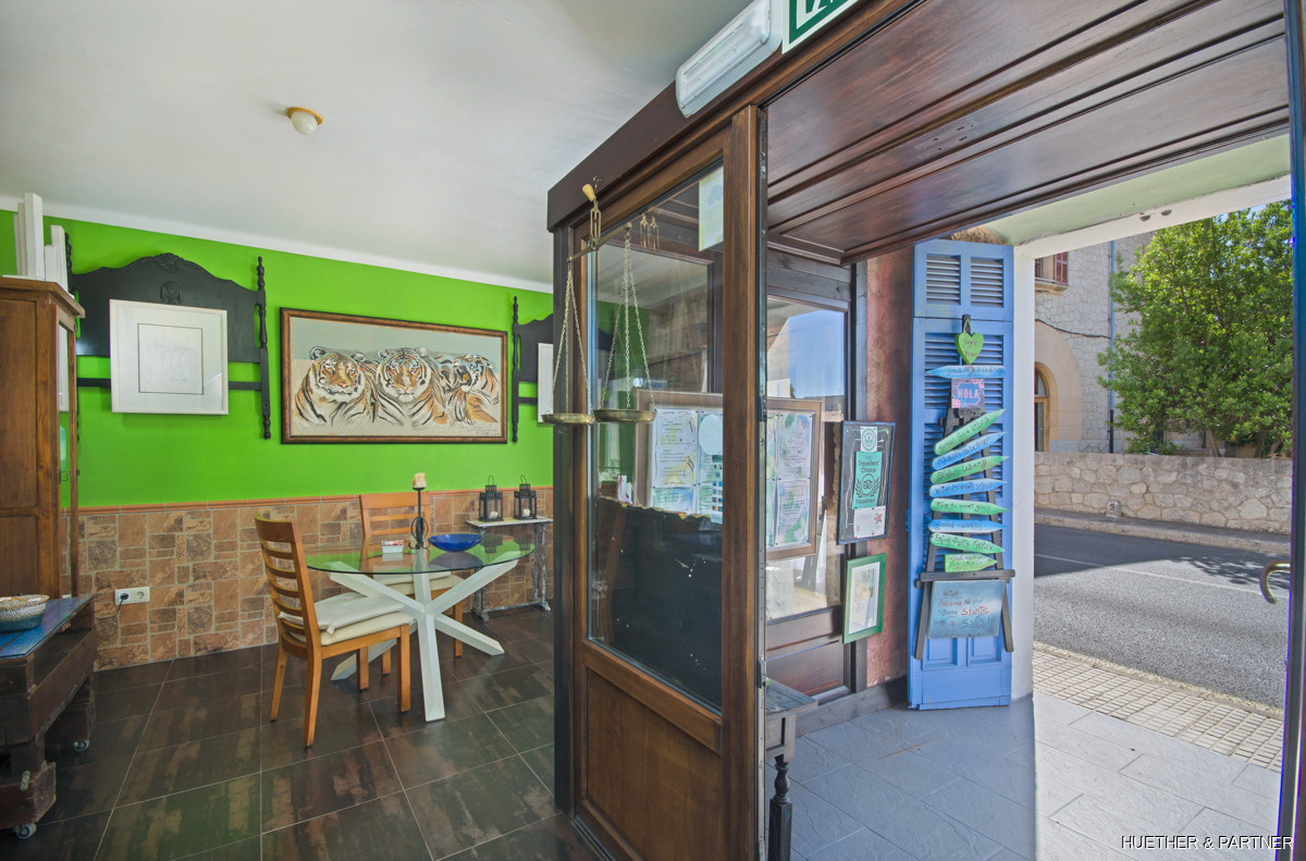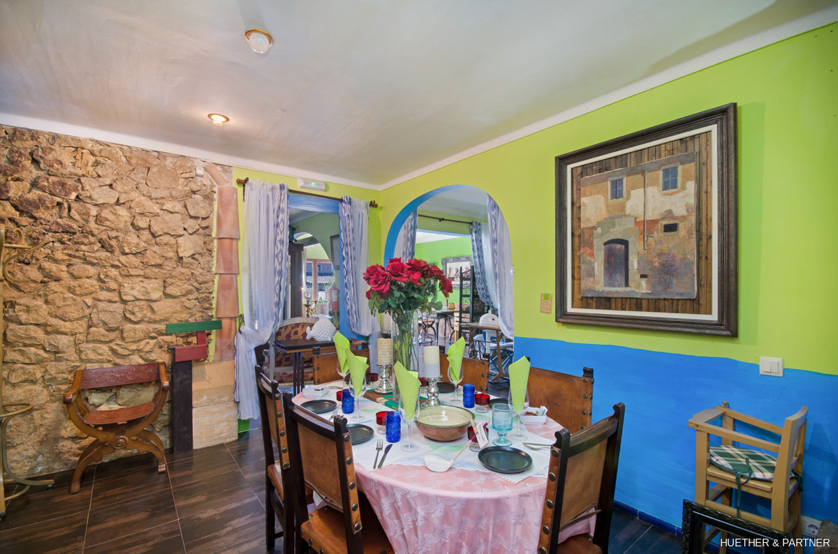 This centrally located townhouse in Sant Llorenc offers a unique opportunity combining residential and commercial use. The property features a restaurant area with a professional kitchen and a restaurant license. It includes two courtyards, a garden with a fountain and BBQ fireplace, and a spacious double garage. The house is fully furnished and equipped, except for art and personal items. The main building spans two floors without horizontal separation, functioning as both a restaurant and a residence. The upper floor contains private living spaces, while the ground floor has a dining area, open drink bar, and kitchen with stainless steel cabinets.