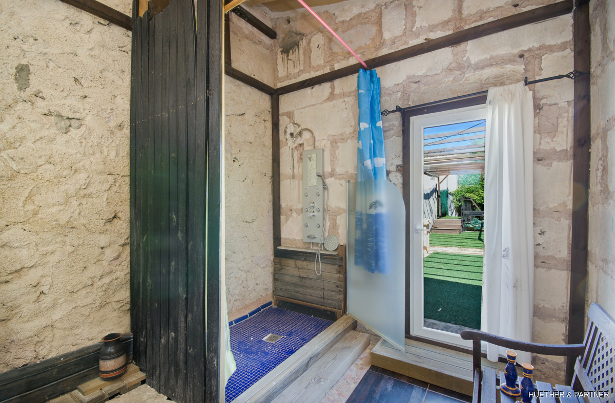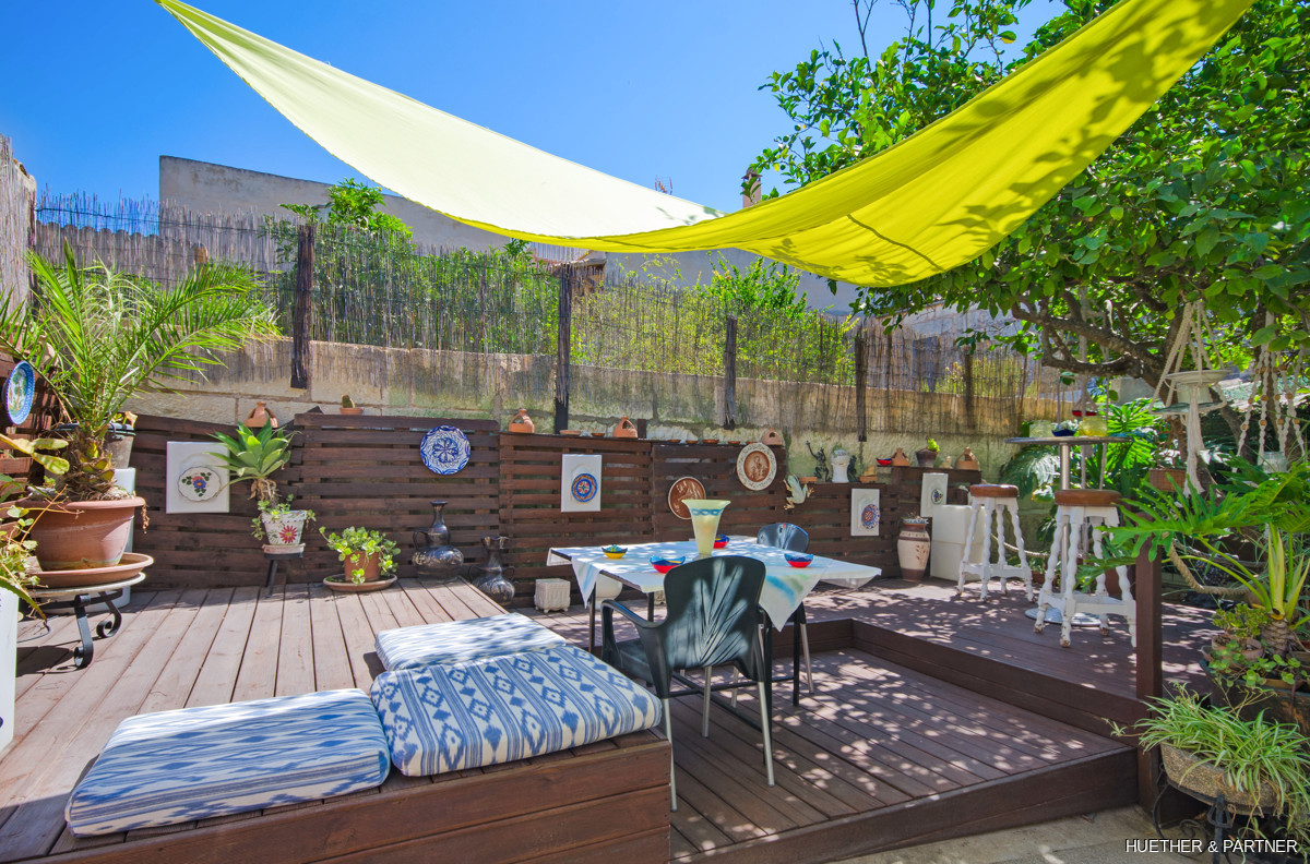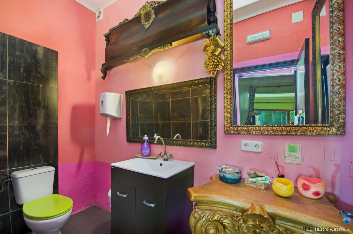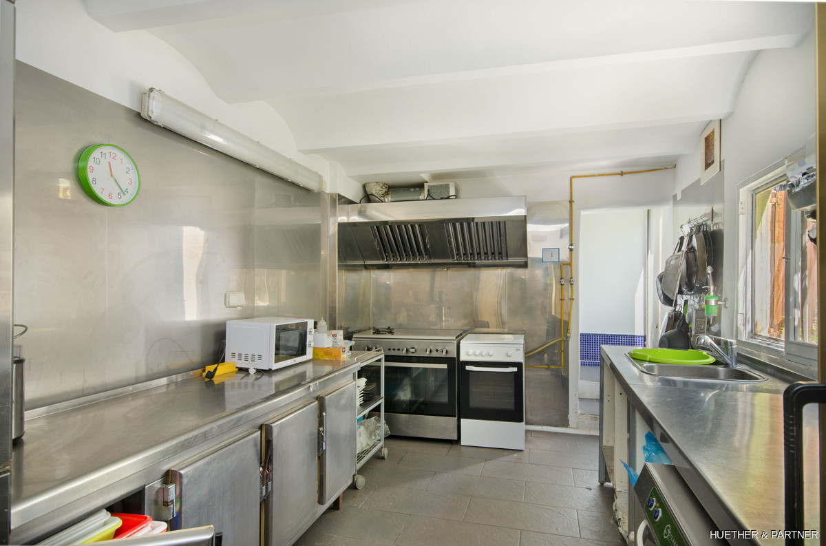 This centrally located townhouse in Sant Llorenc offers a unique opportunity combining residential and commercial use. The property features a restaurant area with a professional kitchen and a restaurant license. It includes two courtyards, a garden with a fountain and BBQ fireplace, and a spacious double garage. The house is fully furnished and equipped, except for art and personal items. The main building spans two floors without horizontal separation, functioning as both a restaurant and a residence. The upper floor contains private living spaces, while the ground floor has a dining area, open drink bar, and kitchen with stainless steel cabinets.