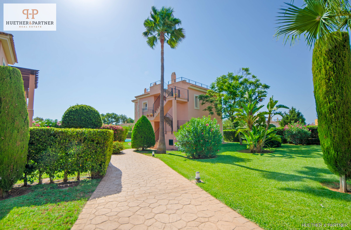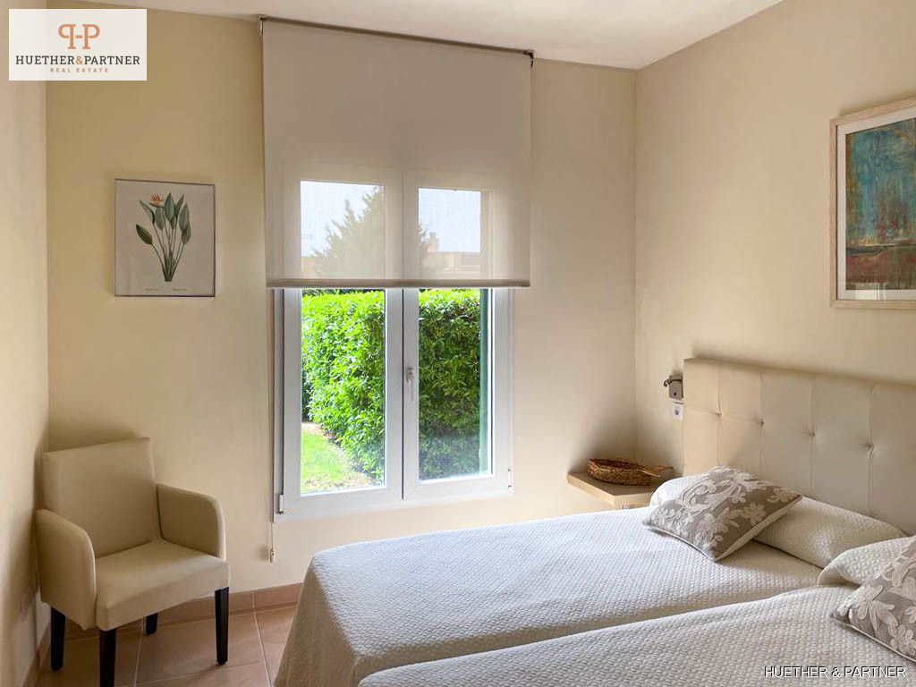 This ground floor apartment is part of a well-kept building with only two owners. It offers a private garden area and access to a communal pool. The property features modern security with a smartphone-enabled door opener and fly screens. The apartment is fully furnished except for personal and decorative items. It boasts two bedrooms, two bathrooms, an open kitchen, and a spacious living area. The south-facing terrace and private garden provide ample space for relaxation under the shade of palm trees.