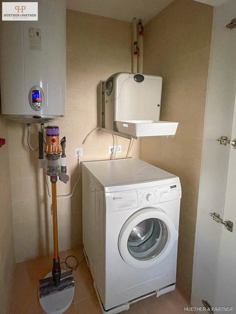 Parking is convenient with a public parking area in front of the entrance and a private space nearby, both under surveillance. Additional amenities include video-monitored parking, built-in wardrobes, and a separate washing machine area. The apartment is air-conditioned and equipped with CEE certification and Cedula, issued in 2024.